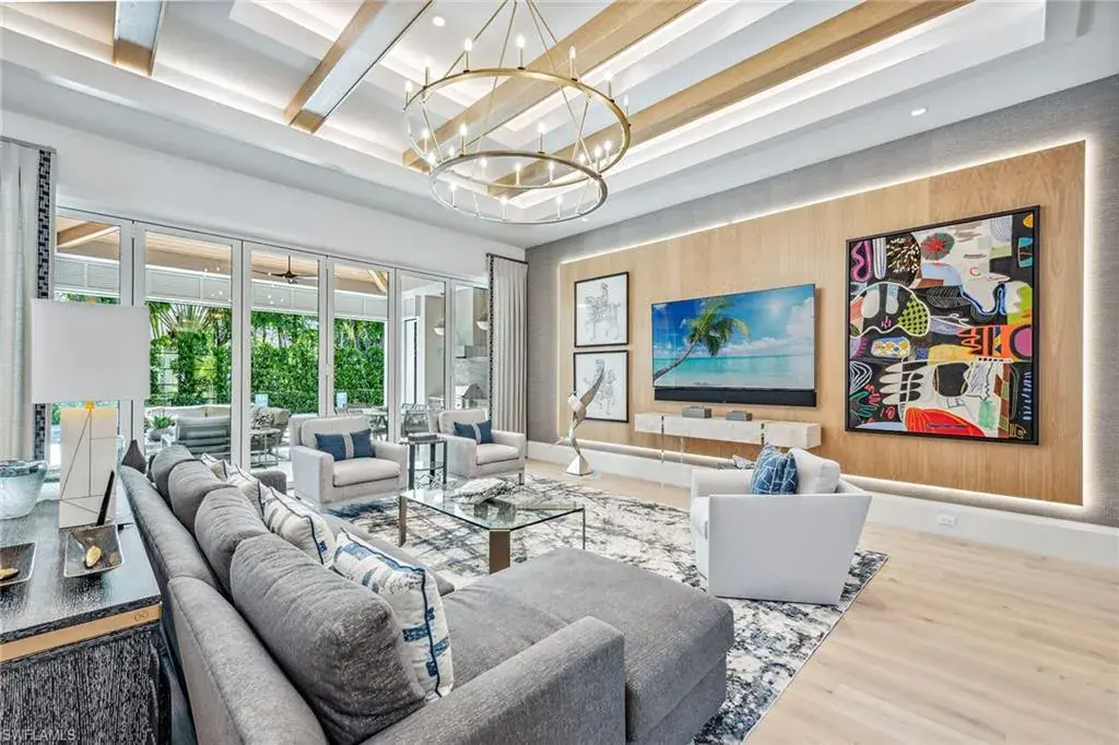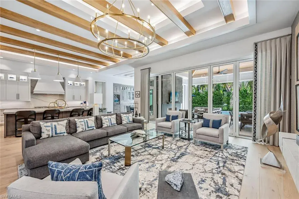 Welcome to coastal elegance at its finest. This stunning new home, completed in 2022 by distinguished Borelli Luxury Homes, has been meticulously designed and crafted, offering an unparalleled blend of sophistication and comfort. Every detail of this residence has been carefully selected by Jett & Company Interior Design, with high-quality furnishings, curated artwork, and accessories that complement the coastal-chic aesthetic. Step inside, and the grand foyer will make an instant first impression, while the expansive great room creates a refined yet inviting environment with its backlit feature wall and stunning ceiling details. The gourmet kitchen is a chef’s dream, with its luxurious finishes, a full suite of Sub-Zero and Wolf appliances with gas cooking, an exquisite bar, a walk-in service pantry, plus more. The expansive owner’s suite is a relaxing haven showcasing an opulent bedroom, two walk-in closets with custom built-ins, and a spa-like bath with marble finishes and dual water closets, while the three beautifully appointed guest bedrooms and study each feature ensuite baths and bespoke finishes. Entertainment and relaxation abound out back, where a sparkling pool and spa set the perfect backdrop for the home’s beautiful covered lanai featuring an outdoor fireplace, full summer kitchen, and gas firepit adjacent to the pool. Enjoy a short walk to the beach for famed Naples sunsets or available access to the private Moorings Beach Park. This home truly represents the pinnacle of coastal living.