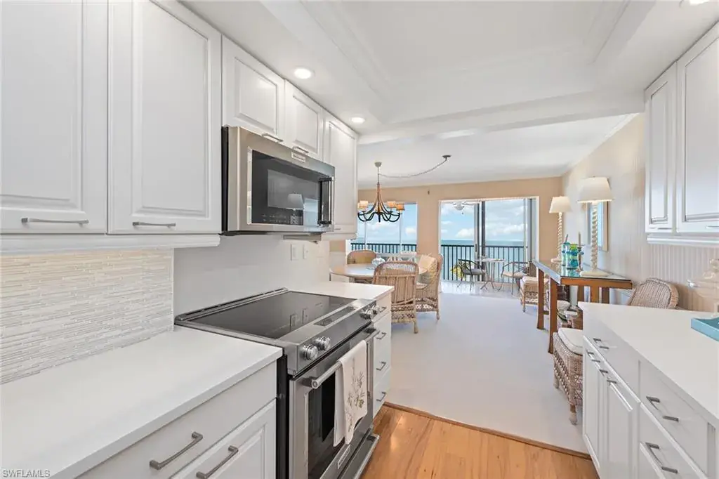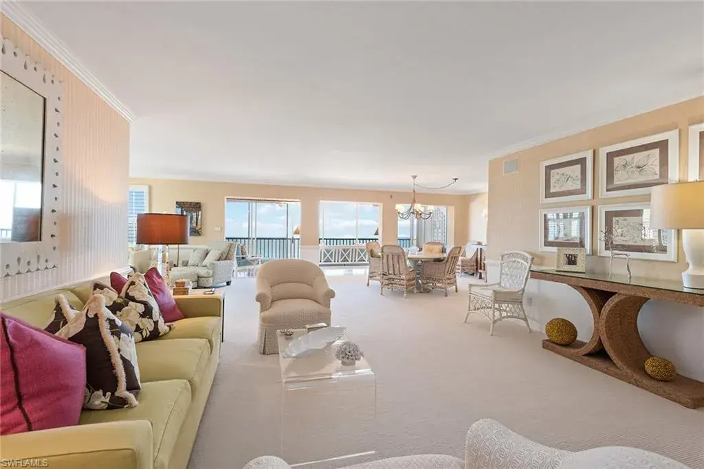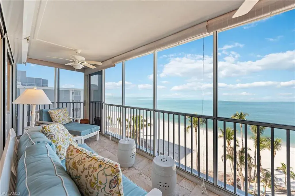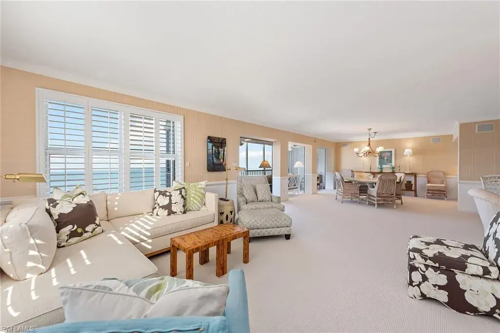 Glistening Gulf views await you in this stunning 7th-floor beachfront retreat at the Martinique Club in The Moorings. Watch the mesmerizing sunsets every evening from the comfort of your home. This well-maintained end-unit offers natural light from 3 sides, a large screened and enclosed balcony, plus a den that can easily be turned into a 3rd bedroom. The bedrooms also have beautiful views of the bay to watch the colorful sunrise. With crown molding, window coverings, in-unit laundry and plenty of storage, it is ready to move in and add your personal touches. Spend your days relaxing by the beachfront pool and walk a few steps to the white sandy beach. Being completely updated now is a social room with a full kitchen and grills. Owners enjoy one under-building parking space, extra storage room, bike storage and secure entry lobby. Pets and leasing are not allowed at Martinique Club offering you maximum privacy. This cooperative building has no land lease and a well-run association. After a day at the beach or pool, it’s only a short ride to the renowned shopping and dining at Venetian Village, 5th Avenue or 3rd Street South.