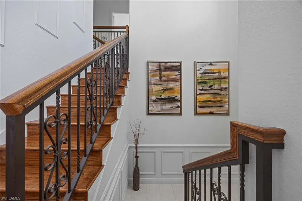 Welcome to beautiful Marengo in award-winning Fiddler’s Creek. An exceptional condominium with an expansive lanai and lovely lake view, this charming home gives a warm and sophisticated feeling. The courtyard entry opens to a foyer with decorative molding, which flows throughout the home. A stunning natural wood staircase with wood and iron railings leads to the spacious and open living area. The exceptional white tile is bright and welcoming with additional upgraded carpeting in all the bedrooms. This large condominium includes an open living area with an additional family room and breakfast nook or use it as an efficient office space. Room for your own creative impulses. Impact glass doors and windows provide an open and secure feeling throughout. The living and dining areas provide seamless access to the lanai through glass sliders overlooking a beautiful lake. This three-bedroom, three full-bath condominium lives like a single-family home with a split floor plan, each bedroom with an en suite and lots of privacy. All bedrooms have professional window treatments with oversized closets. The exceptional kitchen and family room enhance the style and comfort of this home. Crown molding at the ceiling, as well as decorative wall accents, add a polished touch. Light-colored, high-end Italian cabinetry and granite countertops and backsplash are a chef’s dream. This large kitchen with under-cabinet lighting, stainless steel appliances, gas cooktop range with a warming drawer and a large island is ideal for all your culinary needs. A new air-conditioning condenser coil, with Smart thermostat, has been added. Exceptional laundry room with sink and additional cabinetry. The addition of a new roof was recently added for the Marengo community. Fiddler’s Creek is one of Southwest Florida’s largest country club communities. Minutes from amenities of Marco Island and Old Naples, this area has everything needed for a winter escape. This beautiful community has an active Florida lifestyle, from pickleball to tennis to golf, and the famous club, spa and fitness center. The full-time social director keeps things moving year-round. Look at this exceptional residence in wonderful Fiddler’s Creek.