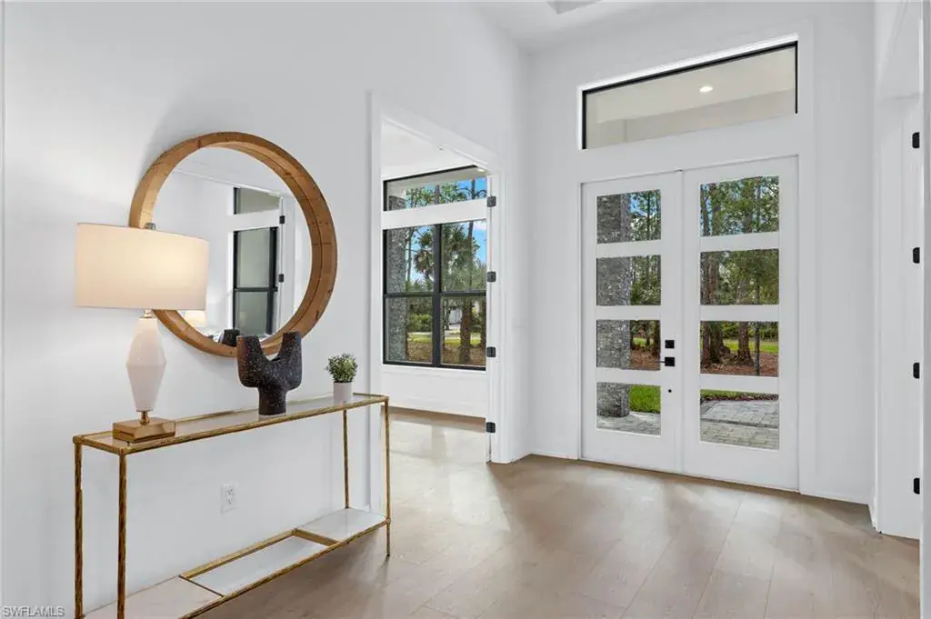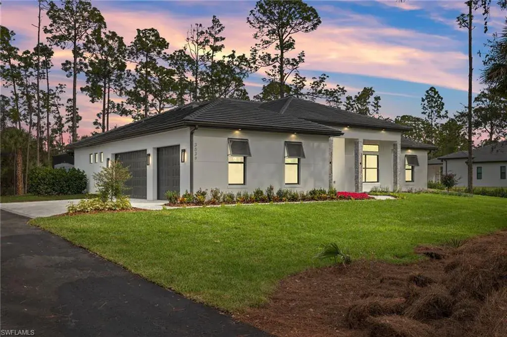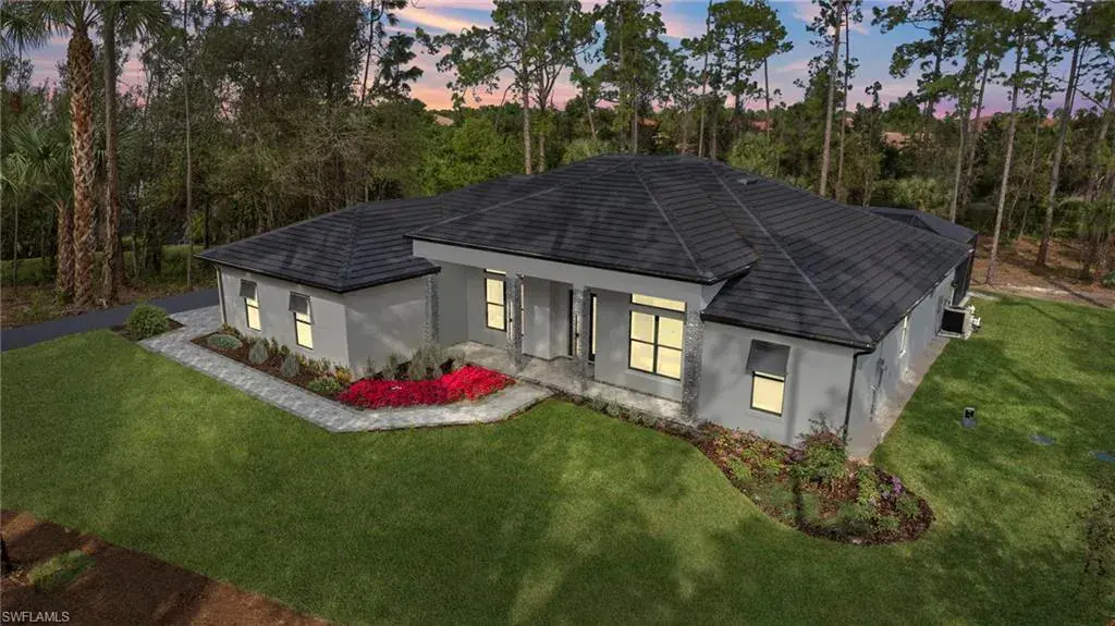 bedrooms+Den, 3 bath and 3 car garage. Enter through 10ft custom glass doors to the Great Room floor plan w/White Oak wood composite floors. Eat-in kitchen with quartz countertops w/waterfall edge, custom shaker cabinetry, blended into a special wood-feature oven hood w/Thermador Appliances. A Gym/Flex room w/volume ceilings, luxurious study, and Master Bedroom offering his/her walk-in closets, and tray ceiling. Lavish Master Bathroom, complete w/dual vanities, multiple shower-heads, and a free standing Soaker Tub. Walking outdoors through the picturesque impact resistant sliders and onto your covered Lanai, sits your custom salt water pool, containing a spacious sun deck for basking in the rich Naples sunshine. This new build will be sure to impress with its refined details, top-tier appliances, Smart Home Capability, & interior/exterior lifestyle – leaving nothing left to be desired. Delivered by Quarter 4 of 2023. Acreage Header is situated perfectly close to Founders Square and offers an excellent school district. No HOA!