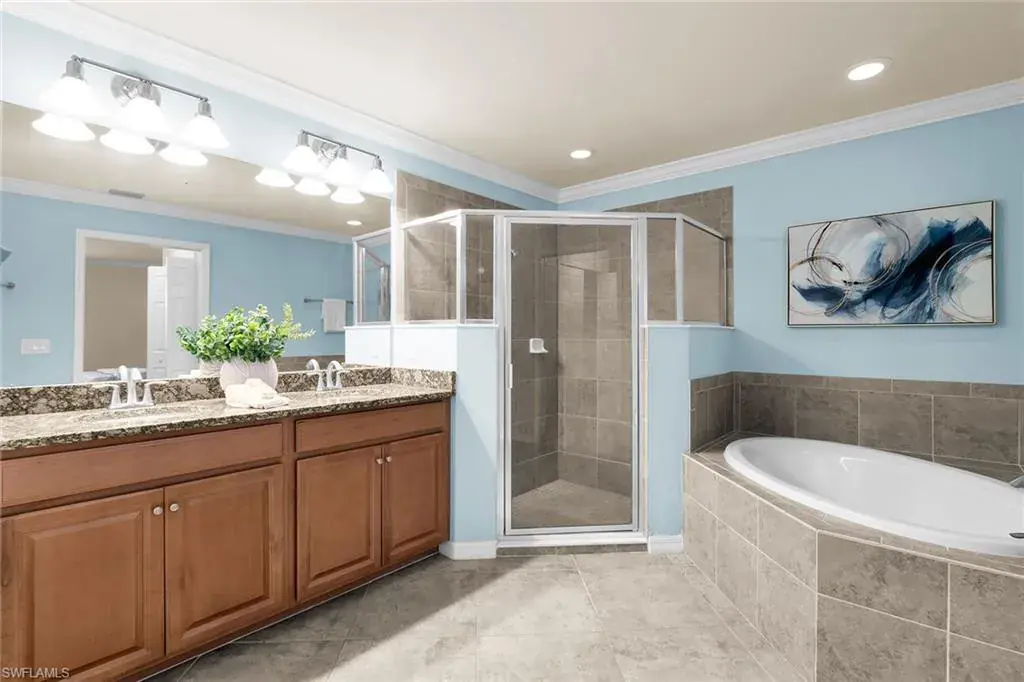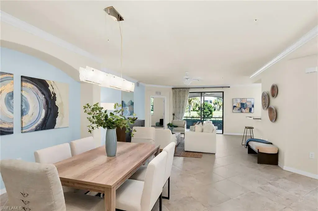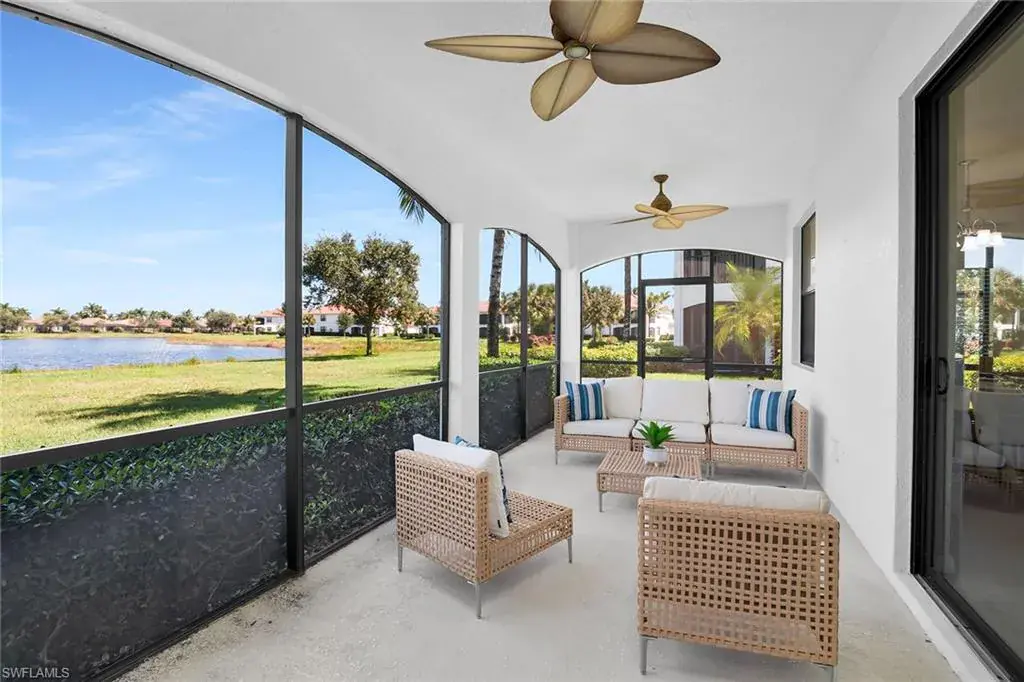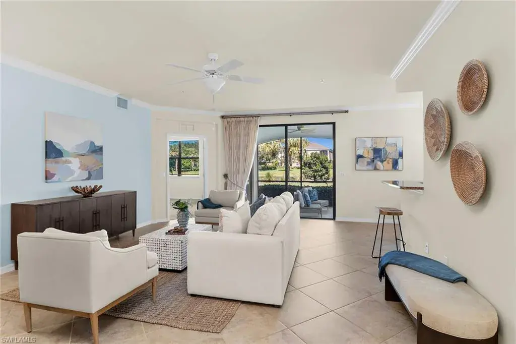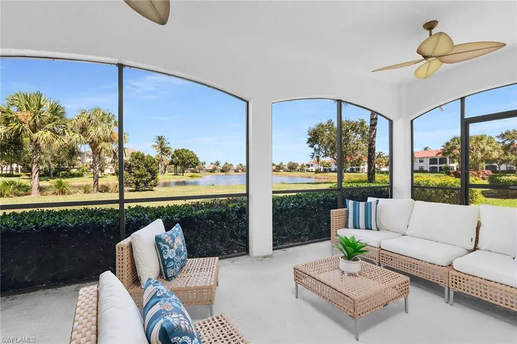 In the Village of Sonoma, enjoy a first-floor end-unit coach home with beautiful lake views in Sonoma Village. This three-bedroom residence is elegant and comfortable. The exterior includes a classic tile roof, impact doors and impact windows throughout, lush landscaping and a brick paver driveway leading to the two-car garage. Inside features include recessed lighting, crown molding, blinds and tile flooring on the diagonal in the living areas. The kitchen is equipped with stainless gas cooking appliances, granite countertops, a tile backsplash, pantry, breakfast bar and a dining area. The formal dining area and the spacious living room. The owner’s suite offers tranquil lake views, direct access to the lanai, two walk-in closets and an en-suite bath featuring a dual sink vanity, linen closet, deep soaking tub and a walk-in shower. The two guest bedrooms are in a separate and private area of the condominium. Additional features include a tankless water heater and extra storage closets. The living area overlooks and opens into the covered and oversized screened-in lanai, making it a great area to relax or entertain. Capital CDD paid in full. A life of luxury is ensured in this residence, enhanced by the 54,000-square-foot club and spa, full-service spa, fitness center complete with personal trainers and fitness classes, three swimming pools, championship golf courses, three bocce courts, and six tennis courts and 10 pickleball courts with competitive teams. Fiddler’s Creek is close to Marco Island Executive Airport, beaches, shopping, restaurants, boating and easy access to Naples 5th Avenue.