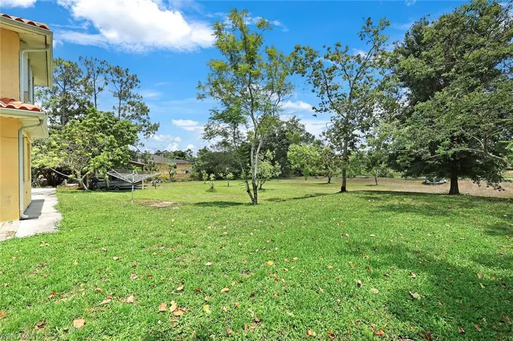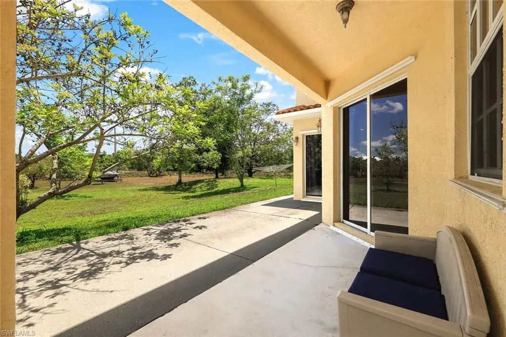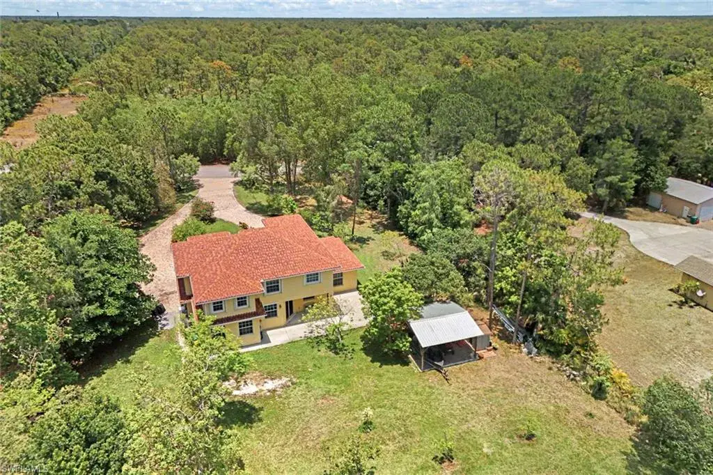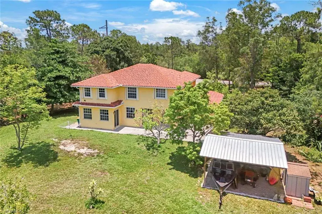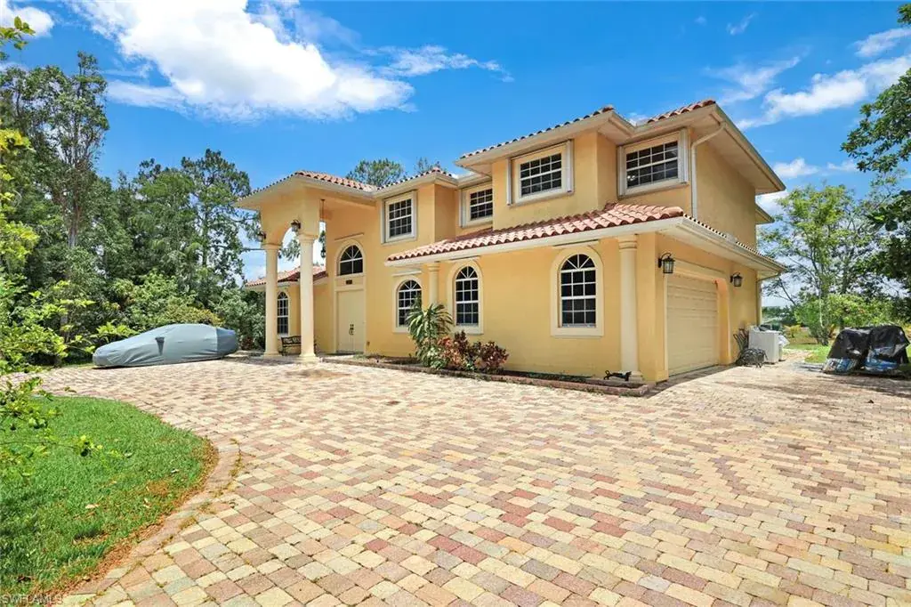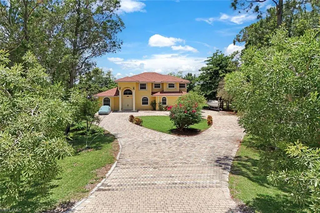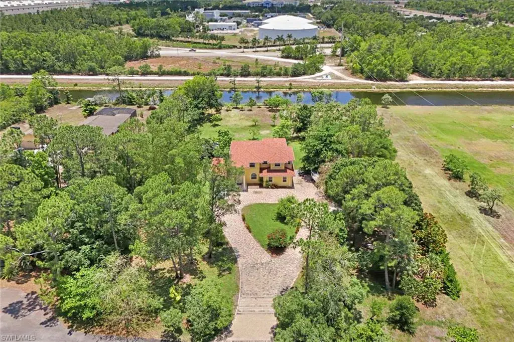 Large Estate in the Heart of Naples | This two-story residence sits on nearly three acres of land (100% Uplands); which includes over 240 feet of canal water frontage for those who enjoy boating or fishing. Upon arrival you are greeted by a large circular driveway (5,000+ sq. ft. of brick pavers) surrounded by numerous types of trees and fruit plants, including: mango, coconut, lemon, avocado, tangerine, tamarind, plum (ciruela), almond, guaba, eucalyptus, and tabebuia trees. As you enter the double-door front entrance you are in the grand foyer with an iron, wood, and travertine spiral staircase, the family room and formal dining area to your left and den/office to your right. The entire first floor features french pattern travertine flooring, 9′ 9″ ceilings, and crown molding. The kitchen has plenty of storage and granite countertop space, stainless steel appliances, and is perfectly located between the dining area and eat-in breakfast area. There is a walk-in pantry with wood shelving. There are plenty of windows to let in as much light as you want. The living room is spacious and perfect for entertaining. There is easy access to a full bathroom from the living room. The laundry room is large, with granite countertops, plenty of storage space and a sink. You can also access the garage from this hallway. The floor has epoxy coating and for those who like to work in the garage, and outside, you will love the half-bath inside the garage. As we go upstairs, there is a common sitting area that allows access to the master bedroom and bath, an ensuite, two additional bedrooms, and a full bathroom. The master easily allows for a king bed, nightstands, and chest. There is a walk-in closet and the bathroom has double sinks, a shower, and a jetted tub. The ensuite has a walk-in closet and an attached bathroom with gorgeous travertine shower walls. Two additional guest bedrooms share a full bathroom with dual sinks. The upstairs area also includes crown molding. As we head back outside there is over 700 sq. ft. of concrete padding to set up your dream outdoor entertainment area. The front and rear irrigation is sourced from the canal with a pump system inside a shed, for protection from the rain and sun. You also will love the covered concrete pad for additional storage. There are two HVAC systems for downstairs and upstairs as well as a tankless water-heater. The ground-level windows have manual hurricane protection and the upstairs windows have accordion shutters. All of this can be yours within the very peaceful and private Safe Harbor gates. There are only nine lots, eight homes, that were carved out of the surrounding Golden Gate Estates lots. Every lot here is over two acres and this property is the largest one! This is the lowest priced home in Collier County on over 2.75 acres, with over 3,200 sq. ft. of living area, west of Wilson Blvd.