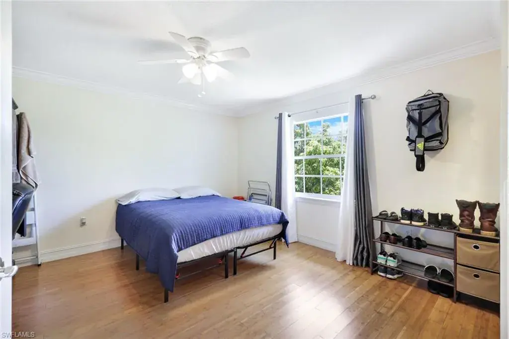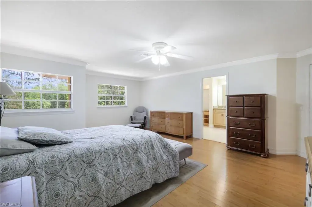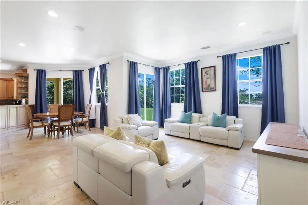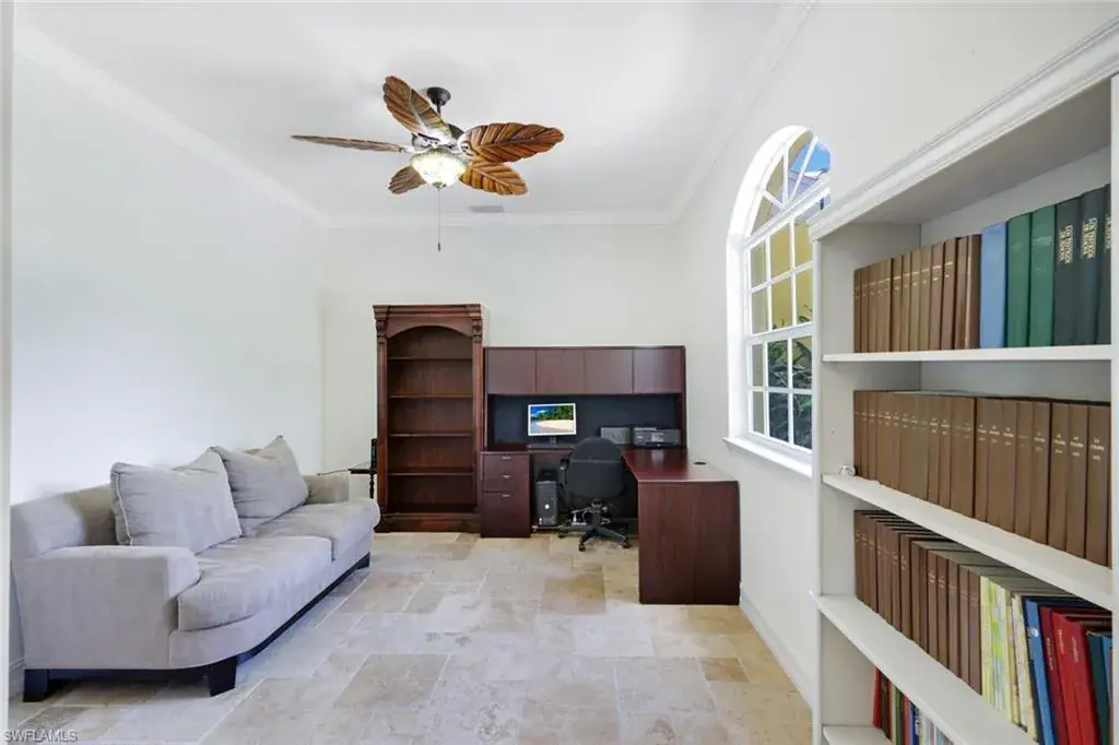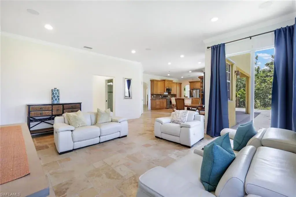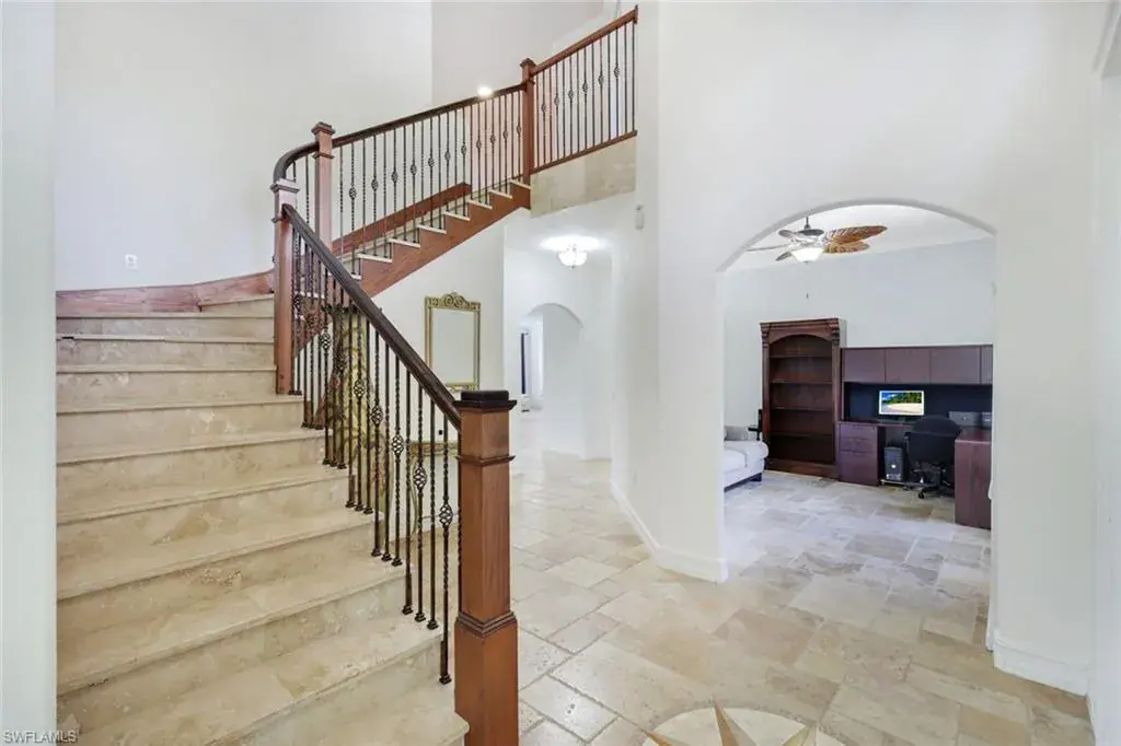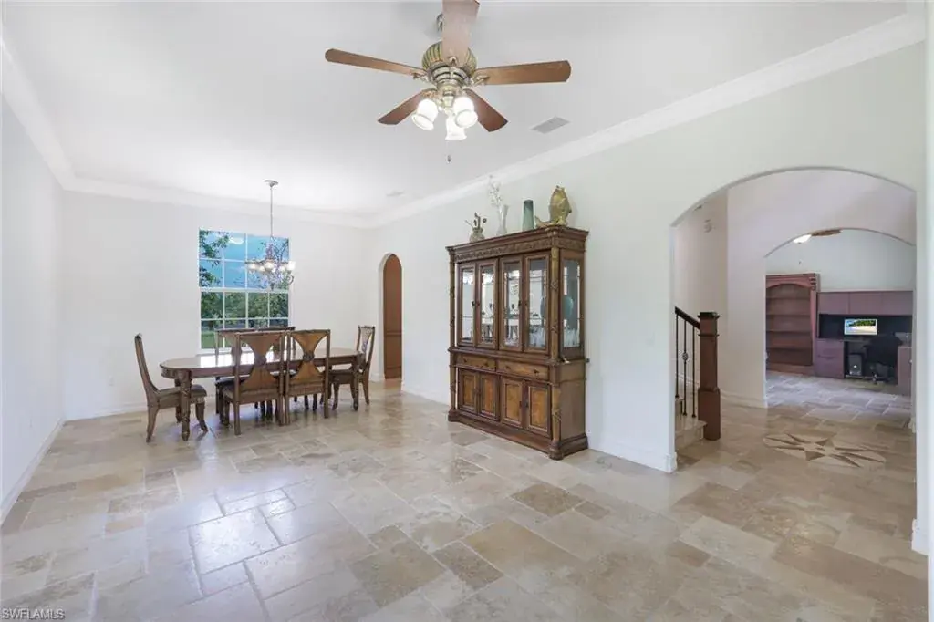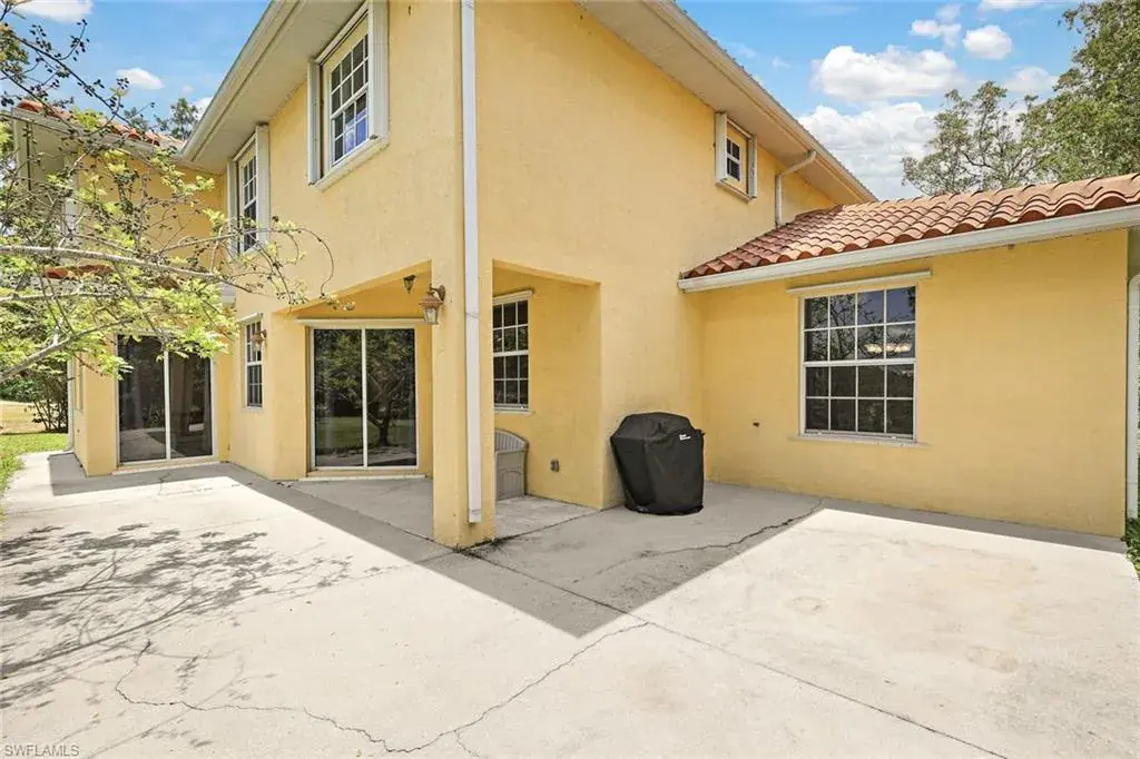 Large Estate in the Heart of Naples | This two-story residence sits on nearly three acres of land (100% Uplands); which includes over 240 feet of canal water frontage for those who enjoy boating or fishing. Upon arrival you are greeted by a large circular driveway (5,000+ sq. ft. of brick pavers) surrounded by numerous types of trees and fruit plants, including: mango, coconut, lemon, avocado, tangerine, tamarind, plum (ciruela), almond, guaba, eucalyptus, and tabebuia trees. As you enter the double-door front entrance you are in the grand foyer with an iron, wood, and travertine spiral staircase, the family room and formal dining area to your left and den/office to your right. The entire first floor features french pattern travertine flooring, 9′ 9″ ceilings, and crown molding. The kitchen has plenty of storage and granite countertop space, stainless steel appliances, and is perfectly located between the dining area and eat-in breakfast area. There is a walk-in pantry with wood shelving. There are plenty of windows to let in as much light as you want. The living room is spacious and perfect for entertaining. There is easy access to a full bathroom from the living room. The laundry room is large, with granite countertops, plenty of storage space and a sink. You can also access the garage from this hallway. The floor has epoxy coating and for those who like to work in the garage, and outside, you will love the half-bath inside the garage. As we go upstairs, there is a common sitting area that allows access to the master bedroom and bath, an ensuite, two additional bedrooms, and a full bathroom. The master easily allows for a king bed, nightstands, and chest. There is a walk-in closet and the bathroom has double sinks, a shower, and a jetted tub. The ensuite has a walk-in closet and an attached bathroom with gorgeous travertine shower walls. Two additional guest bedrooms share a full bathroom with dual sinks. The upstairs area also includes crown molding. As we head back outside there is over 700 sq. ft. of concrete padding to set up your dream outdoor entertainment area. The front and rear irrigation is sourced from the canal with a pump system inside a shed, for protection from the rain and sun. You also will love the covered concrete pad for additional storage. There are two HVAC systems for downstairs and upstairs as well as a tankless water-heater. The ground-level windows have manual hurricane protection and the upstairs windows have accordion shutters. All of this can be yours within the very peaceful and private Safe Harbor gates. There are only nine lots, eight homes, that were carved out of the surrounding Golden Gate Estates lots. Every lot here is over two acres and this property is the largest one! This is the lowest priced home in Collier County on over 2.75 acres, with over 3,200 sq. ft. of living area, west of Wilson Blvd.