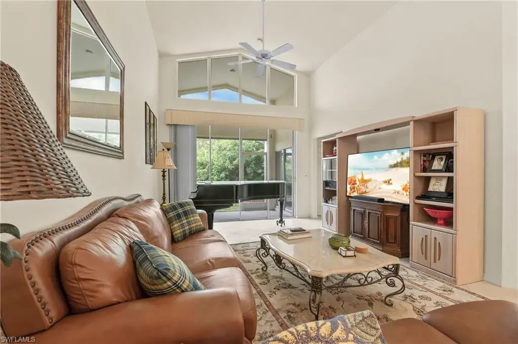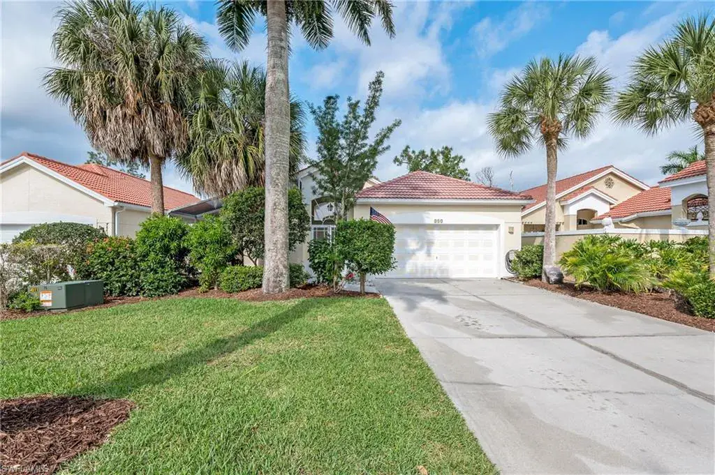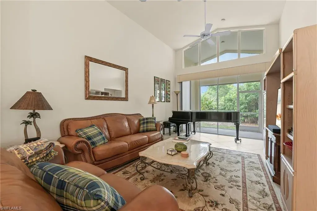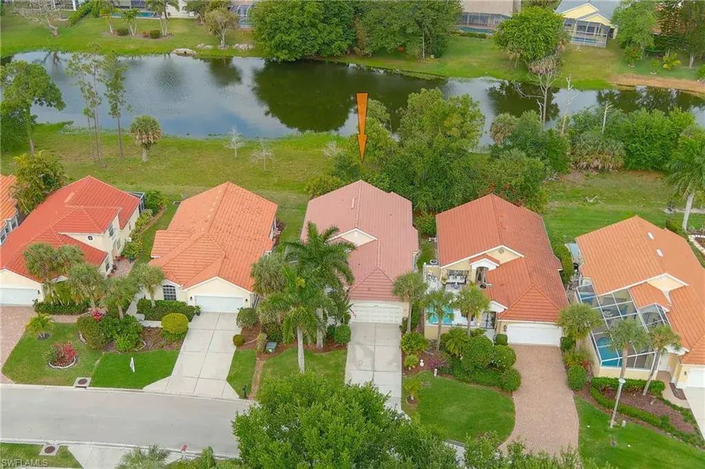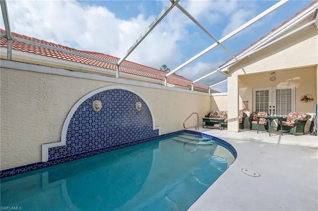 Just listed WATERFRONT home with courtyard pool. Sits on a natural lake where you will enjoy an array of wildlife. TURNKEY FURNISHED home! Light & bright with 3 bedrooms, formal dining room, eat-in kitchen with granite countertops and tile backsplash plus a breakfast bar. Spacious living room with soaring ceilings. Lots of natural light and vaulted ceilings for that airy feel. Master suite with beautiful pool view, double sinks, separate tub & shower, nice walk-in closet. 3rd bedroom with French Doors (currently is being used as an office). Screened in lanai is perfect to relax with a cup of coffee or glass of wine. Hurricane shutters. Very low HOA fees ($166/month) include lawn care, community pool, hot tub, clubhouse, tennis and pickleball courts. All just a few steps away. This home is conveniently located only 15 minutes away from white sandy beaches, Naples Pier, 5th Ave, Downtown Naples with lots of fun and activities.