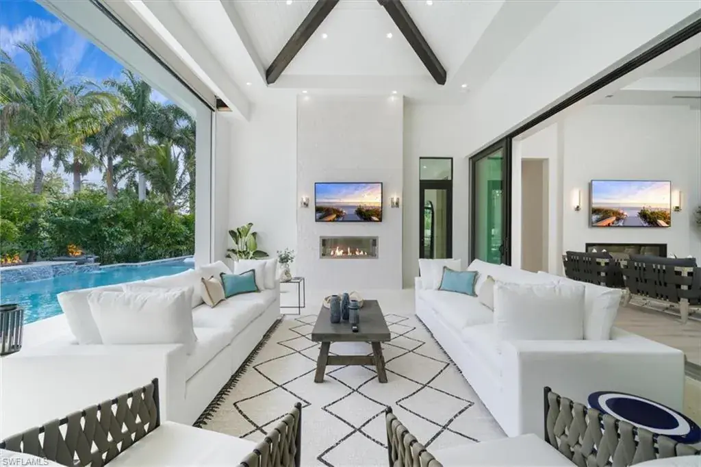 Experience unparalleled, luxury living in this recently completed new construction residence. Crafted by Falconer Jones, designed by award-winning Design West, and furnished by Arhaus, the expansive property with southern exposure is nestled on an oversized lot in the highly sought-after Moorings community. Spanning 5,000 square feet, all on ONE LEVEL, this home is the epitome of luxury Florida living, featuring lush landscaping and soaring ceilings reaching over 15 feet. Step into the grand entrance and be captivated by the seamless blend of indoor and outdoor spaces, perfect for entertaining with a Sonos sound system setting the ambiance. The chef’s kitchen is a culinary masterpiece, equipped with Subzero and Wolf appliances, custom walnut cabinetry, and a striking waterfall island. Five spacious bedrooms, each with ensuite bathrooms, ensure comfort and sophistication, while the stunning great room provides an inviting space for relaxation. Outside, indulge in resort-style living with a 50-foot pool, outdoor kitchen and dining area, fire pit, and covered lounge with fireplace, ideal for gatherings and unwinding in style. This home is not just luxurious but practical too, with a Lutron lighting system, security cameras, automated roll-down screens, generator, and hurricane impact doors and windows. As a cherry on top, eligibility for Moorings Beach Club membership elevates the allure of this exceptional property. Don’t miss your chance to own a piece of paradise in one of Naples’ most prestigious neighborhoods.
