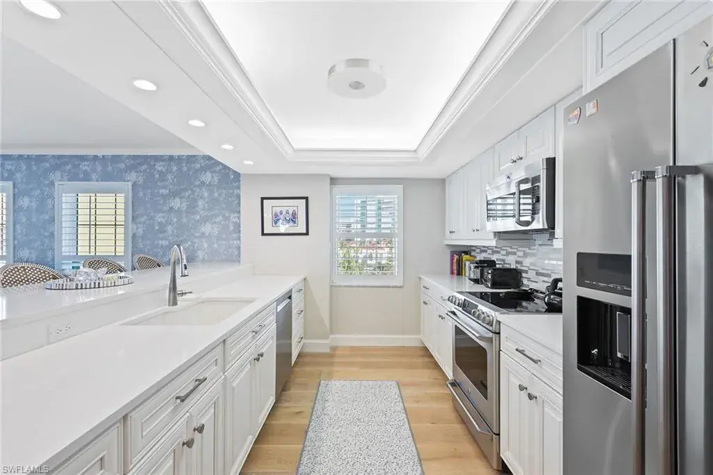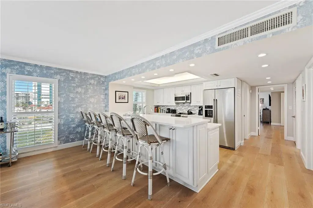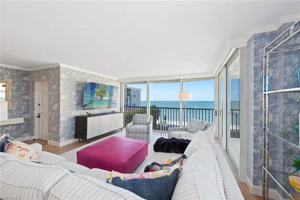 Incredible direct west views of the Gulf await you in this remodeled home in The Moorings. Wake up to the sunrise every morning, and enjoy the colorful sunset every evening while listening to the relaxing sounds of the ocean. Boasting an open kitchen, expanded living area, electric shades, stunning wood-plank flooring, and so many extra details, you won’t hesitate to show it off! The bright kitchen features a breakfast bar, quartz countertops, stainless steel appliances, and beautiful tile backsplash to tie it all together. This peaceful paradise has an extra office alcove in the master suite with built-in storage, along with dual sinks and showerheads, under-cabinet lighting, and large walk-in closet. Located directly on the beach, St. Croix Club is a 36-unit condominium split in 3 buildings, with only 2 units per floor, so plenty of natural light on 3 sides. Be the first to experience the newest beachfront amenities being completed this year: brand-new pool with extended deck, pergolas, and social area. Owners have peace of mind with secured entry and under-building parking and storage room. For the active lifestyle, there’s a bike and jog path, and also on-site is a bike storage room and racks for a kayak or paddleboard. Just a short walk down the street is the renowned shopping and dining at Venetian Village.