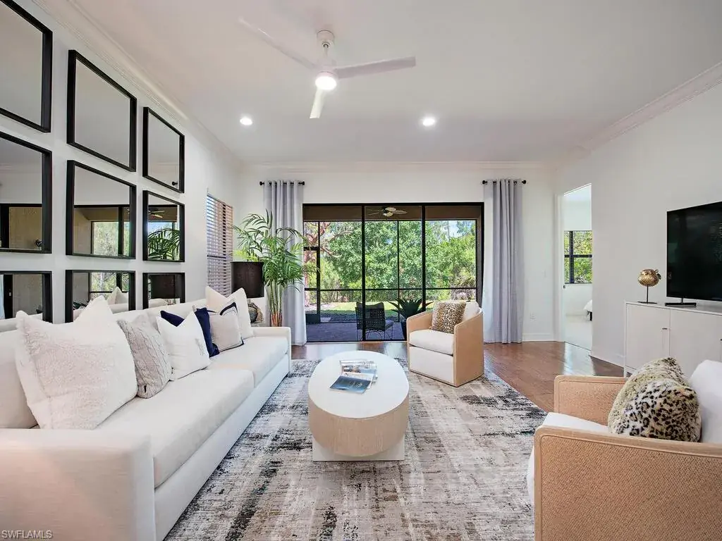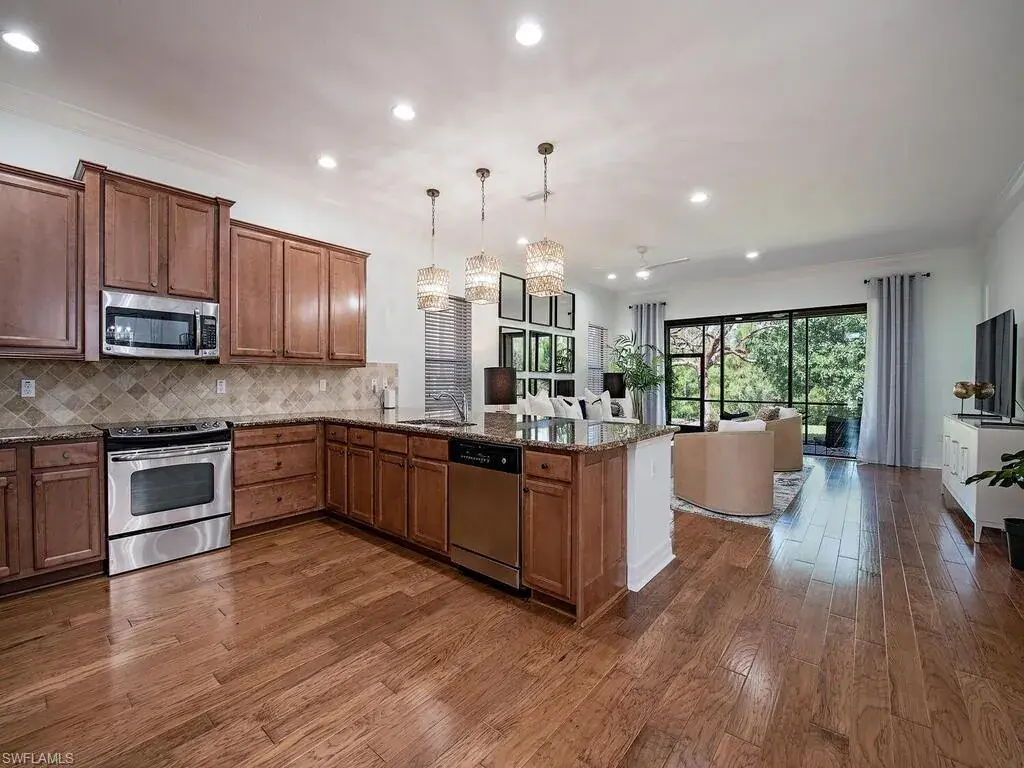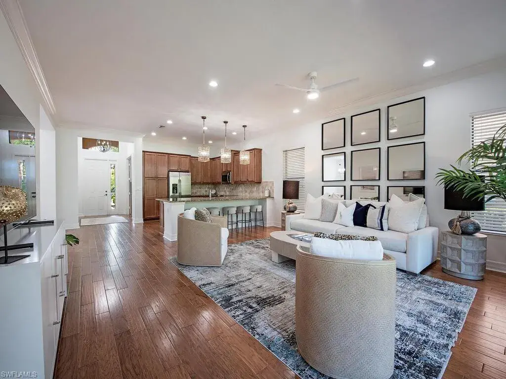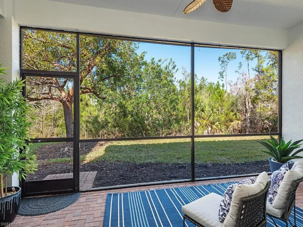 Welcome to this serene retreat, the perfect place to enjoy year-round living or escape the northern winters. Start your mornings with a cup of coffee on the screened lanai, where you can relax while watching birds in the lush nature preserve behind your home. A welcoming covered entry leads into a spacious foyer, guiding guests into the heart of the home: a bright, open great room. The kitchen features warm wood cabinetry, an oversized granite dining counter, pendant lighting, and sleek stainless-steel appliances. Just across from the kitchen, the elegant dining room creates an ideal space for entertaining friends and family. This open floor plan feels even more expansive with soaring 10-foot ceilings throughout. The peaceful primary suite, located at the rear of the home, enjoys stunning preserve views and boasts two walk-in closets and an ensuite bath. The second bedroom, thoughtfully tucked away for privacy, is adjacent to a full bath. The third bedroom is great for guests or can easily serve as a cozy den. Storage is never a concern, thanks to a generously-sized closet in the laundry room. This home has been meticulously updated with new lighting, fresh ceiling fans, and fresh interior paint, making it move-in ready. Additional upgrades include beautiful hardwood flooring, crown molding, and stylish window treatments. With impact-resistant windows at the front and accordion shutters on the side and rear, storm prep is a breeze. Located in the highly sought-after Riverstone community, this home offers an unparalleled vacation-inspired lifestyle. Just minutes from I-75 and zoned for “A”-rated schools, you’ll have access to Riverstone’s exceptional amenities, including a fitness center, social hall, resort-style pool, lap pool, spa, five lighted tennis courts, outdoor basketball and pickleball courts, an indoor basketball court, a tot lot, a children’s water play area, and a game room. With a full calendar of community activities, clubs, and classes, Riverstone truly has something for everyone.