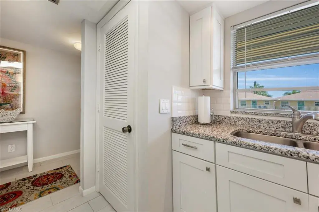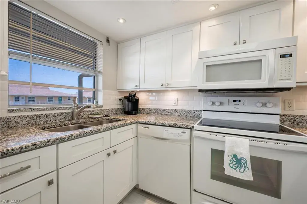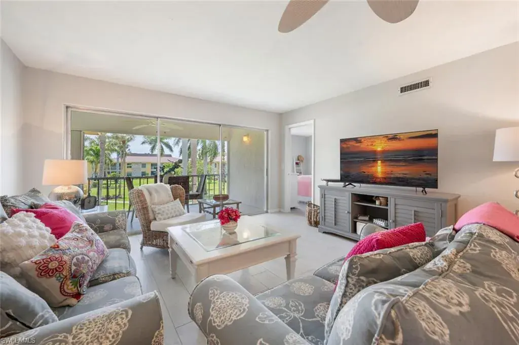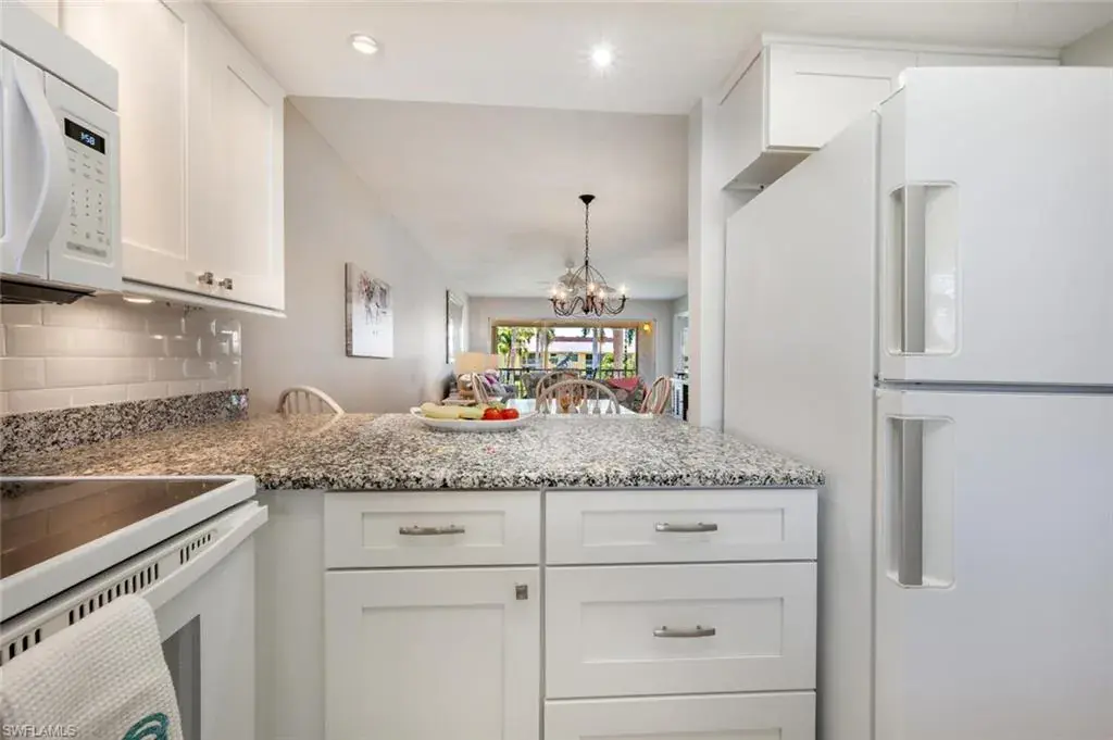 PRICED TO SELL!!! This fully updated condo, with a pleasing view of the pool and landscaped grounds from the 100 s/f screened-in lanai, is being sold TURNKEY! The unit, which is located in a quiet and friendly 55+ community, is located 3 miles from the world class Naples Pickleball Center and eight miles from the beach, with the shops, restaurants and galleries on 5th Ave only a ten-minute drive away. A southern exposure ensures plenty of sunlight throughout the day. The kitchen renovation included new cabinets, a tile backsplash and granite counters. There is ceramic tile flooring throughout the unit for easy clean-up. The vanities, counters and fixtures in both bathrooms have been replaced, and the Master Bath features a custom tiled walk-in shower. All of the furniture is in excellent condition and the condo fee includes cable/water/trash/internet, so this is an excellent choice for a price conscious buyer. The perfect set-up for a snowbird, or someone looking to enjoy beautiful SW Florida the whole year round!