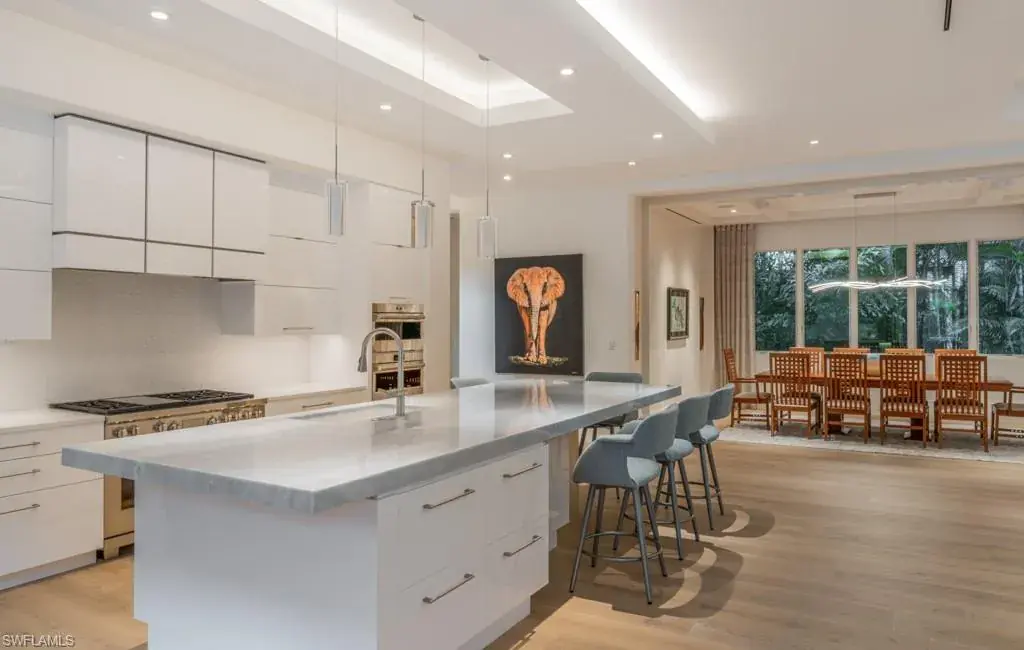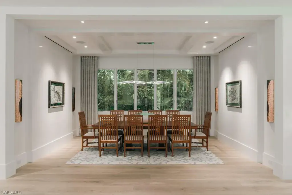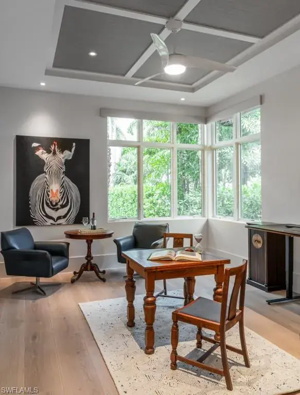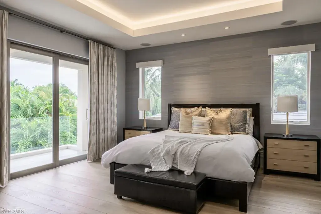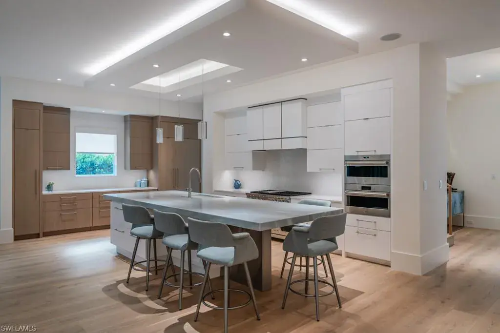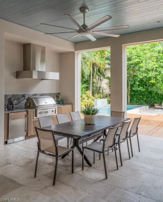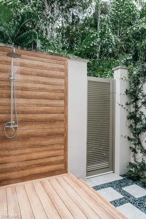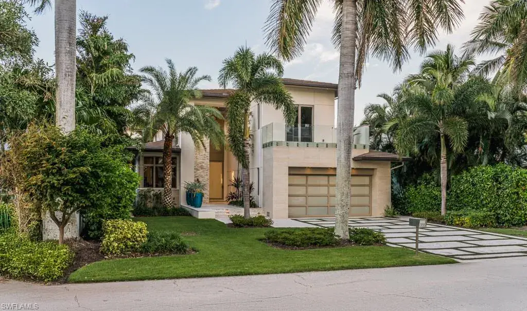 Nestled in the heart of Old Naples, just three blocks from the beach and steps away from world-class shopping and dining on 5th Avenue and 3rd St South, this custom, newly built London Bay home is ideally located on a peaceful street. The open floor plan showcases luxurious finishes and attention to detail throughout. The spacious kitchen features a 13-foot island and an expansive walk-through pantry, complemented by rift oak and high-gloss white cabinetry that harmonizes beautifully with the wide plank oak floors. An open formal dining room and expansive great room with a bar flow effortlessly through pocketing sliding glass doors to a covered outdoor living area. This outdoor oasis includes a fireplace, an outdoor kitchen, automated screens, pool, a tranquil pond and water feature, and a beautifully designed private garden shower. The second floor is home to two guest suites, a comfortable bonus room, and the primary suite, which boasts two walk-in closets and a private balcony overlooking the tropical yard. Additional noteworthy features include a 3-car garage, an elevated generator, air-conditioning units, and tankless water heaters, all with the convenience of natural gas serving the property.