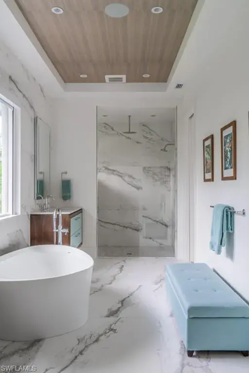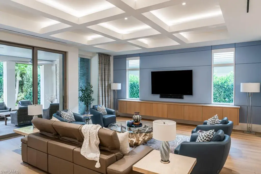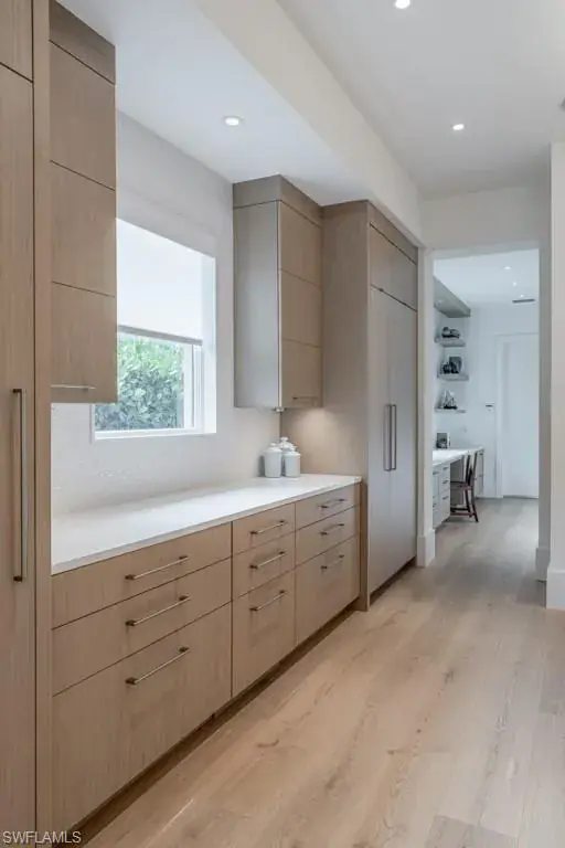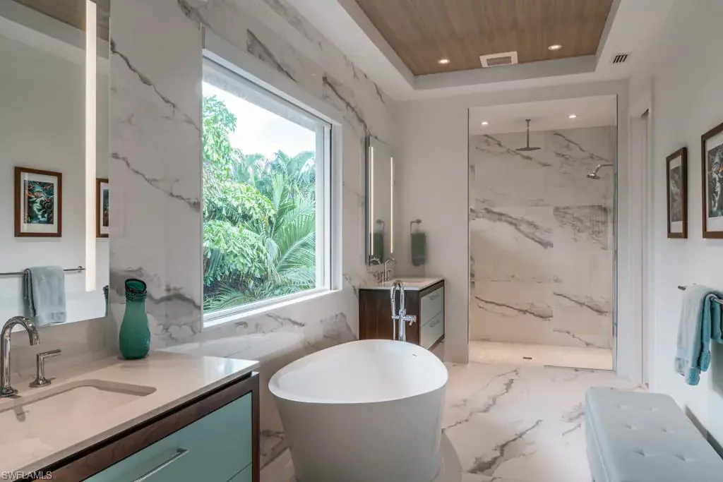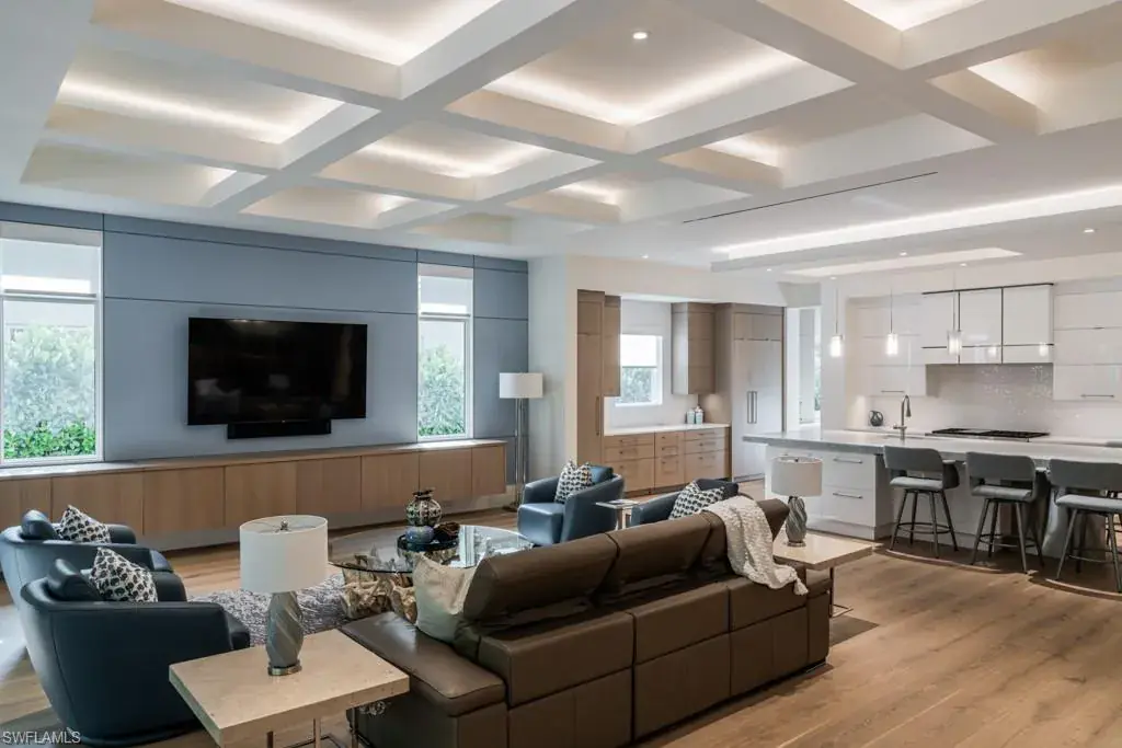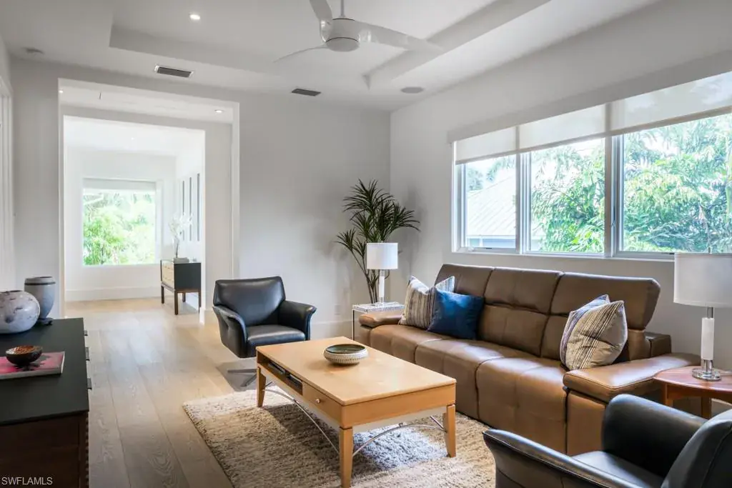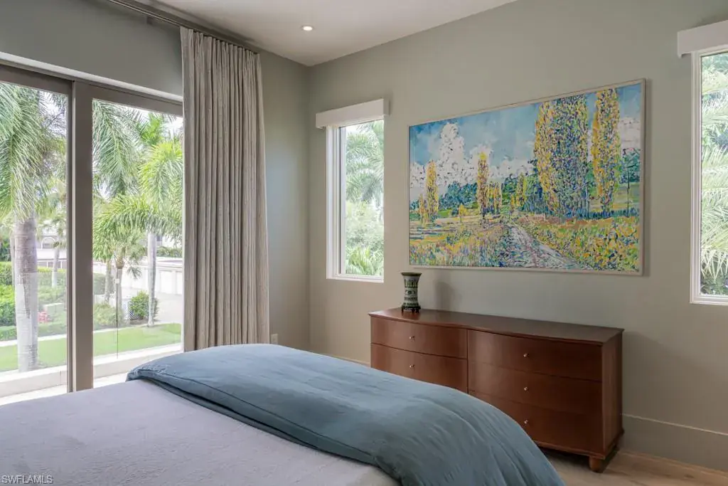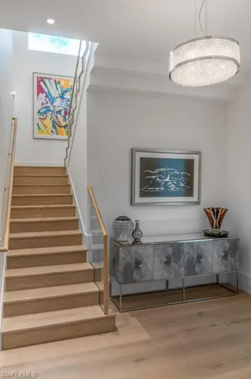 Nestled in the heart of Old Naples, just three blocks from the beach and steps away from world-class shopping and dining on 5th Avenue and 3rd St South, this custom, newly built London Bay home is ideally located on a peaceful street. The open floor plan showcases luxurious finishes and attention to detail throughout. The spacious kitchen features a 13-foot island and an expansive walk-through pantry, complemented by rift oak and high-gloss white cabinetry that harmonizes beautifully with the wide plank oak floors. An open formal dining room and expansive great room with a bar flow effortlessly through pocketing sliding glass doors to a covered outdoor living area. This outdoor oasis includes a fireplace, an outdoor kitchen, automated screens, pool, a tranquil pond and water feature, and a beautifully designed private garden shower. The second floor is home to two guest suites, a comfortable bonus room, and the primary suite, which boasts two walk-in closets and a private balcony overlooking the tropical yard. Additional noteworthy features include a 3-car garage, an elevated generator, air-conditioning units, and tankless water heaters, all with the convenience of natural gas serving the property.