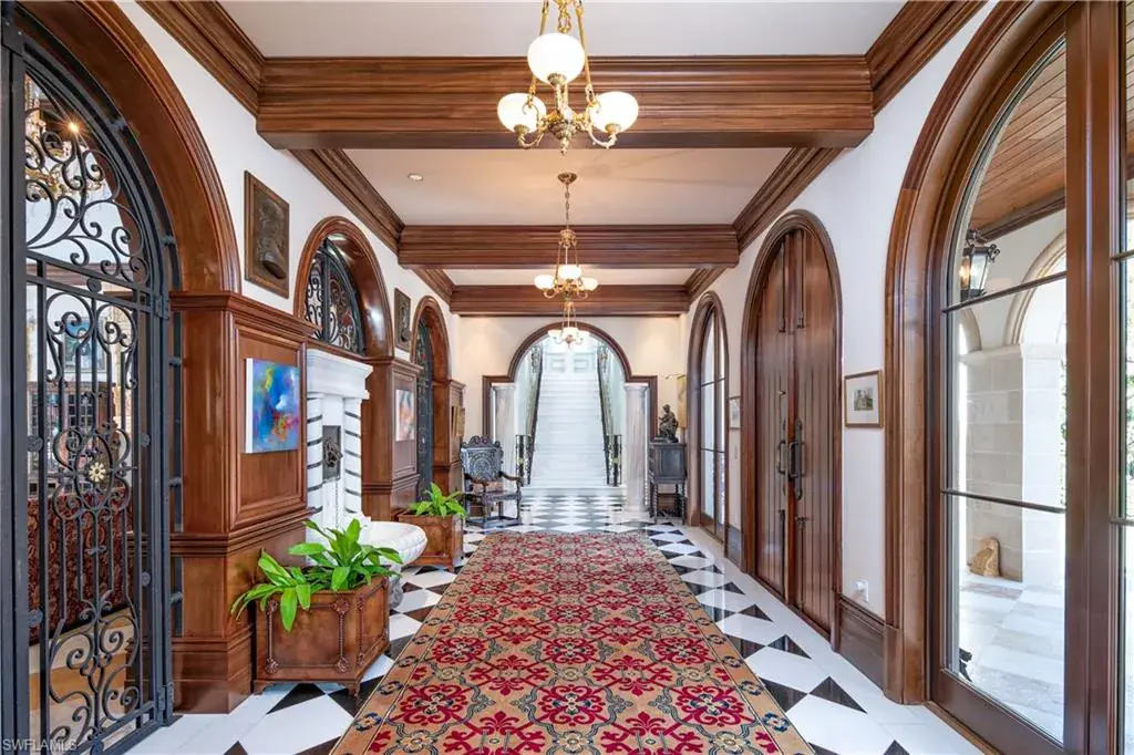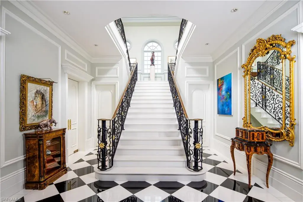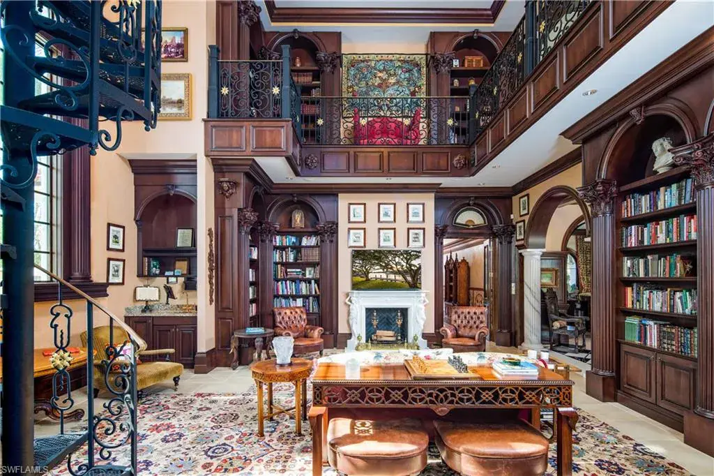 A home in the European tradition with extraordinary attention dedicated to the details. Standing proof that beauty and grace can be achieved without compromising any of the modern amenities and structural innovations so important to modern buyers. The home is situated on one and one half Port Royal lots, with wonderful western views over Hidden Bay. Each room is focused on promoting its unique purpose without sacrificing luxurious comfort. Living areas include a glorious two-story great room with immense fireplace, beautiful two-story library with spiral staircase, five large ensuite bedrooms, large art studio or sixth bedroom, stunning dining room, spacious family room with wet bar, and significant covered lanais overlooking the pool and abundant green space leading to the waterway beyond. Two separate two-car garages. Port Royal Club membership eligibility.