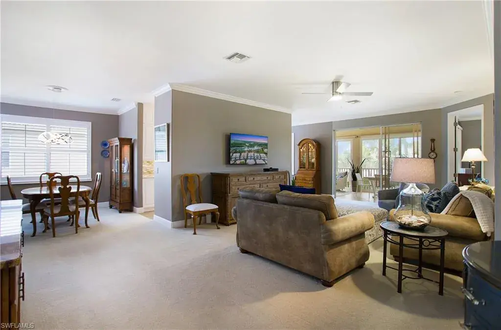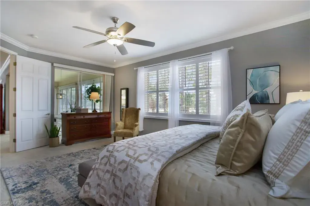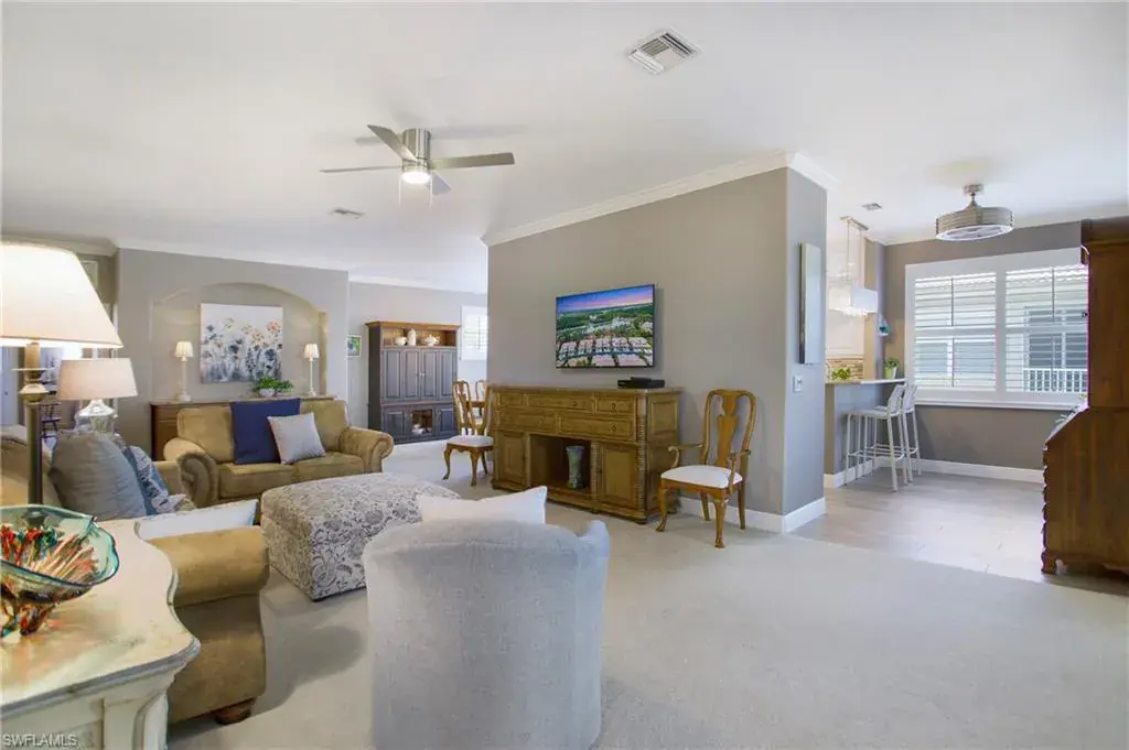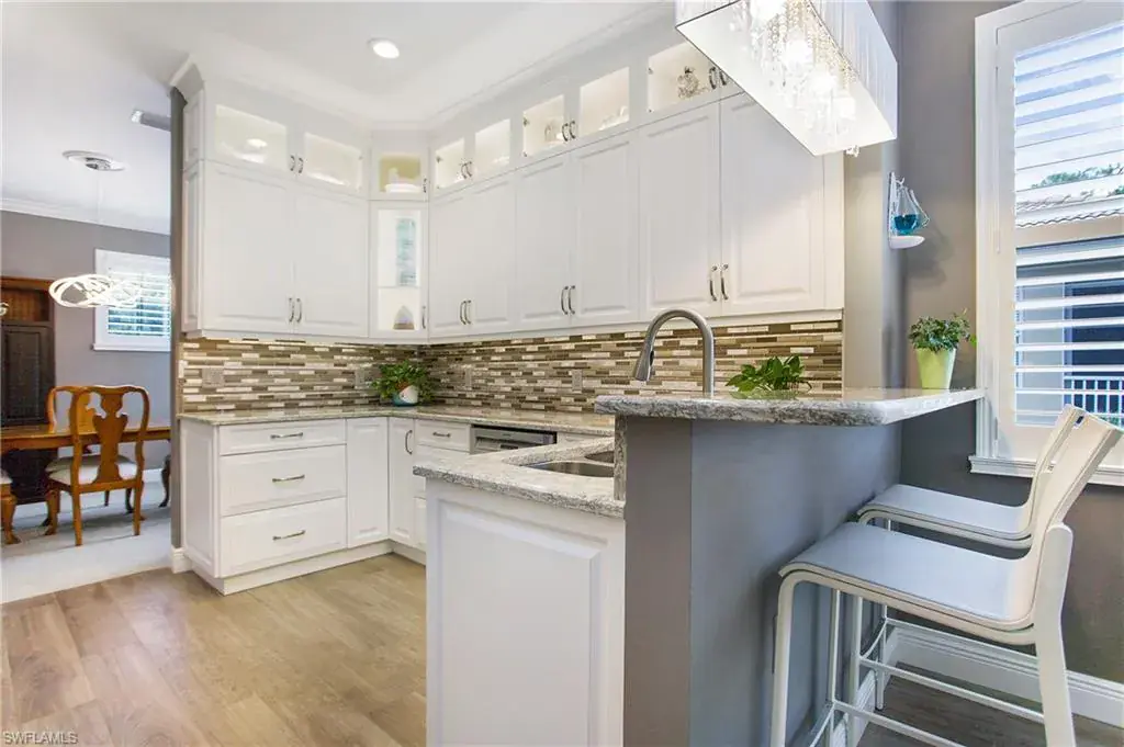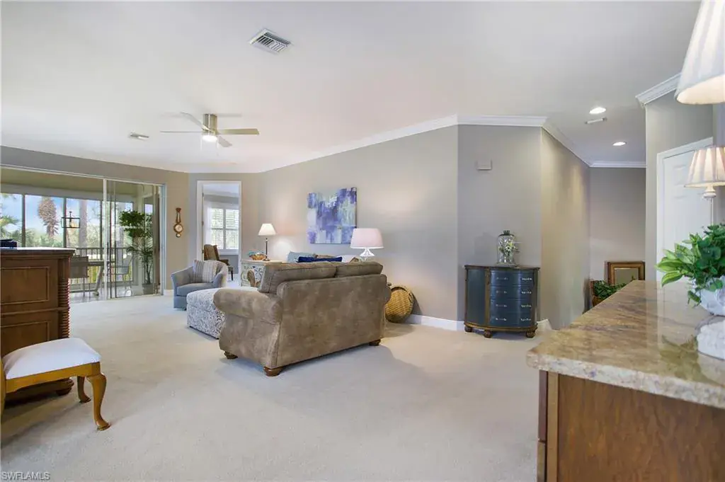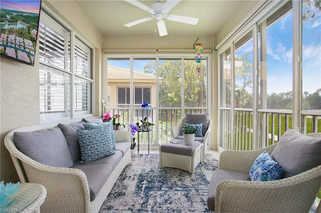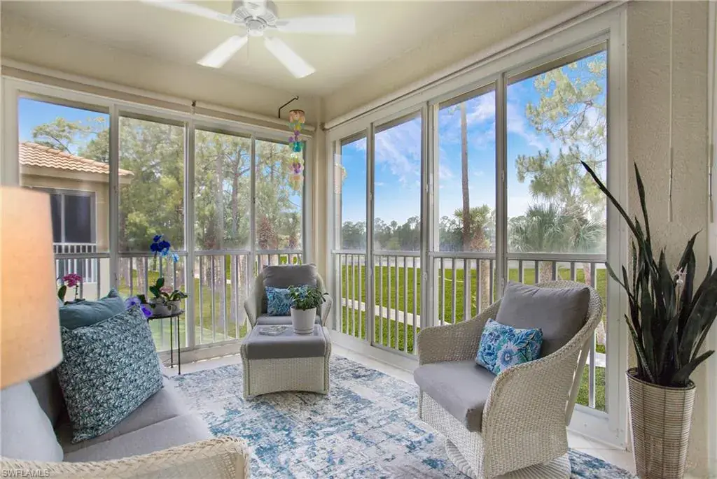 GOLF INCLUDED!!! Welcome to luxury living in the prestigious bundled golf community of Forest Glen, where this beautifully renovated 3 bed/2 bath Bishopwood COACH HOME awaits! With only 4 units per building, this home offers privacy and exclusivity. This property is being offered furnished with few exclusions; golf cart is negotiable. A two-car garage with epoxy floor, paver driveway, and tropical landscaping greet you at the front of the property. Step inside to discover an open floor plan with a gorgeous kitchen boasting high-end custom cabinets, perfect for the discerning chef. Sophisticated details abound, including wood plank tile flooring, crown molding throughout, stylish light fixtures, tons of closet space, and plantation shutters, adding elegance and charm to every corner. Many recent upgrades are found throughout, including appliances (2019), A/C (2017), roof (2023), and new automatic hurricane shutters. Another highlight of this home is the screened-in lanai, accessible from both the main living area and the primary bedroom. Here, you’ll enjoy breathtaking views of the golf course and serene lake, creating a peaceful retreat for relaxation and entertainment. Forest Glen offers a country club lifestyle with world-class amenities, including golf, both indoor and outdoor dining, fitness center with instructional classes, tennis, bocce, pickleball, and more. Residents enjoy access to a resort-style club pool and separate neighborhood pool. Many social activities and clubs are on offer at the community clubhouse. Whether you’re seeking an active lifestyle or a tranquil escape, this community has something for everyone. Some photos include virtual reality staging.