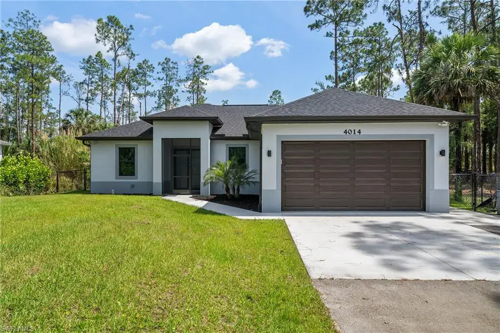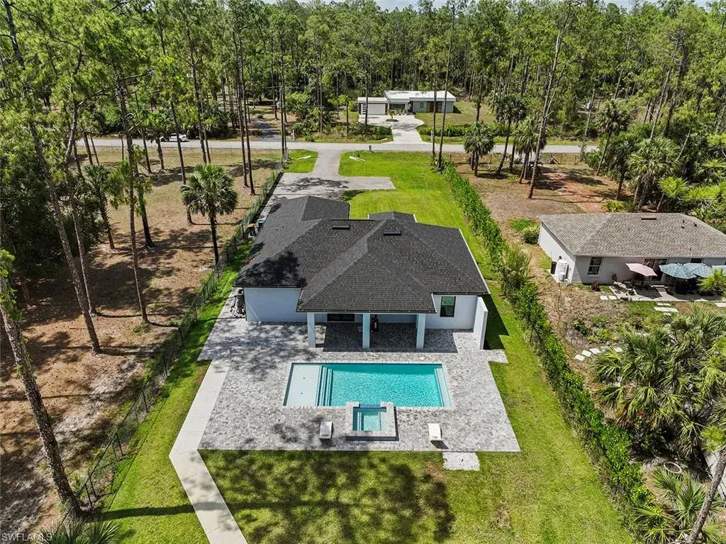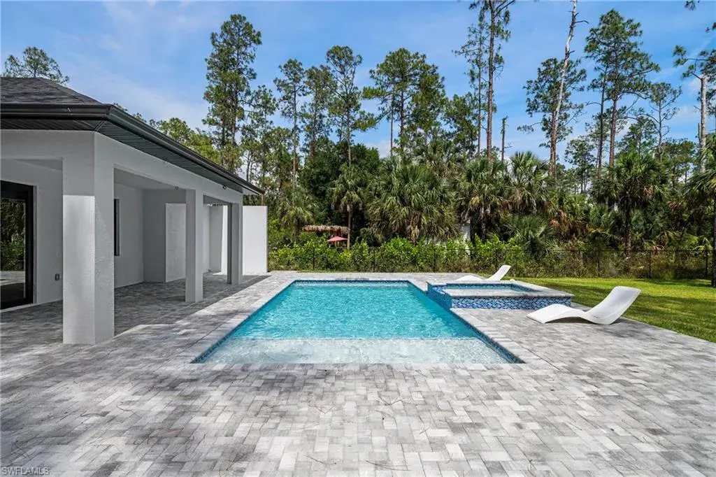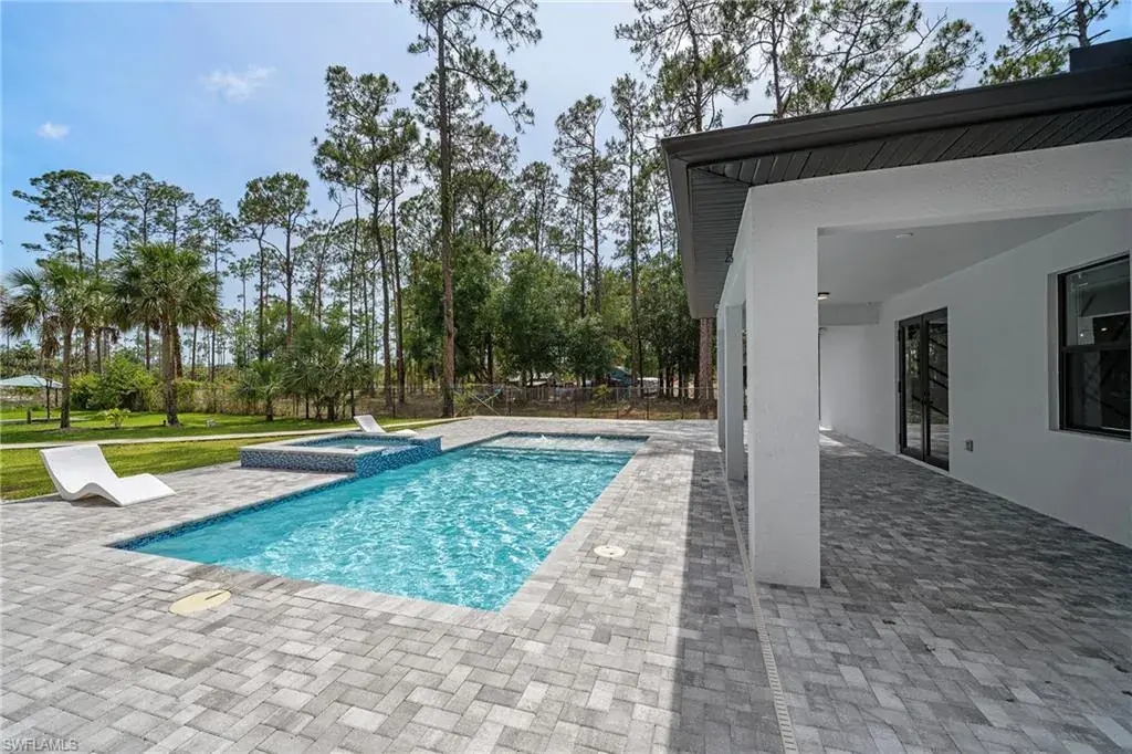 Welcome to your Gorgeous bran new pool home in the desirable Golden Gate Estates neighborhood. Here you will enjoy the serene beauty of nature while living in close proximity to the many destinations that Naples has to offer. This home offers many luxury upgrades for your enjoyment, such as 32″ porcelain tile throughout, two walk-in showers, top of the line Samsung Slate fingerless appliances, white wood cabinets that extend all the way up to the ceiling, a quartz waterfall countertop, designer glass backsplash and light fixtures. Ceiling fans in all rooms, spacious covered lanai plumed and ready for your outdoor kitchen. Indoor laundry room, with utility sink, and cabinets. Reverse Osmosis system for the entire home. The garage is airconditioned and the floor is epoxy. The heated pool and spa with smart system were just added. Also newly added storage building with concrete floor and storage racks. The lot is fully fenced for yours and your pet’s privacy, enjoyment, and safety. The paved driveway was extended to accommodate your boat, RV, or any of your toys. Come and experience country living in paradise while swimming in your pool or lounging in the spa. The wooden structures in the back do not convey.