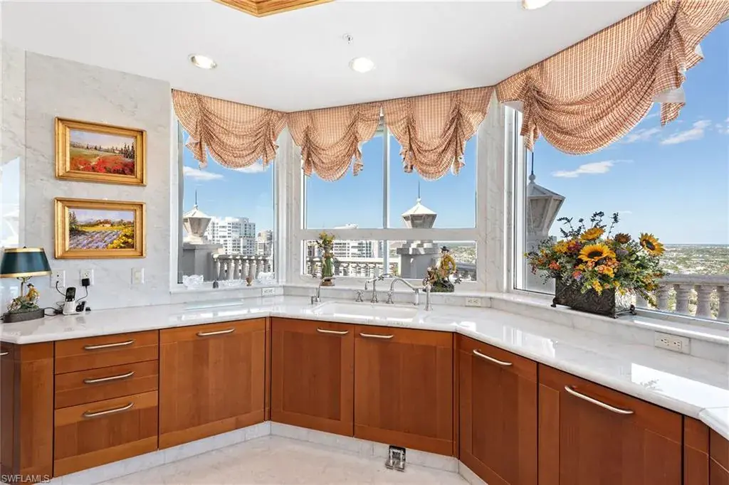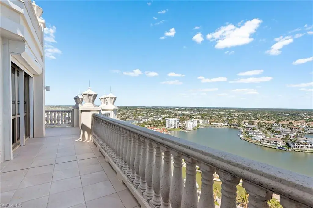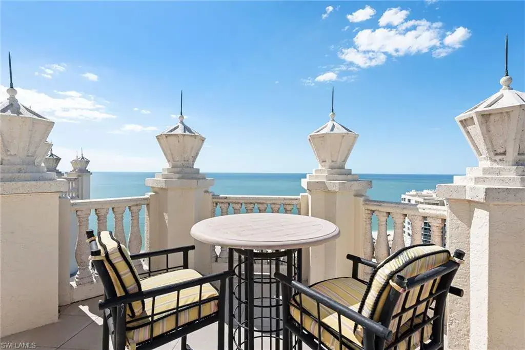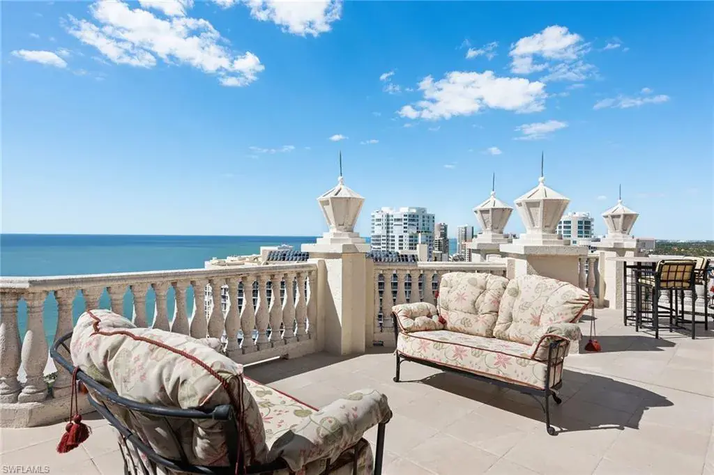 This exquisite Penthouse residence at Brittany offers captivating direct Gulf views and serene sunrise Bay views from an incredible wrap-around terrace. With over 6,200 sq ft of living area and 3,000 sq ft of outdoor space, the floor-to-ceiling windows bring in natural light and showcase spectacular views. This generous one-of-a-kind Camargue floor plan has northern exposure and comprises a posh master suite with sitting & exercise rooms, plus 3 en-suite bedrooms, library, media room, and private access to the roof. Interior features include marble, stone & wood flooring, architectural crown molding & wainscoting, sparkling chandeliers and custom murals. The updated gourmet kitchen boasts top-of-the-line appliances, soft-close cabinets, pot filler with foot pedals, and views for miles. Situated directly on the pristine sugar sand beach that Naples is known for, this top floor home comes with a cabana to spend your days lounging by the beachfront lap pool. Other luxurious building amenities include grills, fire pit, fitness center & spa, tennis courts, board & card rooms, and 4 guest suites. Have peace of mind with 3 under-building parking spots, electric shutters, and 24-hour staff. Owners are allowed 1 dog/cat under 25 lbs and can lease twice per year with a 90-day minimum. The Brittany is located across the street from upscale waterfront dining & shopping at Venetian Village and the yacht club to buy or lease a boat slip.