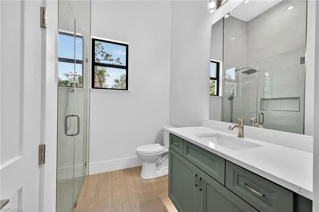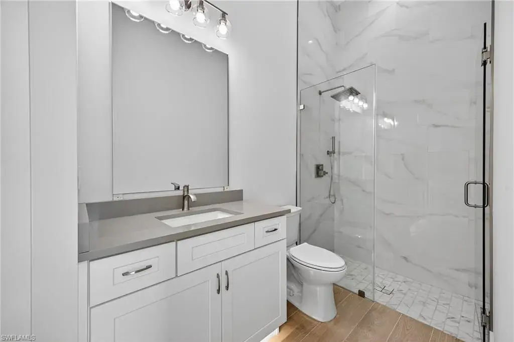 Additional Bedrooms: Three more bedrooms, each with its own bathroom featuring floor-to-ceiling tile and seamless glass shower doors.