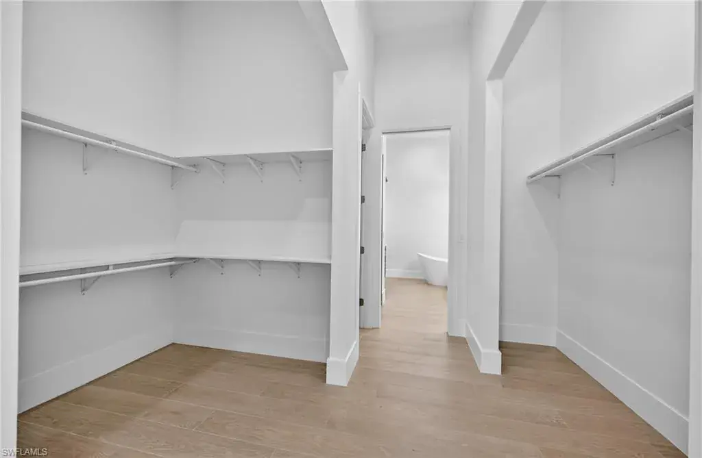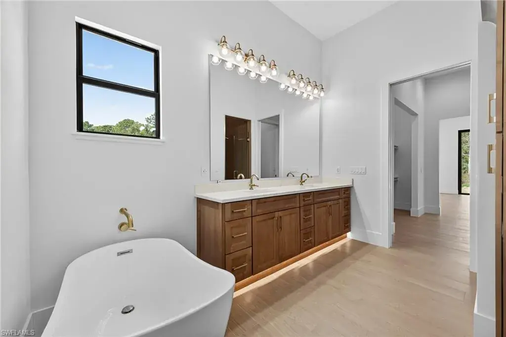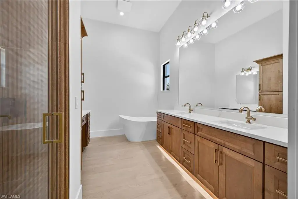 Master Suite: An elegant, private retreat featuring bathrooms with a freestanding tub, makeup vanity, and a large walk-in closet.