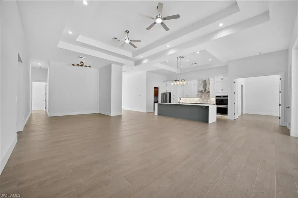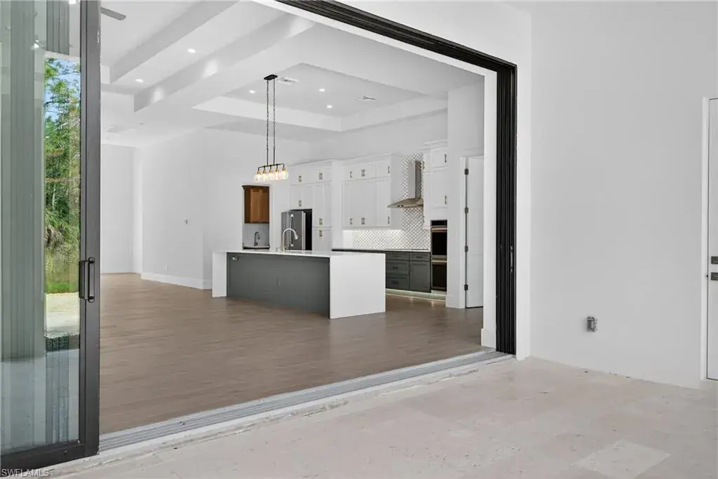 Living Room: Tray ceilings add dimension, with sliders opening up to a lanai for indoor-outdoor living.