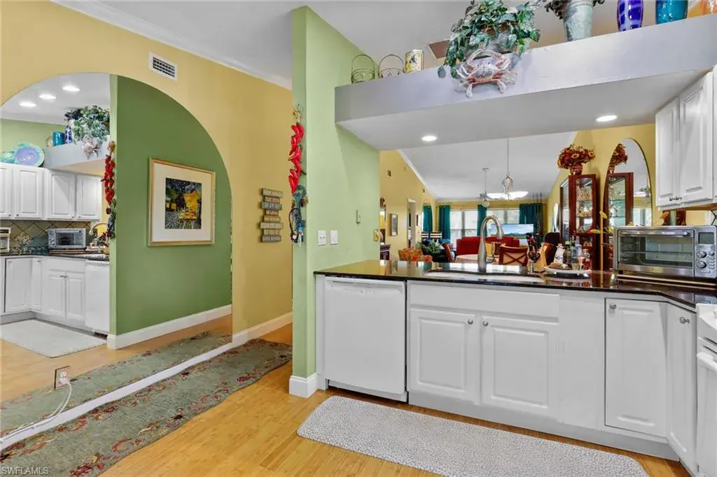Huge price reduction on a Winterpark condo with value-added updates! Nothing compares in the area with these features at this price. This well-maintained home will delight you – updated kitchen and baths with Uba Tuba granite, large owners suite with walk in closet, engineered wood floors, high ceilings, impact windows and slider, plumbing and AC updated. Extra storage under breakfast bar. Reserved parking right outside your door, large laundry room with lots of storage, and the huge resort pool and tennis/pickle ball courts add to the lifestyle you are looking for. A pet is allowed, and cable, water and sewer are provided with your HOA fees. Newer stainless refrigerator, washing machine, and disposal. Walk to Kings Lake shopping and 10 minutes to Olde Naples.