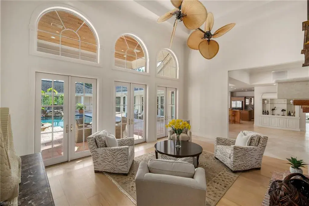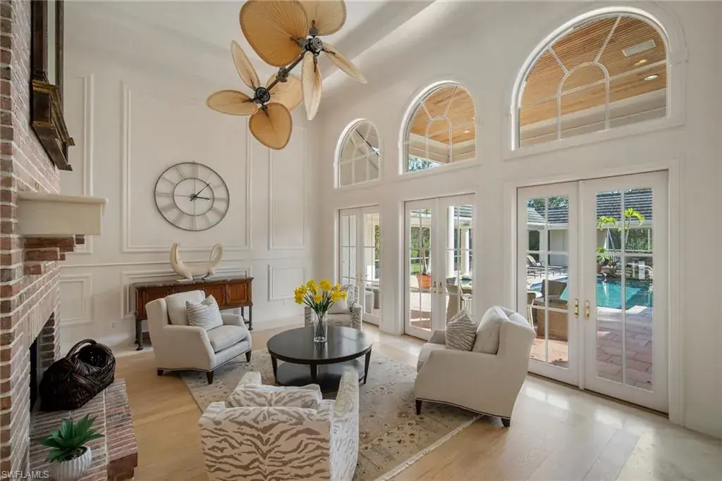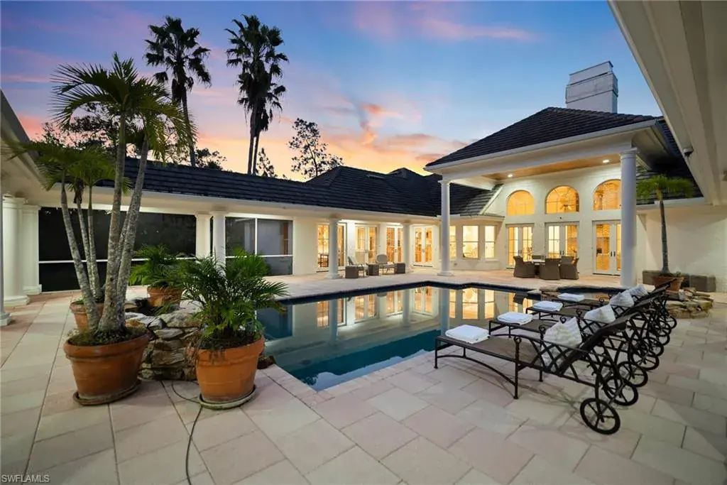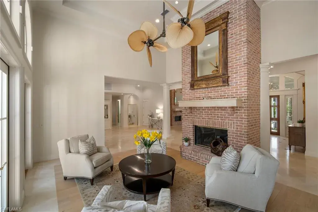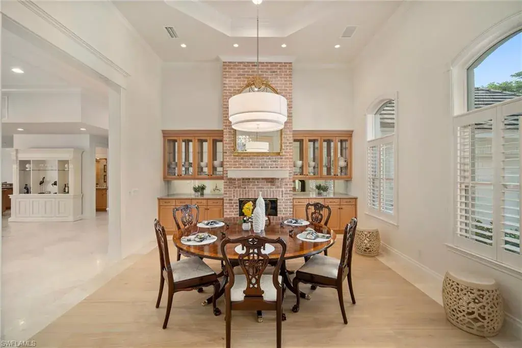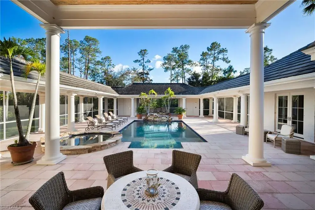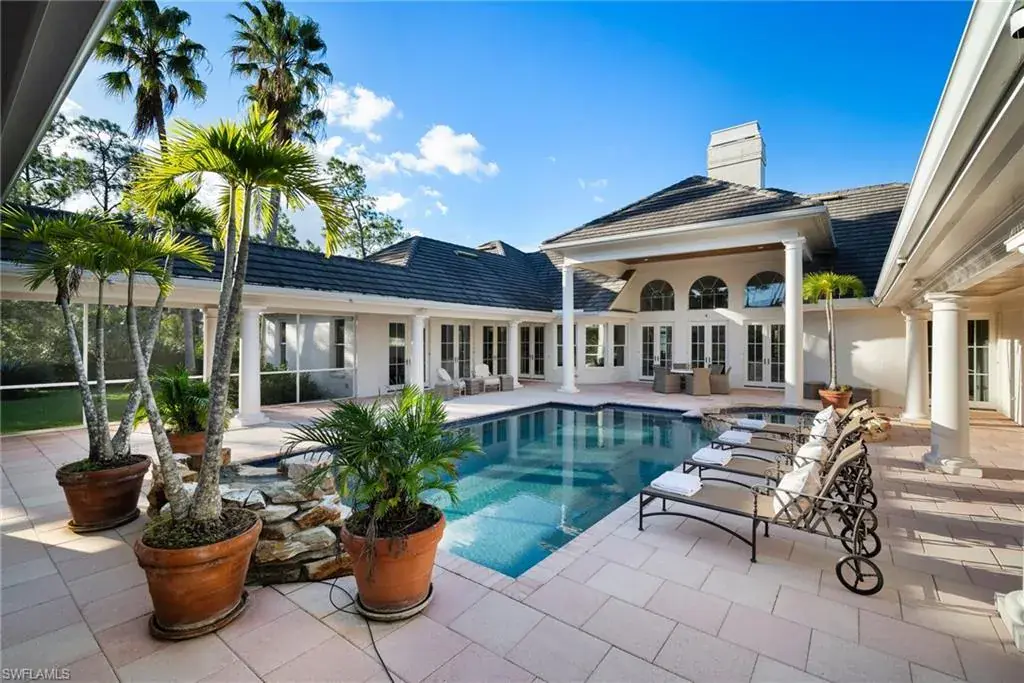 Classic Luxury meets a beautiful location and privacy! Nestled in the prestigious gated community of Naples Club Estates, adjacent to Naples National Golf Club, with only 28 private 3/4 acre homesites! This unique neighborhood is situated around man made lakes and walking paths. A classic meticulously maintained home with soaring ceilings, travertine marble, wood look tile floors, beautiful chandeliers and plantation shutters! In addition, the 4 spacious bedrooms all have full private baths, an oversized den with fireplace, living room with fireplace, dining room with fireplace, large family room and 3 half baths to include a pool bath! With over 5300 Sq Ft. there is plenty of space to entertain all of your family and friends. The open floor plan allows owners and guests to appreciate the extraordinary view throughout the living room, family room, kitchen, breakfast nook, primary bedroom and of course the lanai!! Enjoy very minute of the spectacular oversized landscaped yard and lanai with custom pool and spa! Naples Club Estates offers exclusive private gate access to the award winning Naples National Golf Club, where memberships are optional. Perfectly located only 15 minutes to downtown 5th Ave Naples and 25 minutes to the beautiful Marco Island. This IS where you want to live!