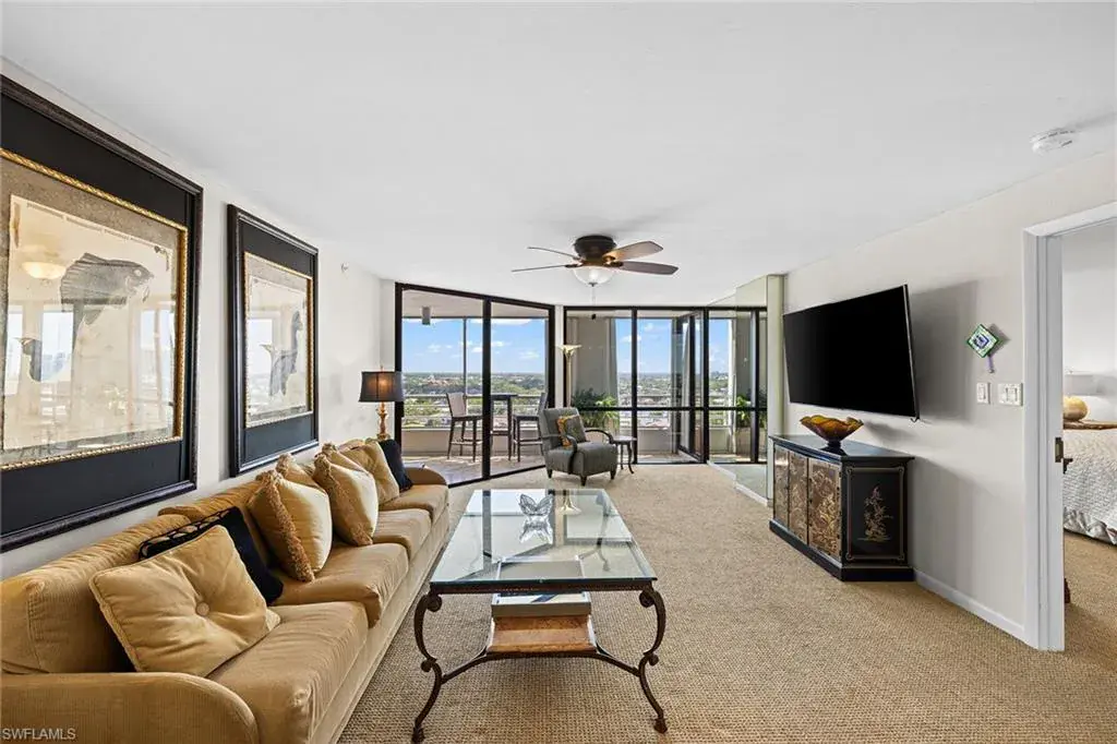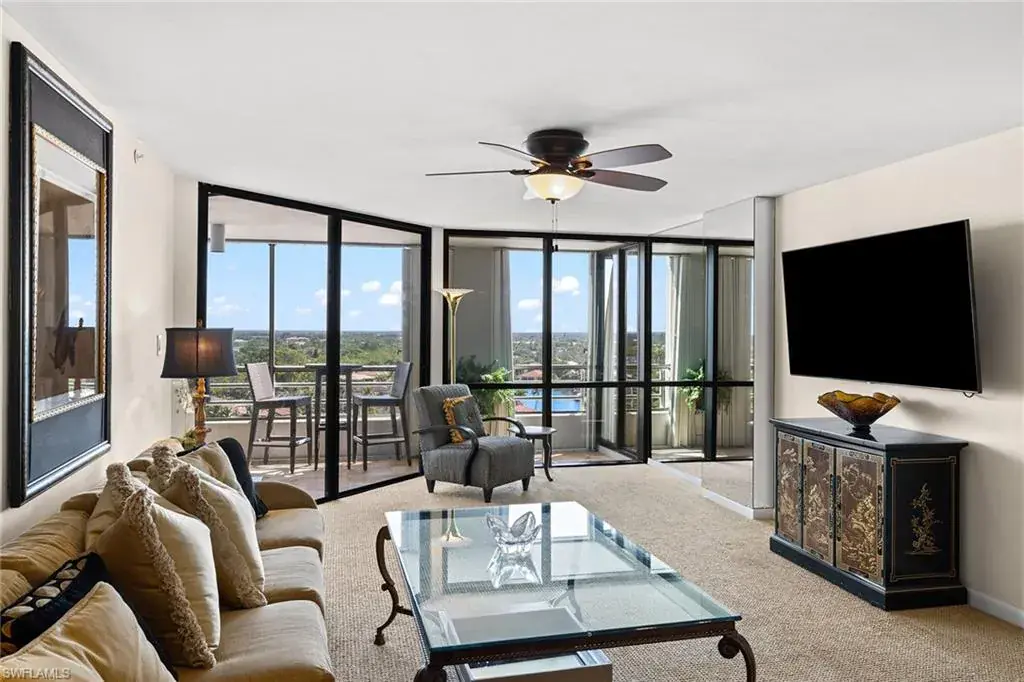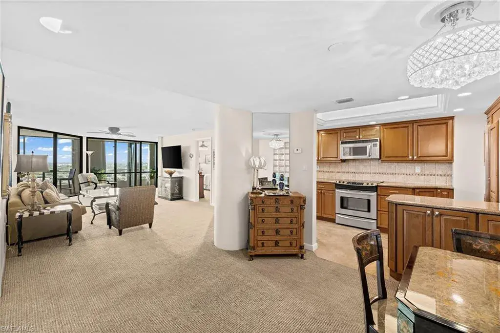 Welcome to the Terraces at Park Shore. Ideally located on the Gulf of Mexico steps to the sand along Venetian Village. This highly sought-after contemporary building offers direct beach access and walkability to coffee, dining, shops and marina. This pet-friendly building has every amenity you could want- fitness center, beautiful pool, hot tub, outdoor fire pit, multiple grills, social room with catering kitchen, rack for kayaks and paddle-boards, bike and beach gear. This 19-story building also has a full-time 24-hour doorman. As an added plus there are also three guest suites for overflow visitors. In this 14th-floor, 2-bedroom, 2-bath residence you will enjoy superior views from its living spaces and expansive lanai. The kitchen takes center stage with its rich wood cabinetry, sleek stainless steel appliances and tray ceiling. Designer wall-to-wall carpeting unifies the space, while the primary bedroom boasts a generous size, accompanied by a lavish bathroom with tub. The closet is a marvel of organization, offering sections to preserve your attire.  The Terraces is an architectural masterpiece that should not be missed.