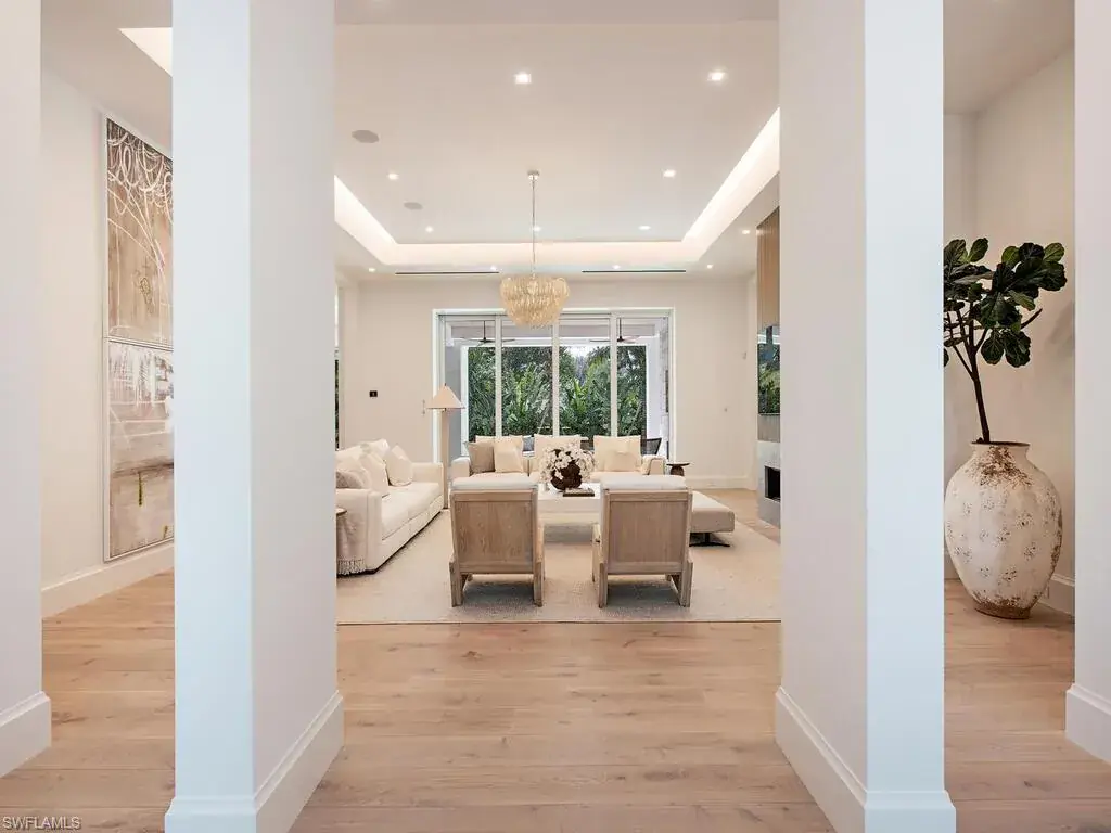 outdoor living area with tropical landscaping and an oversized pool and spa. The interior