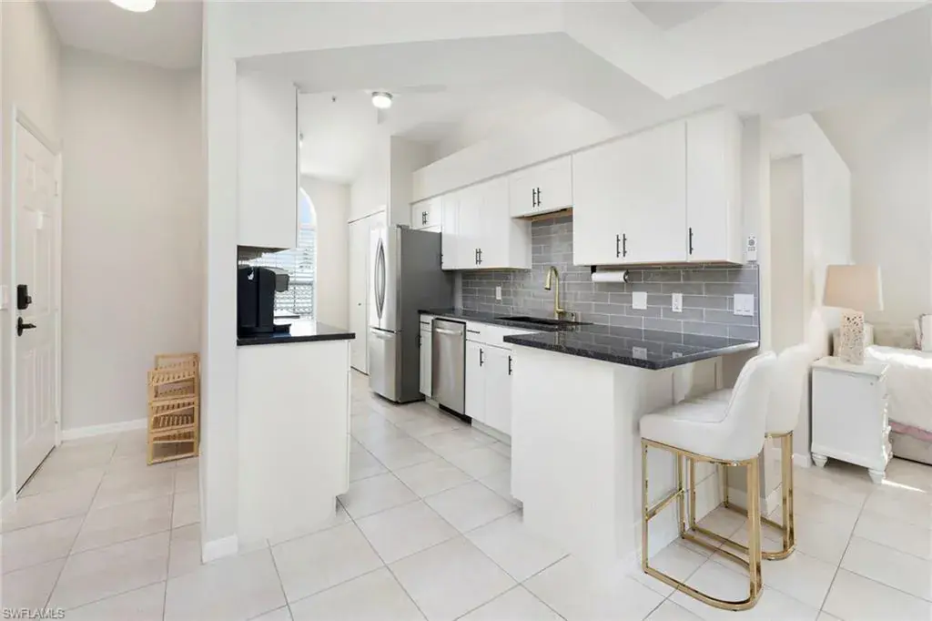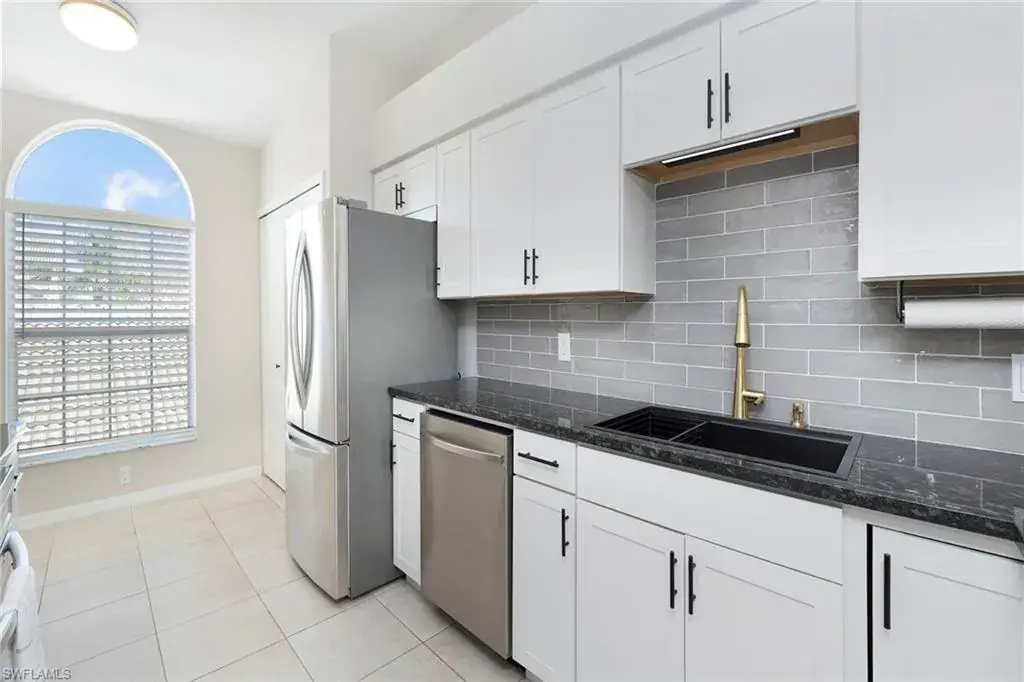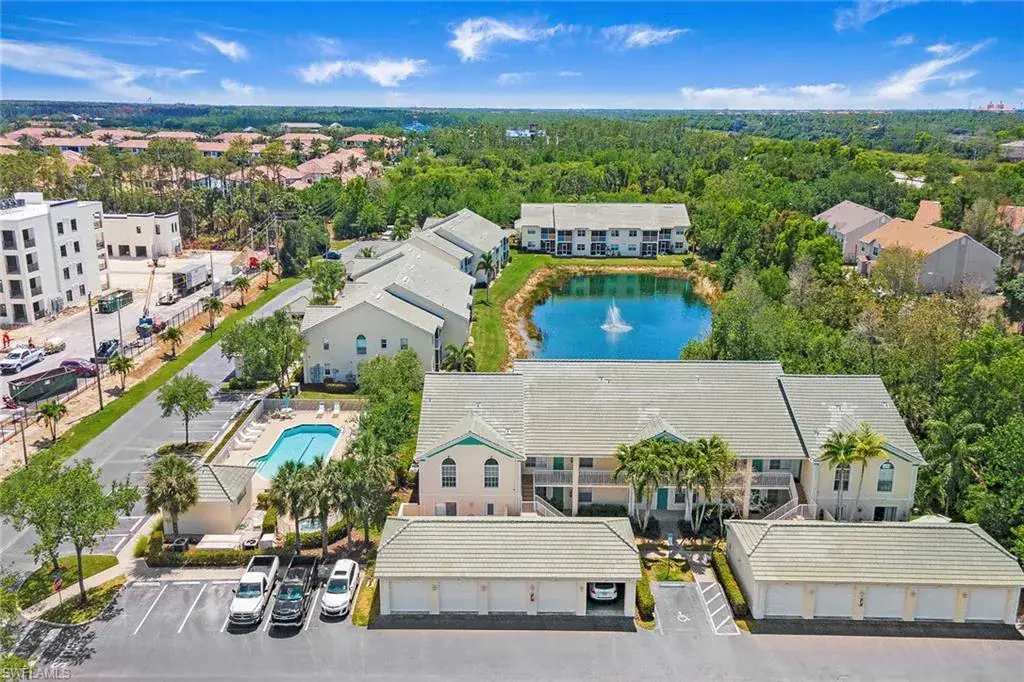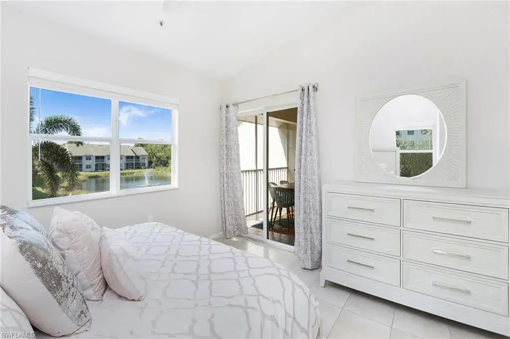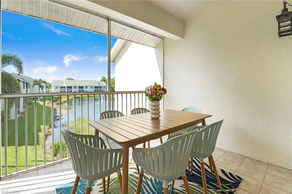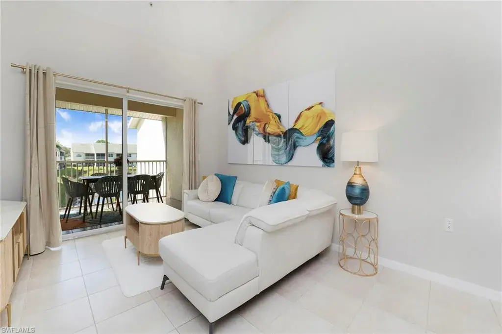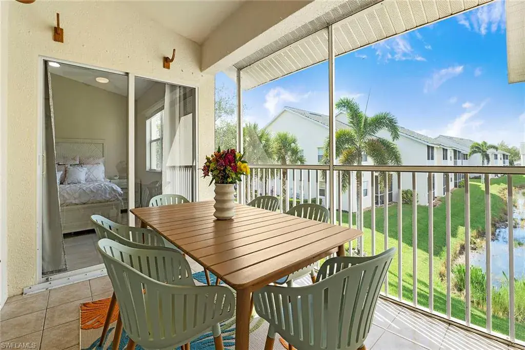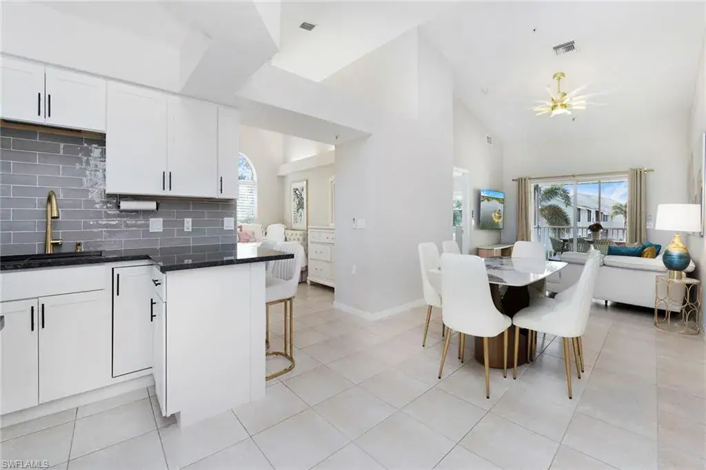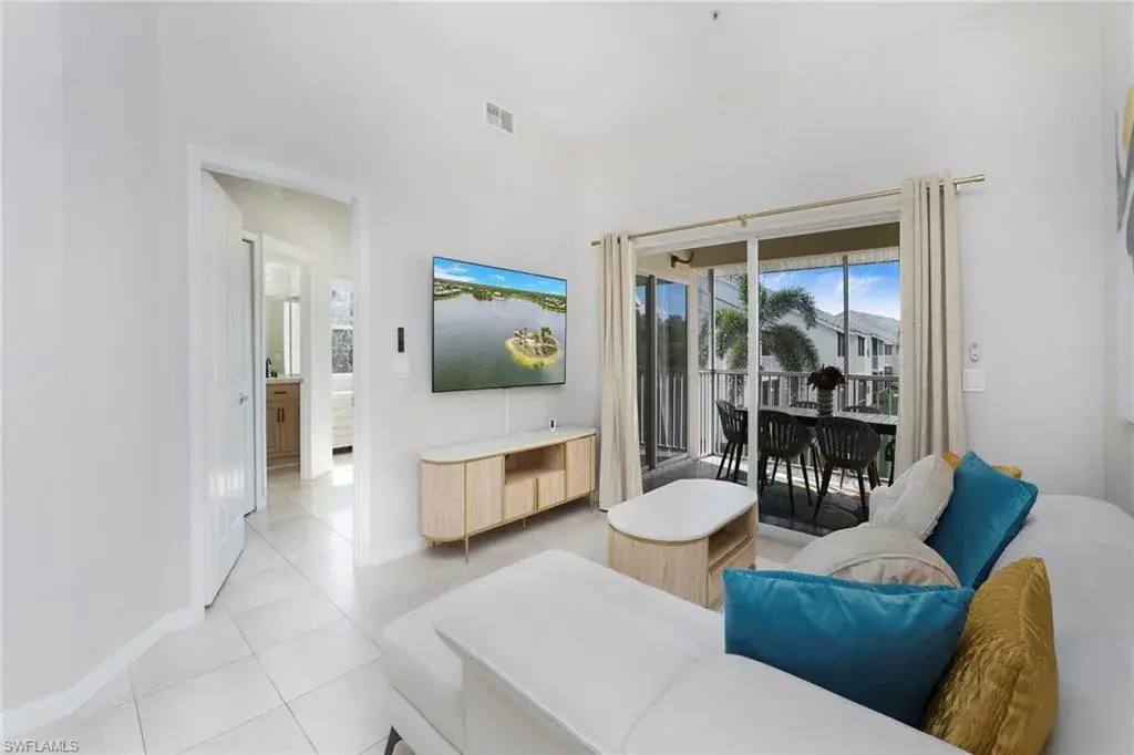 Welcome to your dream home in the heart of North Naples! This second-floor Bermuda Palms end-unit condominium with a garage is being sold furnished and offers a luxurious yet economical lifestyle. Step into this beautifully remodeled two-bedroom plus den, two-bath condominium and be greeted by serene lake and pool views. The updated kitchen features elegant white shaker-style cabinets, a chic subway tile backsplash, granite and butcher block countertops, and sleek matte black fixtures. Modern white and matte gold light fixtures and ceiling fans add a touch of sophistication throughout the home. The spacious floor plan boasts vaulted ceilings in the living room, creating an airy and open atmosphere. The primary bedroom includes a walk-in closet and dual sinks in the newly renovated primary bath. The second bedroom offers privacy for guests, and the remodeled guest bath is located just off the living room. The versatile den is ideal for a bedroom, office, or formal dining room. Enjoy the serene views from the screened balcony overlooking a beautiful water fountain on the lake. This light and bright unit has southern exposure and is tiled throughout, including the lanai, with no carpet. The air conditioner was replaced in 2020, and the water heater in 2024, ensuring your comfort year-round. The garage provides attic storage, and there is an additional assigned parking space for your convenience. Located in the center of the community, this unit is just a short distance from the community pool, spa, and grilling area. Bermuda Palms is off Immokalee and Livingston roads, conveniently near A-plus-rated schools, community parks, and excellent shopping and dining opportunities. Tiburón Golf Club, Seed to Table, and The Galleria Shops at Vanderbilt are nearby, as well as the white sand of Vanderbilt Beach and Wiggins Pass State Park. Don’t miss out on this combination of location, amenities, and low condominium fees.