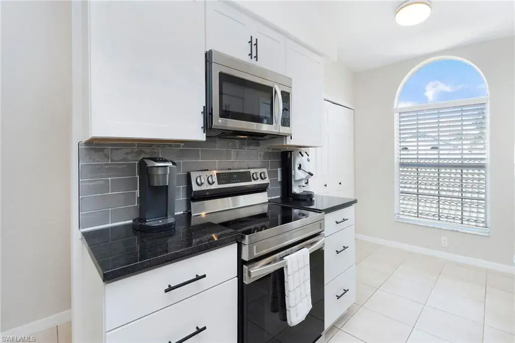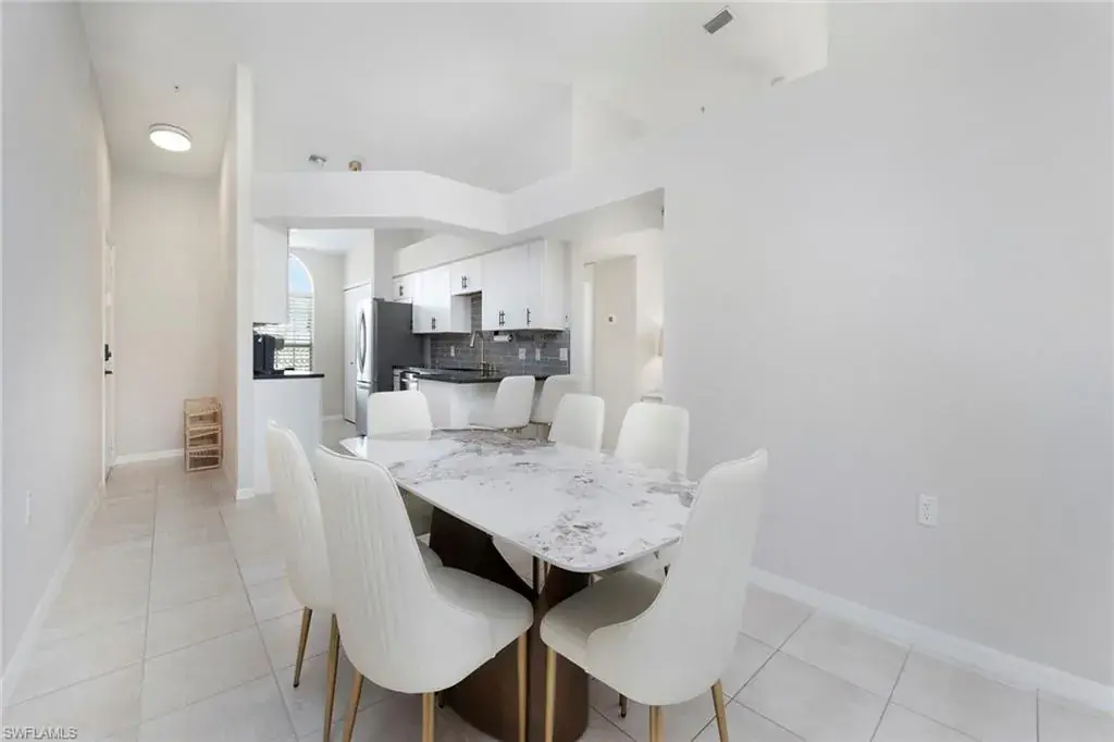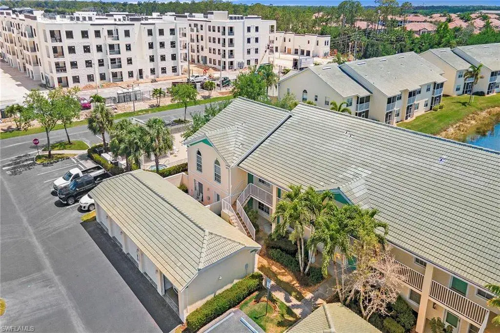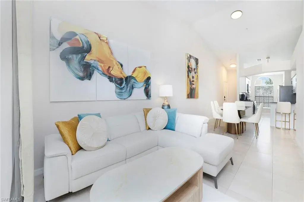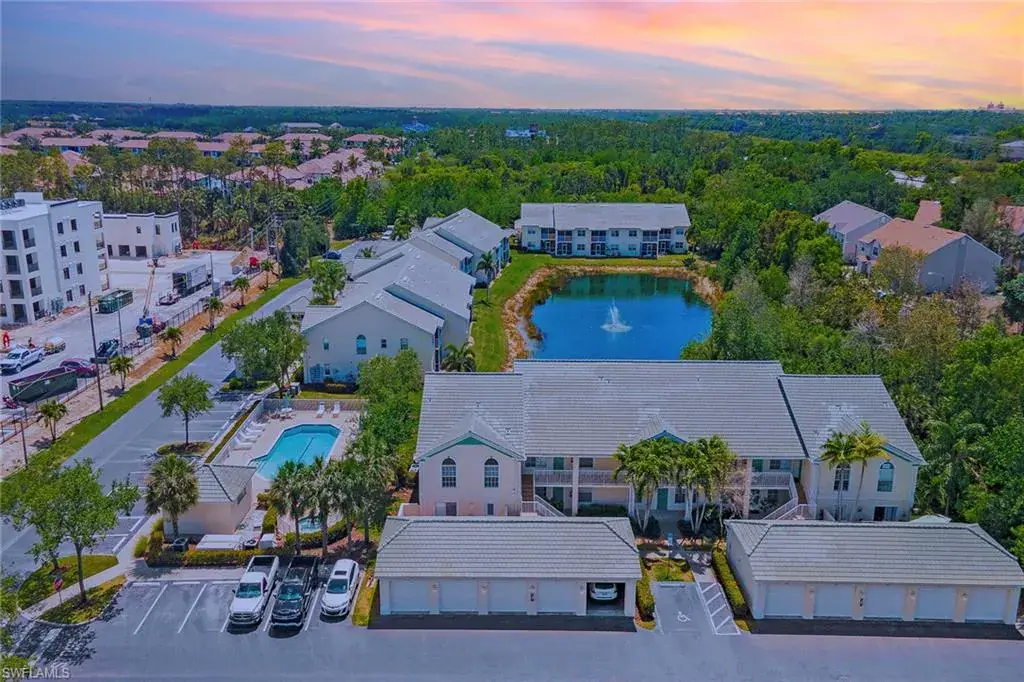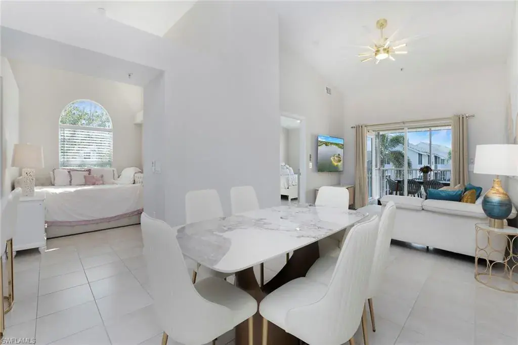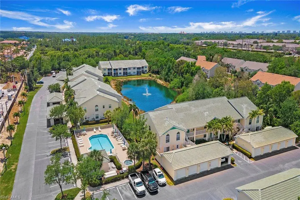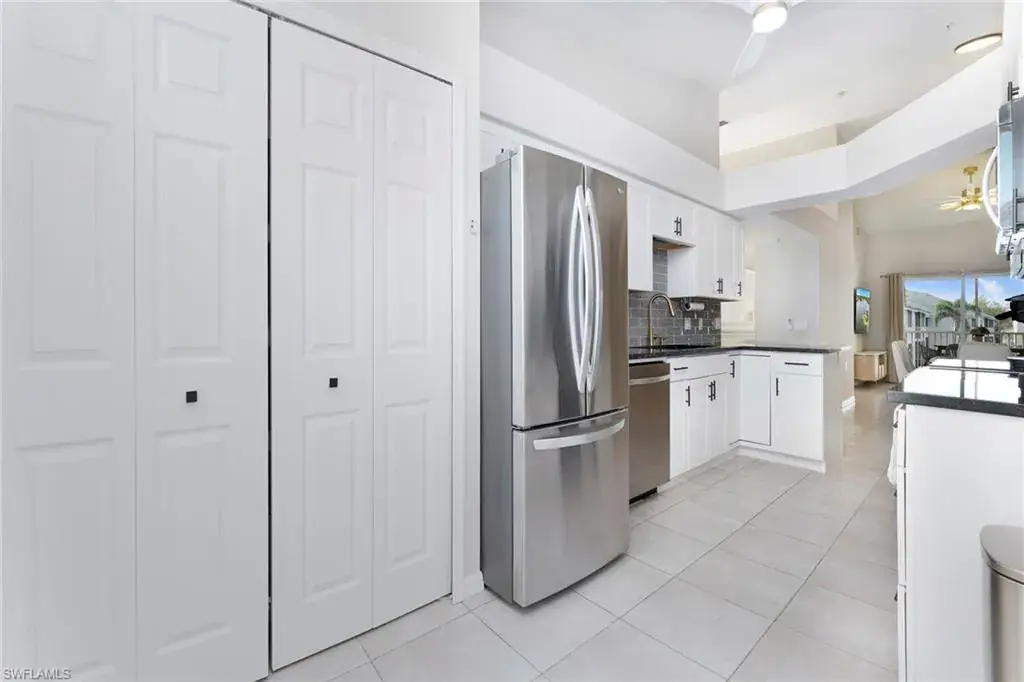 Welcome to your dream home in the heart of North Naples! This second-floor Bermuda Palms end-unit condominium with a garage is being sold furnished and offers a luxurious yet economical lifestyle. Step into this beautifully remodeled two-bedroom plus den, two-bath condominium and be greeted by serene lake and pool views. The updated kitchen features elegant white shaker-style cabinets, a chic subway tile backsplash, granite and butcher block countertops, and sleek matte black fixtures. Modern white and matte gold light fixtures and ceiling fans add a touch of sophistication throughout the home. The spacious floor plan boasts vaulted ceilings in the living room, creating an airy and open atmosphere. The primary bedroom includes a walk-in closet and dual sinks in the newly renovated primary bath. The second bedroom offers privacy for guests, and the remodeled guest bath is located just off the living room. The versatile den is ideal for a bedroom, office, or formal dining room. Enjoy the serene views from the screened balcony overlooking a beautiful water fountain on the lake. This light and bright unit has southern exposure and is tiled throughout, including the lanai, with no carpet. The air conditioner was replaced in 2020, and the water heater in 2024, ensuring your comfort year-round. The garage provides attic storage, and there is an additional assigned parking space for your convenience. Located in the center of the community, this unit is just a short distance from the community pool, spa, and grilling area. Bermuda Palms is off Immokalee and Livingston roads, conveniently near A-plus-rated schools, community parks, and excellent shopping and dining opportunities. Tiburón Golf Club, Seed to Table, and The Galleria Shops at Vanderbilt are nearby, as well as the white sand of Vanderbilt Beach and Wiggins Pass State Park. Don’t miss out on this combination of location, amenities, and low condominium fees.