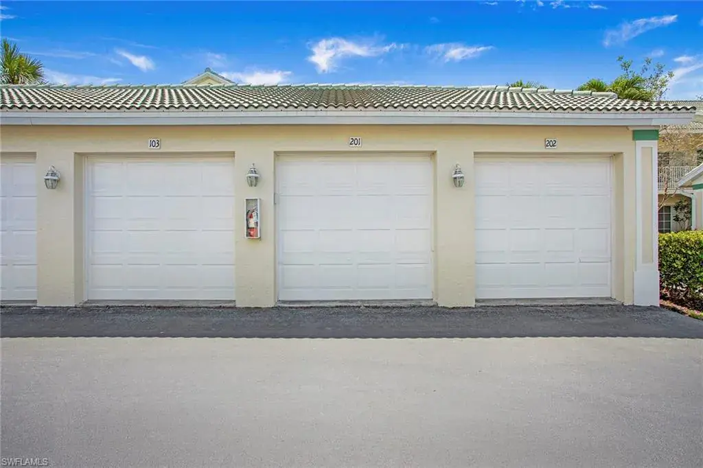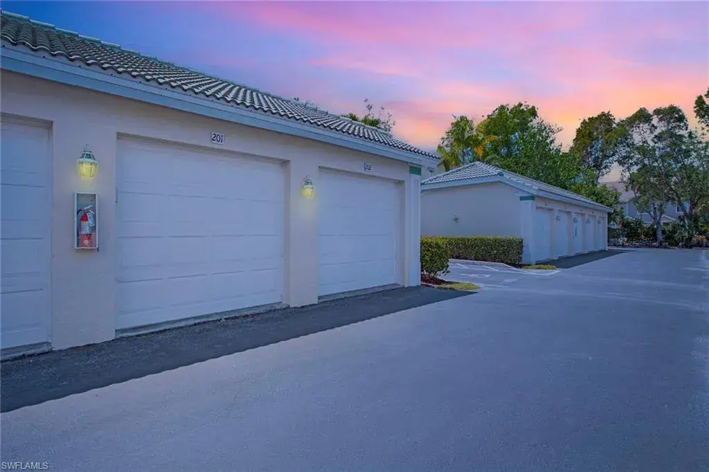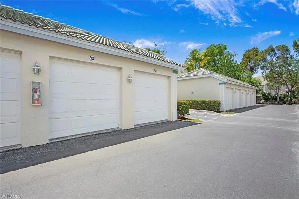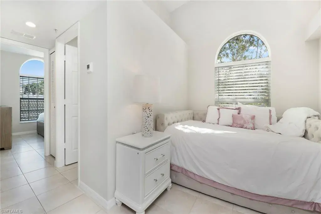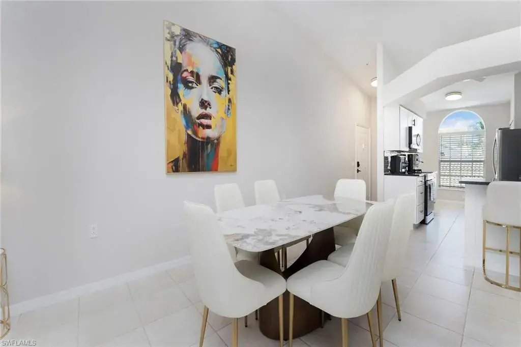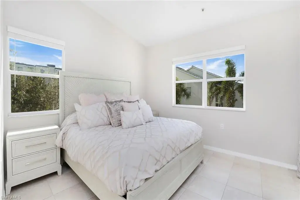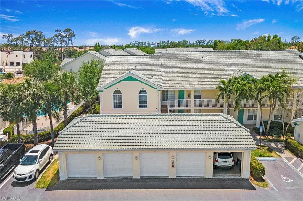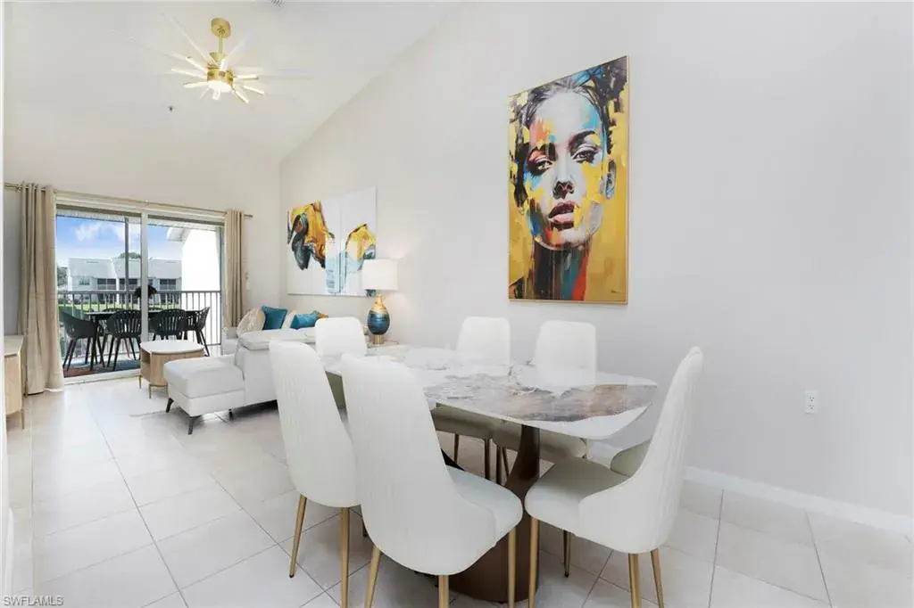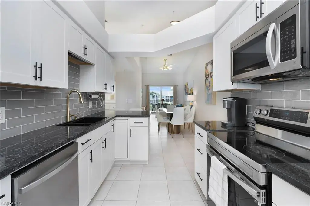 Welcome to your dream home in the heart of North Naples! This second-floor Bermuda Palms end-unit condominium with a garage is being sold furnished and offers a luxurious yet economical lifestyle. Step into this beautifully remodeled two-bedroom plus den, two-bath condominium and be greeted by serene lake and pool views. The updated kitchen features elegant white shaker-style cabinets, a chic subway tile backsplash, granite and butcher block countertops, and sleek matte black fixtures. Modern white and matte gold light fixtures and ceiling fans add a touch of sophistication throughout the home. The spacious floor plan boasts vaulted ceilings in the living room, creating an airy and open atmosphere. The primary bedroom includes a walk-in closet and dual sinks in the newly renovated primary bath. The second bedroom offers privacy for guests, and the remodeled guest bath is located just off the living room. The versatile den is ideal for a bedroom, office, or formal dining room. Enjoy the serene views from the screened balcony overlooking a beautiful water fountain on the lake. This light and bright unit has southern exposure and is tiled throughout, including the lanai, with no carpet. The air conditioner was replaced in 2020, and the water heater in 2024, ensuring your comfort year-round. The garage provides attic storage, and there is an additional assigned parking space for your convenience. Located in the center of the community, this unit is just a short distance from the community pool, spa, and grilling area. Bermuda Palms is off Immokalee and Livingston roads, conveniently near A-plus-rated schools, community parks, and excellent shopping and dining opportunities. Tiburón Golf Club, Seed to Table, and The Galleria Shops at Vanderbilt are nearby, as well as the white sand of Vanderbilt Beach and Wiggins Pass State Park. Don’t miss out on this combination of location, amenities, and low condominium fees.
