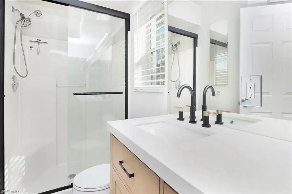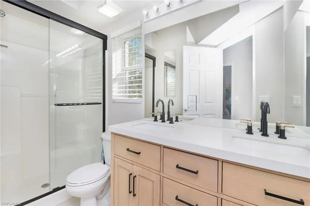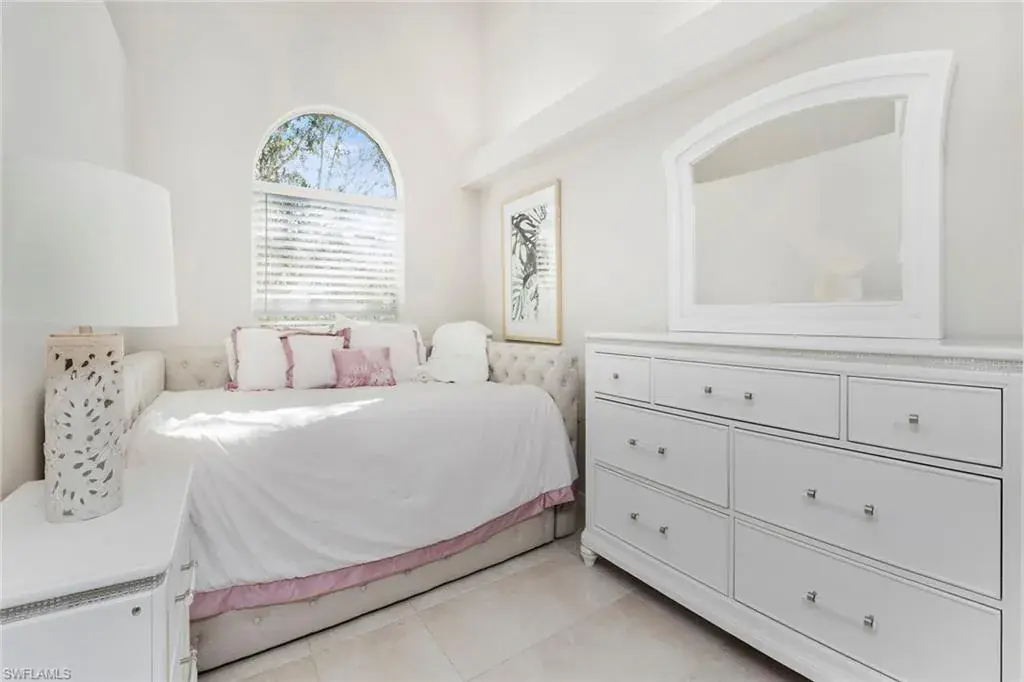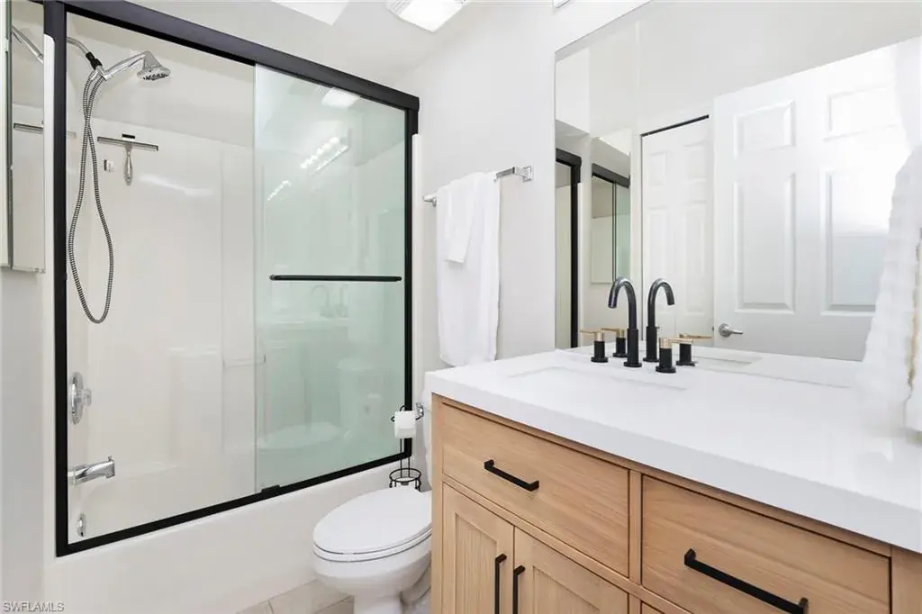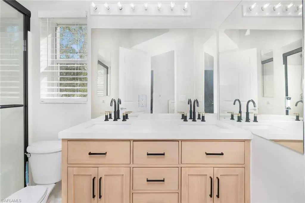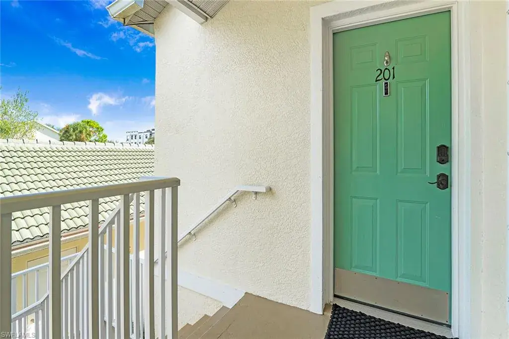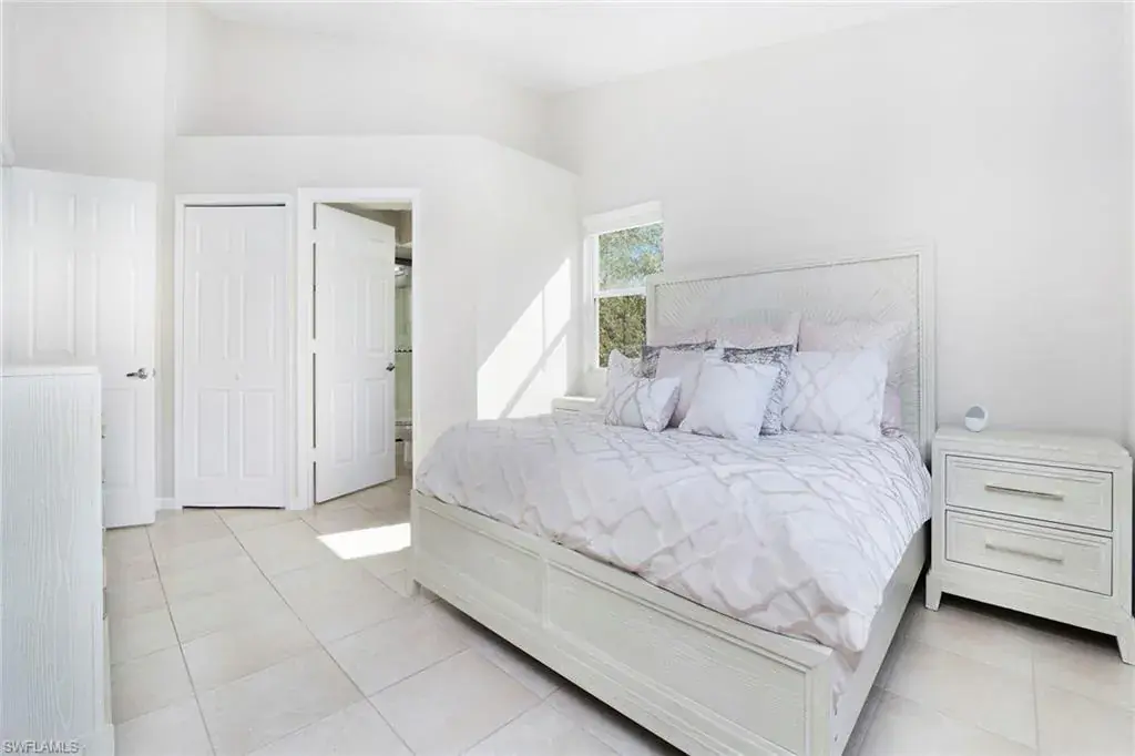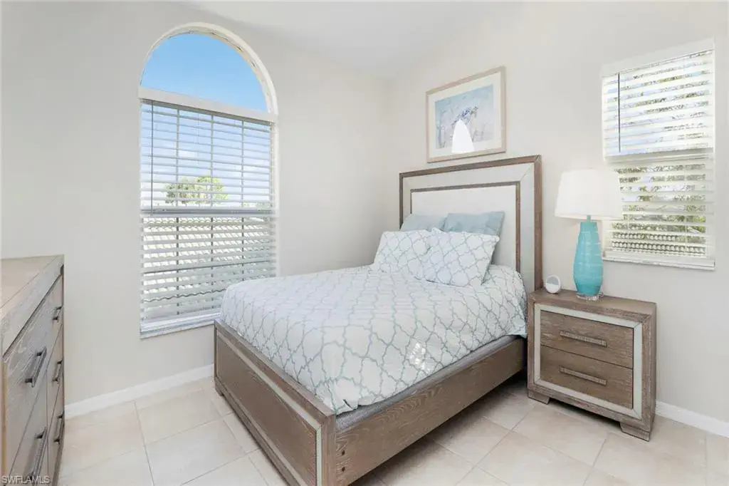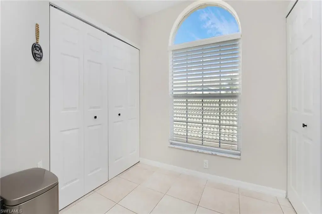 Welcome to your dream home in the heart of North Naples! This second-floor Bermuda Palms end-unit condominium with a garage is being sold furnished and offers a luxurious yet economical lifestyle. Step into this beautifully remodeled two-bedroom plus den, two-bath condominium and be greeted by serene lake and pool views. The updated kitchen features elegant white shaker-style cabinets, a chic subway tile backsplash, granite and butcher block countertops, and sleek matte black fixtures. Modern white and matte gold light fixtures and ceiling fans add a touch of sophistication throughout the home. The spacious floor plan boasts vaulted ceilings in the living room, creating an airy and open atmosphere. The primary bedroom includes a walk-in closet and dual sinks in the newly renovated primary bath. The second bedroom offers privacy for guests, and the remodeled guest bath is located just off the living room. The versatile den is ideal for a bedroom, office, or formal dining room. Enjoy the serene views from the screened balcony overlooking a beautiful water fountain on the lake. This light and bright unit has southern exposure and is tiled throughout, including the lanai, with no carpet. The air conditioner was replaced in 2020, and the water heater in 2024, ensuring your comfort year-round. The garage provides attic storage, and there is an additional assigned parking space for your convenience. Located in the center of the community, this unit is just a short distance from the community pool, spa, and grilling area. Bermuda Palms is off Immokalee and Livingston roads, conveniently near A-plus-rated schools, community parks, and excellent shopping and dining opportunities. Tiburón Golf Club, Seed to Table, and The Galleria Shops at Vanderbilt are nearby, as well as the white sand of Vanderbilt Beach and Wiggins Pass State Park. Don’t miss out on this combination of location, amenities, and low condominium fees.