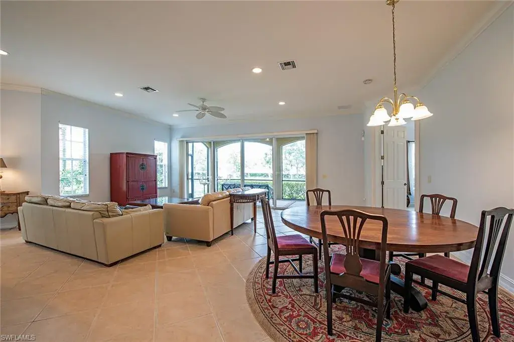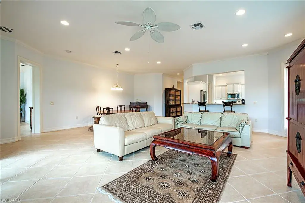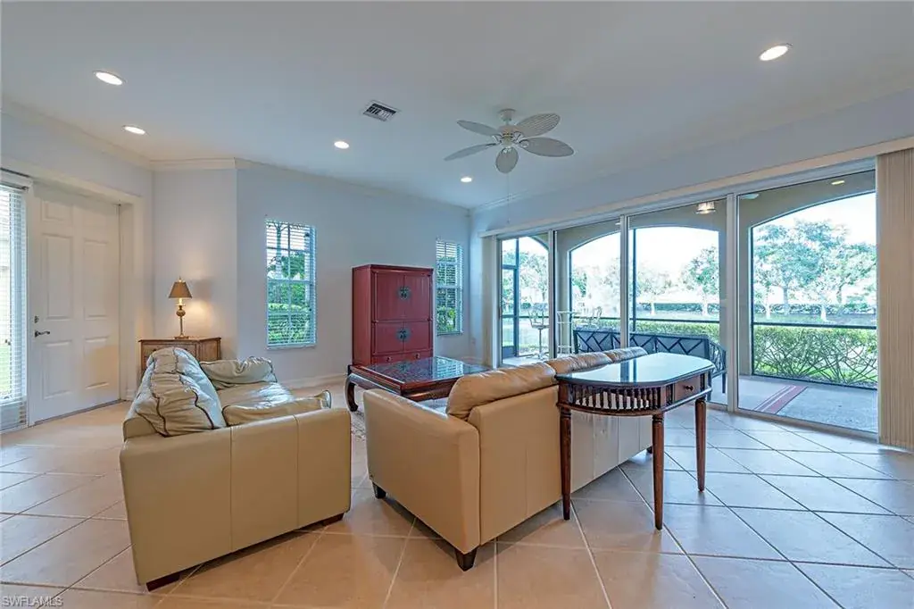 This first-floor coach has three bedrooms, two baths, and an updated kitchen with granite and stainless steel appliances. The kitchen is open to the great room and lanai for socializing with family and guests. Note the 10-foot high ceilings that add to the spacious feeling of this coach home. A private two-car garage is on the same level as the home to allow for convenience. The entire home was recently painted inside and is fresh and spotless. Enjoy a beautiful view of the fountain, lake and wildlife from the screened lanai. A new A/C in 2021 will keep you cool inside or enjoy the community pool and spa outside that are steps away. All exterior maintenance is covered in the Reserve II association dues. A new roof was installed in 2022 with no assessments. The gated community of Banyan Woods has amenities that include a community fitness center, a clubhouse, a playground, and a basketball court. Great location within minutes to Gulf beaches, great dining, and shopping! Come for the season, stay for a lifestyle!