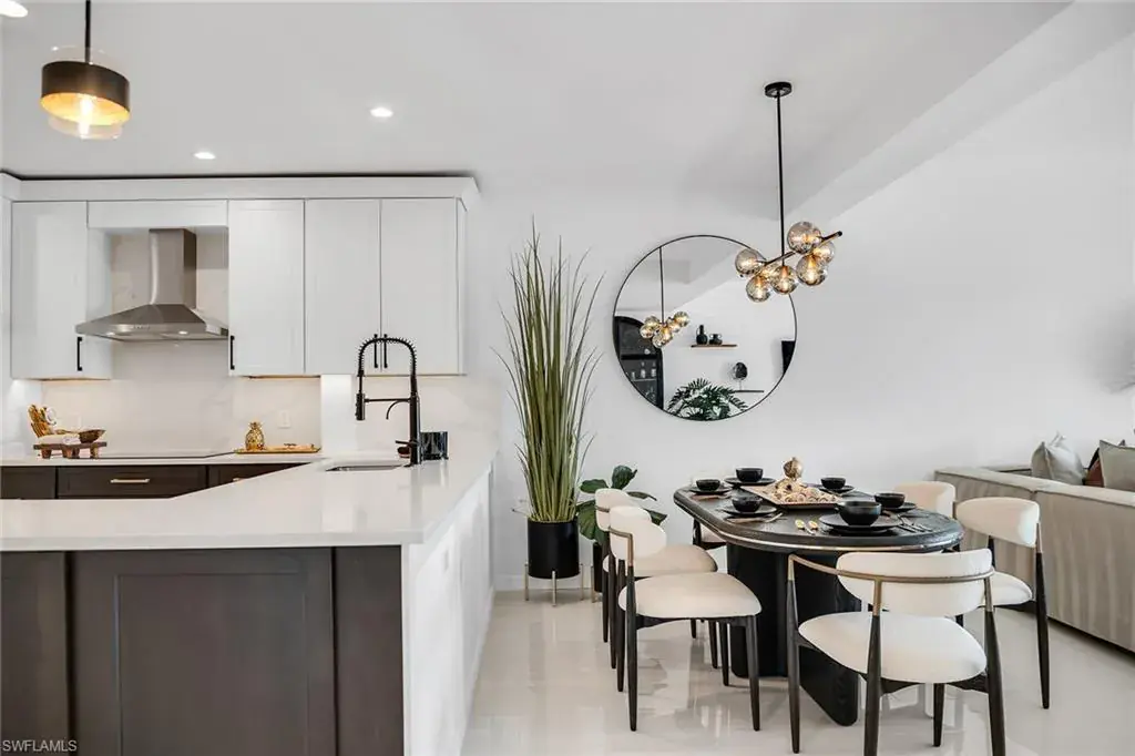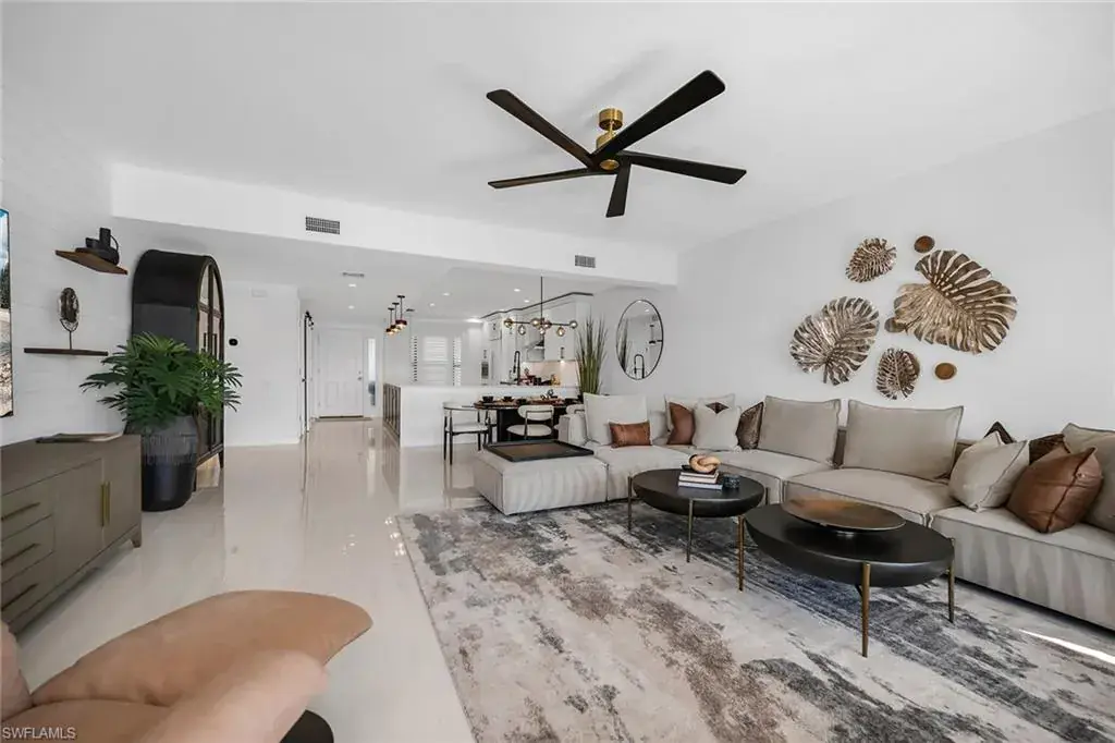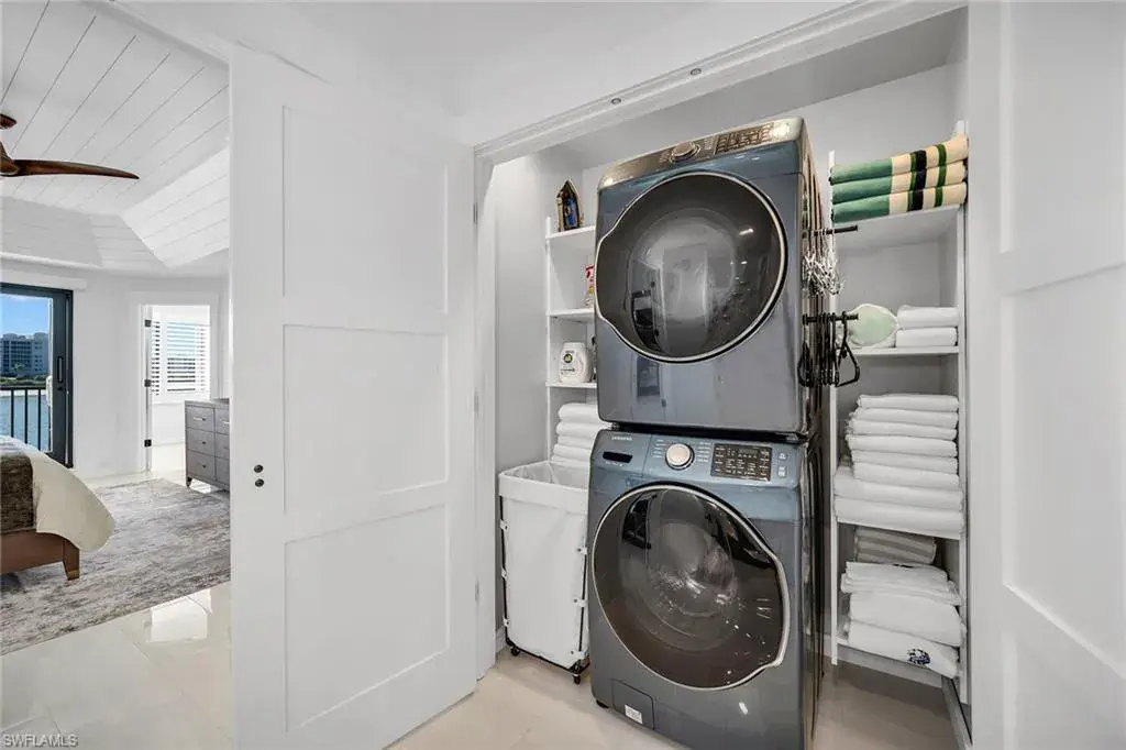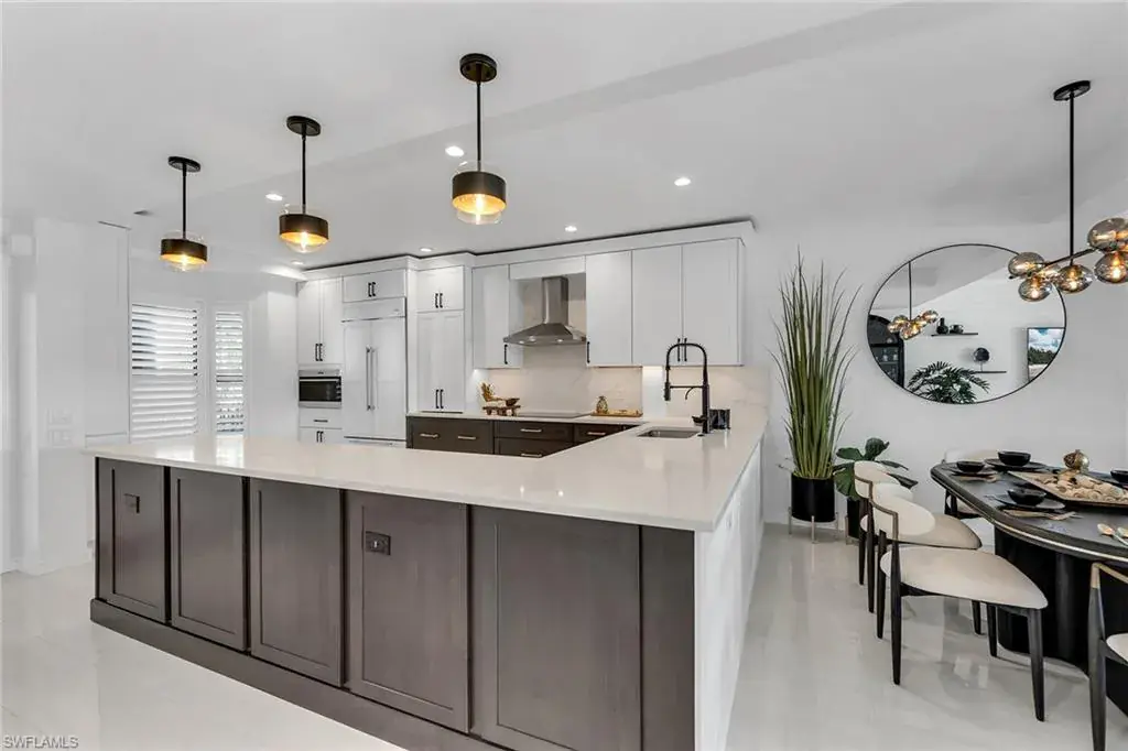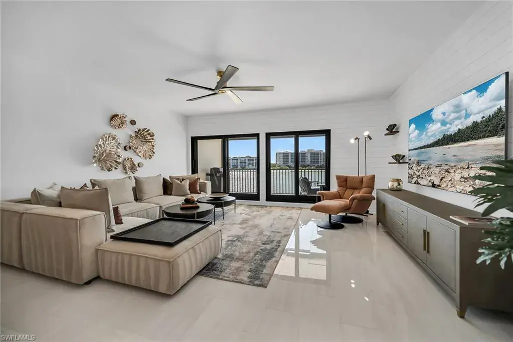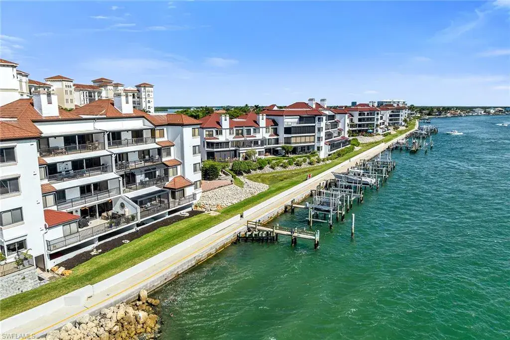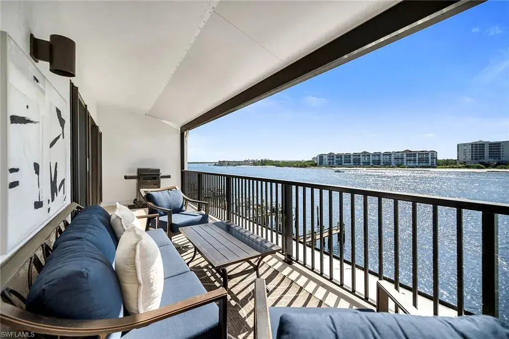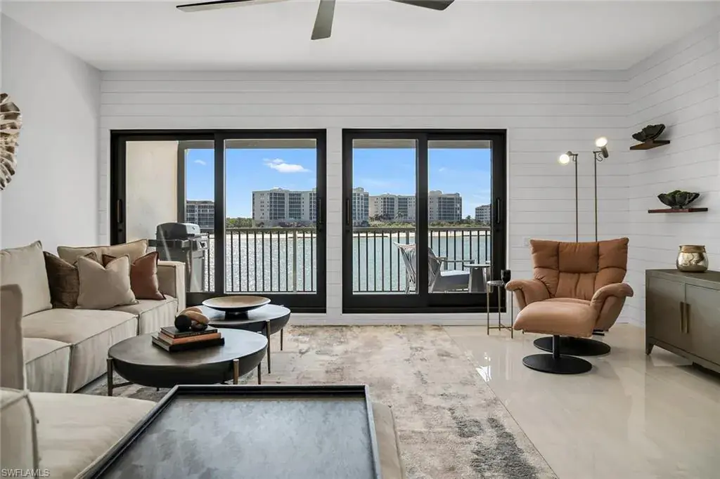 Experience mesmerizing southwest exposure and breathtaking, ever-changing water views from this fully reimagined luxury residence in the prestigious waterfront community of La Peninsula. Positioned to capture sweeping vistas where the Marco River meets the Gulf, this sophisticated third-floor retreat offers front-row views of dolphins, manatees, stingrays and passing boats, all enjoyed from the covered lanai with impact sliders and windows that provide year-round peace of mind. Nearly 1,800 square feet of inspired living space showcases an open-concept design by LivingStyles Interiors, blending coastal elegance with contemporary refinement throughout its spacious two-bedroom, 2.5-bath floor plan with a dedicated garage space. Inside, high-gloss polished porcelain tile flooring, shiplap accents on walls and ceilings, recessed lighting and modern fixtures set an elevated tone. A transformative 2023 remodel opened the main living areas, creating a seamless flow that highlights panoramic water views from every angle. Expansive glass invites natural light to illuminate beautifully curated furnishings and custom enhancements, including built-in shelving, upgraded doors and trim, and thoughtful storage solutions. The gourmet kitchen impresses with solid wood cabinetry, striking quartz countertops, under-cabinet and toe-kick lighting, and premium appliances including a Sub-Zero refrigerator, Wolf induction cooktop and speed oven, and an ultra-quiet Bosch dishwasher. A commercial-grade disposal and water filtration system add everyday convenience, while modern upgrades extend throughout the home with fully redesigned baths featuring basket-weave tile flooring, marble-topped vanities, and a spa-inspired primary suite boasting an expanded shower and freestanding soaking tub placed to capture the tranquil views. The primary suite also offers an oversized custom-designed closet for exceptional organization. Additional enhancements include a new Trane furnace and air conditioner, a Rheem water heater, upgraded electrical throughout, and the convenience of a dedicated garage parking space, along with private storage locker. Storm protection with impact windows and doors ensures comfort and security. Outdoors, a private dock with two lifts provides the ultimate amenity for boating or quiet waterfront leisure. Residents of La Peninsula enjoy a beautifully refreshed clubhouse with a library, game room and fitness center, along with a tropical waterfront pool and active social scene. Upcoming plans for a new sports complex, including pickleball, tennis and bocce courts, further elevate the coastal lifestyle. Milestone/structural inspection has been completed and passed with no assessments.