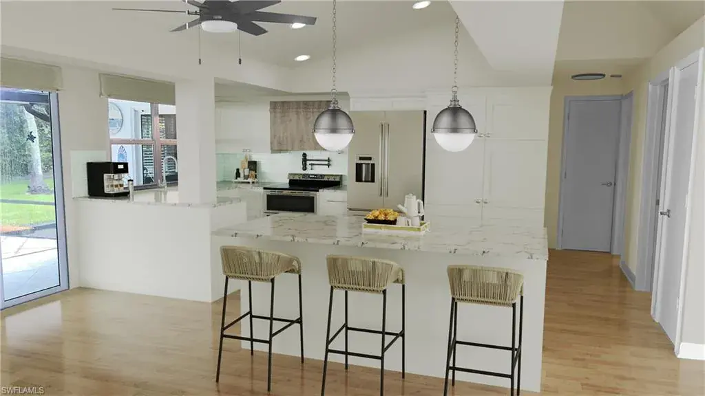 NEW TILE ROOF COMING DECEMBER 2024 ~ SUPERIOR LOT AND PRIVACY AND NO HOA FEE! Sellers have moved and are ready for an offer! Welcome to 560 Cypress Way East in sought after Palm River Estates. This 3 Bedroom, 4 Full Bath Home has a 2-car garage, a beautiful salt water pool and so much privacy with La Playa Golf Course behind this home. Situated on a .29 acre lot with so many updates including hurricane impact windows in over 90% of the home as well as an updated kitchen, new appliances and 2 Ensuite Master Bedrooms both with completely updated Bathrooms. Please note our Reality Renovated Kitchen Picture #4! The pass through window off of the kitchen is part of the charm of this style home with over 950 square feet of lanai area with lots of entertainment space and the 4th Full Bathroom is outside and easily accessible from the pool area. These sellers have lovingly cared for this home with a newer water heater, HVAC System and pool equipment all within the last 2 years or newer. There are NO HOA fees and it has great area schools. One photo of the kitchen includes virtual renovation. *THIS PROPERTY INCLUDES DESIGN SERVICES, MAKING UPDATES, AS SHOWN, EASY FOR YOUR BUYER*