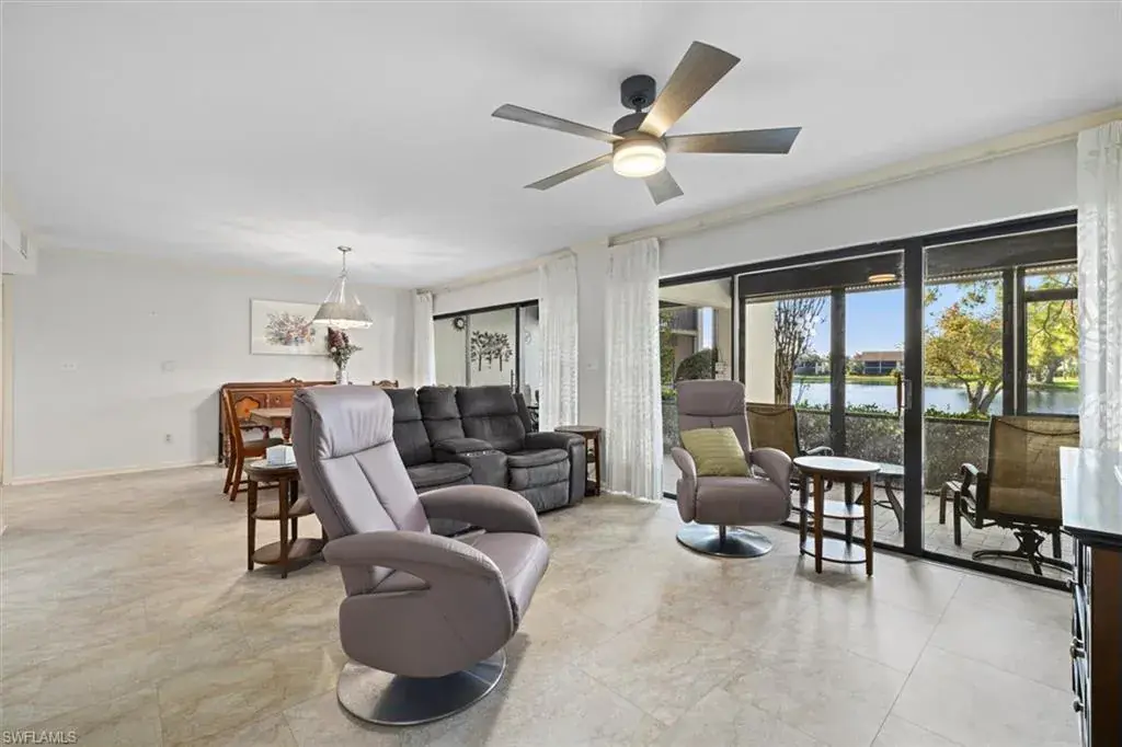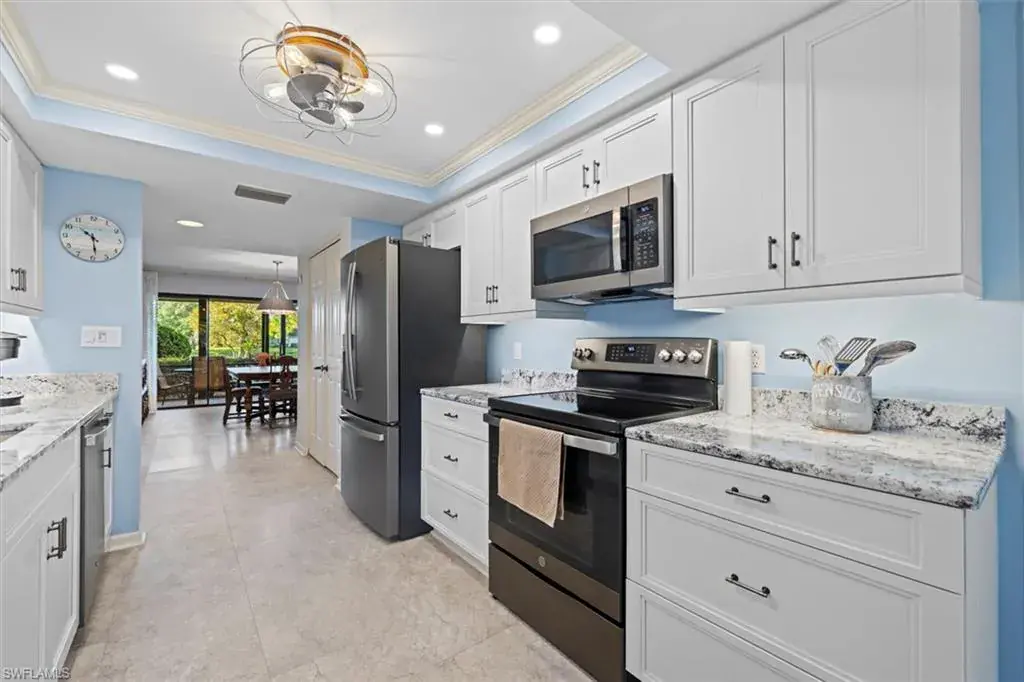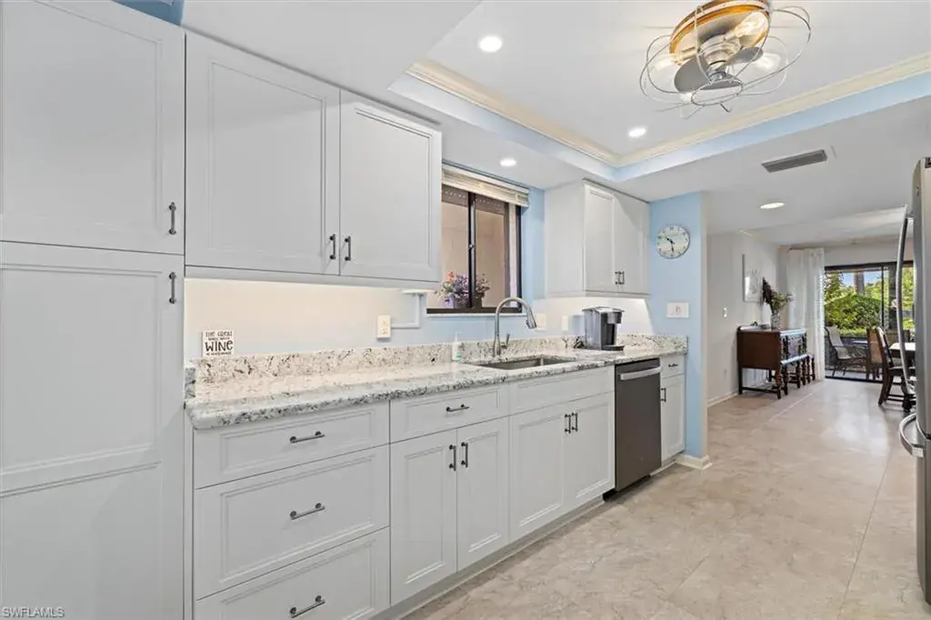 Significant Price Reduction! Experience the beautiful North Naples living in this exquisite first-floor condo complete with its own garage, just minutes away from Vanderbilt Beach and Delnor-Wiggins Pass State Park. A quick 5-minute drive lands you at Mercato, ensuring convenience and accessibility to all Naples has to offer. Step inside to discover pristine tile floors throughout, a kitchen boasting state-of-the-art stainless-steel appliances, tray ceilings, shaker cabinets, and quartz countertops, complemented by a breakfast nook. Beyond the kitchen lies a private courtyard, enveloped by a serene privacy wall and professionally landscaped greenery, offering an idyllic setting for entertaining guests. The expansive living room is adorned with a spacious lanai, which floods the space with natural light, seamlessly merging indoor and outdoor living. The well-designed floor plan offers split bedrooms, with the potential for a third, each featuring walk-in closets and sliders leading to private, screened-in sitting areas. The primary bedroom boasts an ensuite bath and walk-in shower. Additional highlights include a separate laundry room within the unit, a newer AC, and a water heater. Community amenities include a pool and an optional 18-hole golf course, all within arm’s reach. Beautiful nature preserves walking trails and a short walk to the pool! Plus, with a 24-hour gated guard staff, security is never a concern. The Quarterly HOA dues have been paid for July, August, and September! Take advantage of the shopping and dining options just beyond the gates, completing this unparalleled living experience.