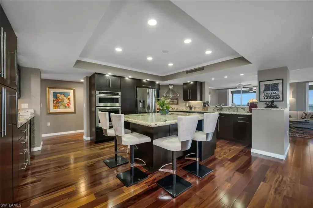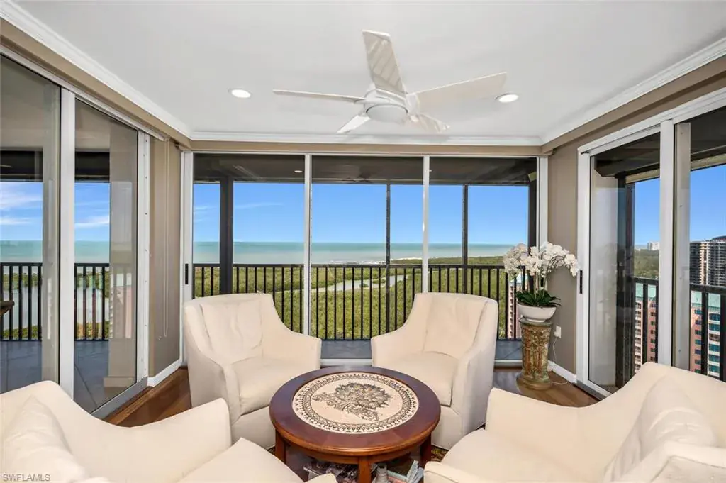 C9375. Enjoy magnificent sunsets and sunrises from this 20th-floor elevated residence with unobstructed Northwest views of the Gulf of Mexico. This unit was completely remodeled, and upgrades to the home include solid core doors, hardwood floors, a spacious open kitchen with a large island, and so much more! The large open floor plan living area opens to a screened lanai and boasts fantastic gulf views. The split bedroom floor plan offers a primary bedroom with a large walk-in closet and a luxurious bath. The Stratford at Pelican Bay is a 5-Star building offering tennis, pickleball, a fire pit, a grilling area, underground parking, and a call box for tram pick up. Residents of Pelican Bay enjoy exclusive amenities, including two private beach clubs and restaurants, two tennis complexes, and a community center with a wellness center. Private transportation to the beach clubs is also provided via tram, creating the ultimate lifestyle combining elegance, privacy, and beautiful stretches of white sand, as well as a short 2 1/2 block walk to Artis Naples (Performing Arts Center). Waterside shops is a short stroll away featuring an Apple Store, Tesla Dealership and World Class Restaurants.