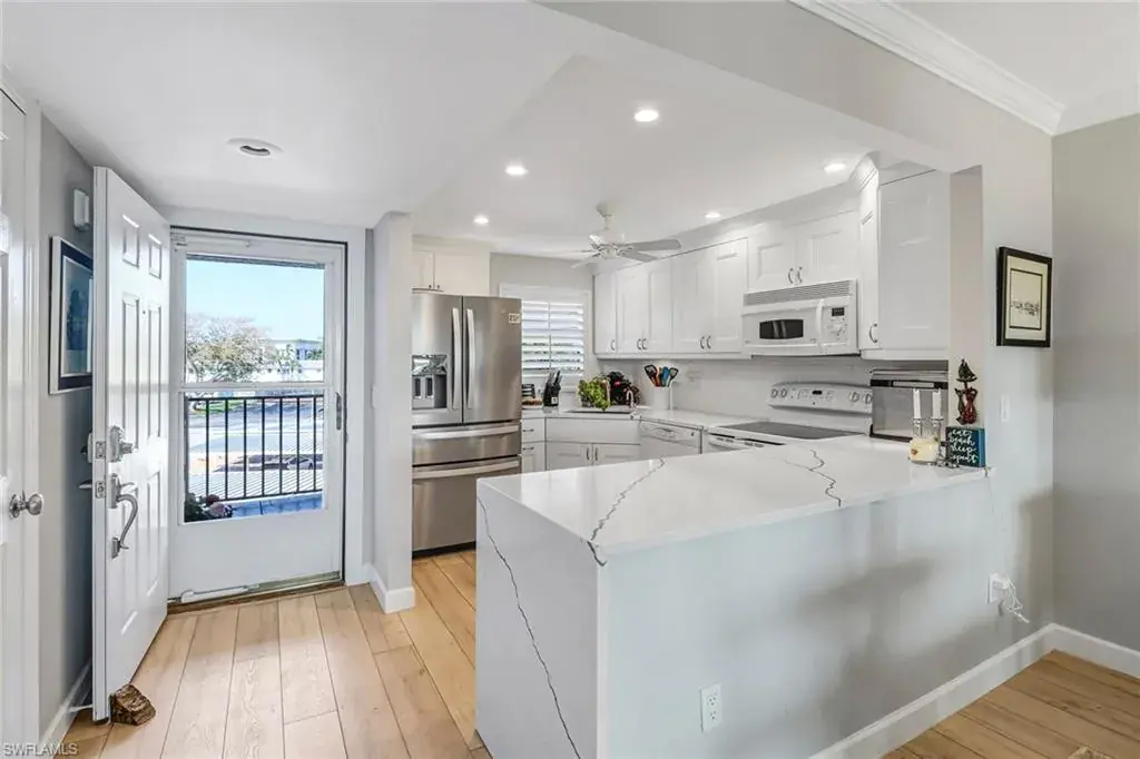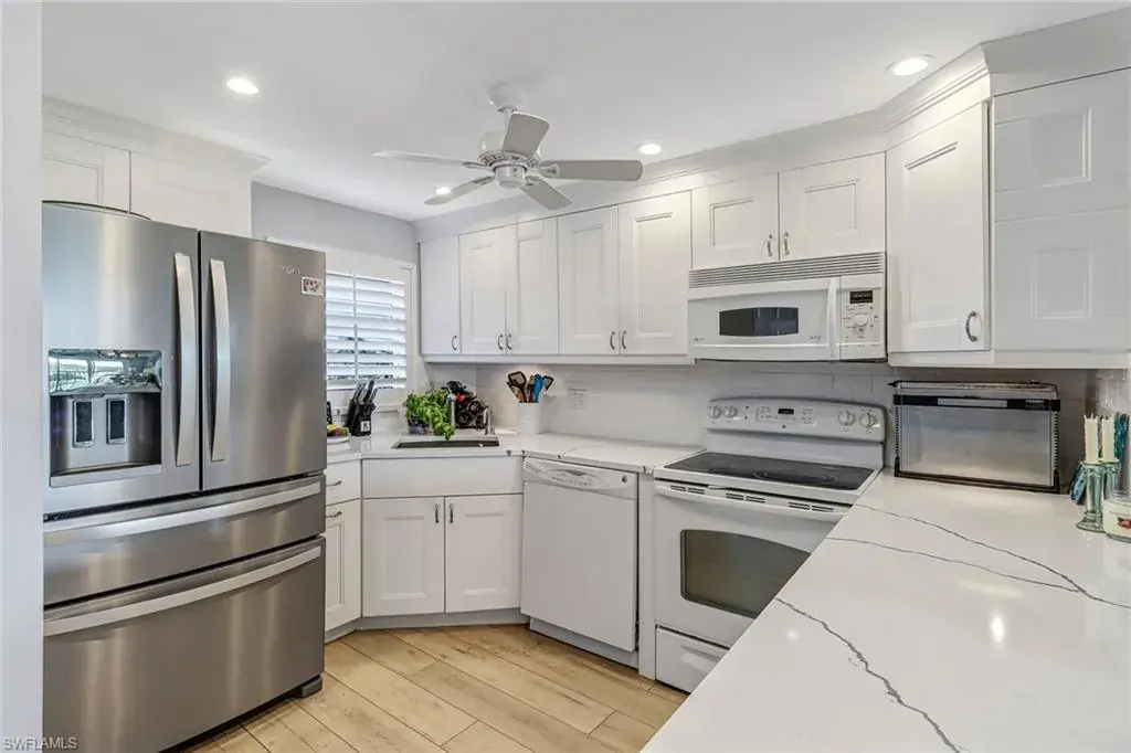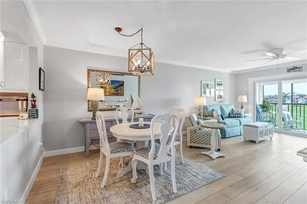 Exquisite, exceptional, turnkey and next to Clubhouse with over $90,000 in recent updates plus amazing views of the golf course, practice putting green, First Hole Tee Box, lake and fountain. No expense has been spared in this tastefully remodeled 2 bedroom, 2 bath condo which includes free golf. Gorgeous white kitchen cabinets with quartz counters and waterfall; raised kitchen ceiling with cam lights; newer Refrigerator; COREtec coastal flooring throughout. The master bedroom has 2 closets. The new Master Bath and Guest Bath have beautiful tiled showers. All ceilings are smooth with crown moldings. Both quality and attention to detail show in plantation shutters; New electronic storm shutters by Storm Smart; Hunter Douglas Lanai shade; A/C-3 years; Hot Water Heater 2021; Honeywell wifi thermostat 11/18; 5 ceiling fans; 4 new 6 panel solid core doors; New sliding doors frame the living room and lanai. HPCC is a bundled golf community where the quarterly includes everything except electric. Enjoy free golf, 6 pools, tennis, pickleball Clubhouse, and gym. No Ian damage and just minutes to the Beach, 5th Ave, Waterside Shops, Venetian Village, Mercado, nightlife and shopping.