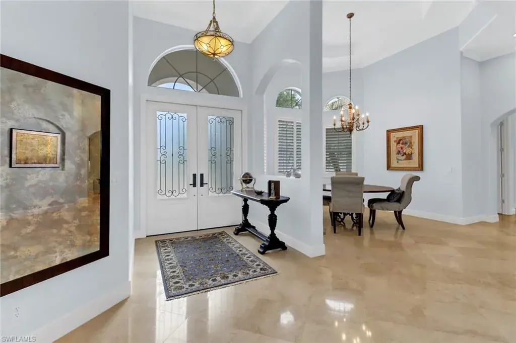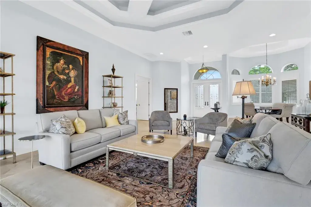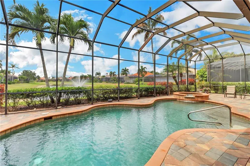 Be immediately captivated by the understated, casual elegance of this beautiful three bedroom/den/3.5 bath estate pool home-Bolstered by a gorgeous long lake and fountain view with a sunny, southern exposure. Luxuriously comfortable, the master suite offers his/hers walk-in closets, newer wood flooring, sitting area and new French doors to the lanai. Guest bedrooms are spacious with high ceilings, plantation shutters and walk-in closets. Grand dimensions define the den with wood floor, bay windows, and lake view. The kitchen has been updated with quartz counters, glass tile backsplash and newly re-designed cabinets featuring pullout storage drawers, new hardware plus warm, wood island and vent hood. Newer, Bosch dishwasher and fridge, induction cook top plus wall oven and microwave complete the kitchen. Original A/C systems replaced, windows and doors are high impact and hurricane screens on the lanai. The three-car garage and laundry room abound with storage. Beckoning enjoyment, the outdoor living area with pool, spa and custom grill/kitchen extends the beauty and function of the home. This estate home is perfect for full-time or seasonal living.