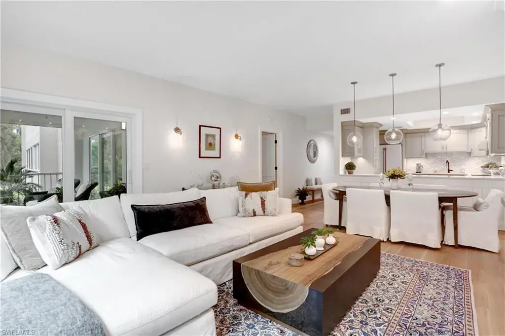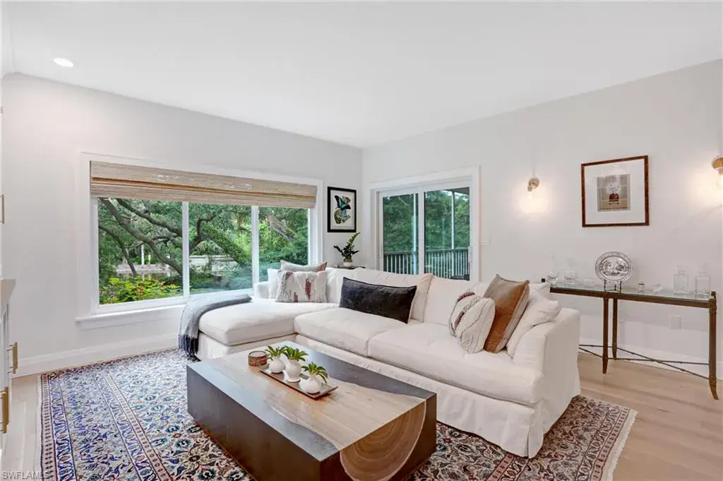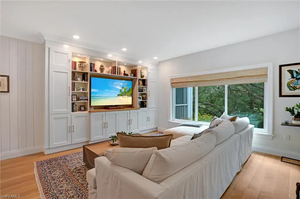 Rare opportunity to own in this low rise coastal community. Stunning 2020 renovation!! Enjoy the Bright and open floor plan. Interior features include, tasteful decor throughout, high end finishes, wood flooring, top of the line cafe’ appliances, new doors, hardware, storm sliders and window, custom built entertainment area, beautiful renovated master and guest bathrooms. Spacious den can easily be used as a third bedroom. Exterior features a screened lanai with sunny southern exposure, lake view, tropical flora and natural protected Mangrove preserve landscape. The custom decorated furnishings are available separately. Located steps to the tram for beach access. Pelican Bay amenities include three miles of beachfront, two private beachfront pavilions, kayaks and canoes for resident use, miles of walking paths, fitness center, tennis. Located between upscale Waterside shops, restaurants and the Ritz Carlton Beach Resort.