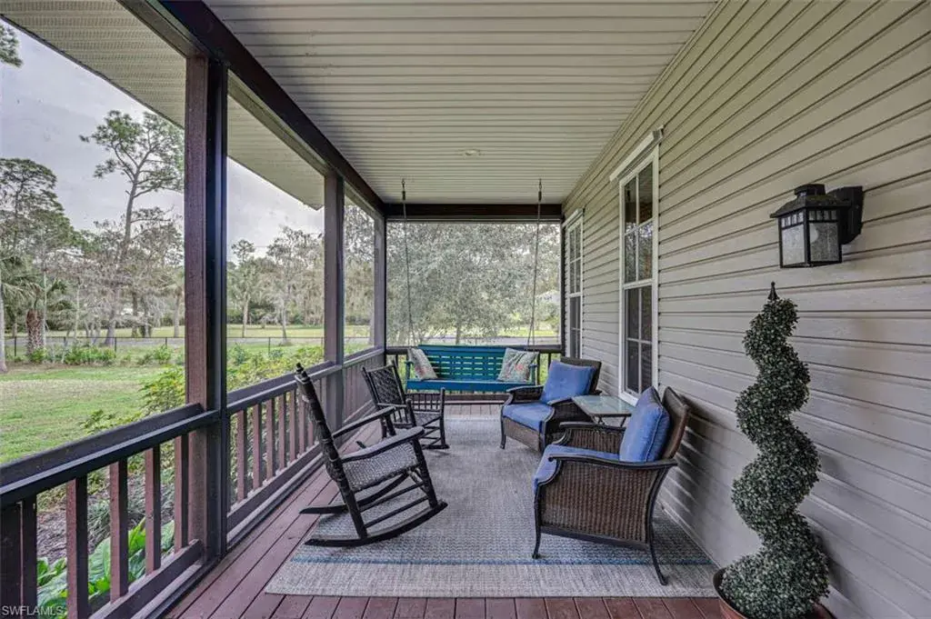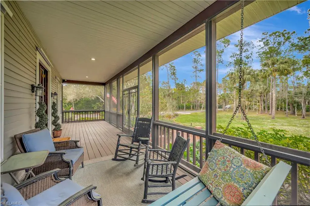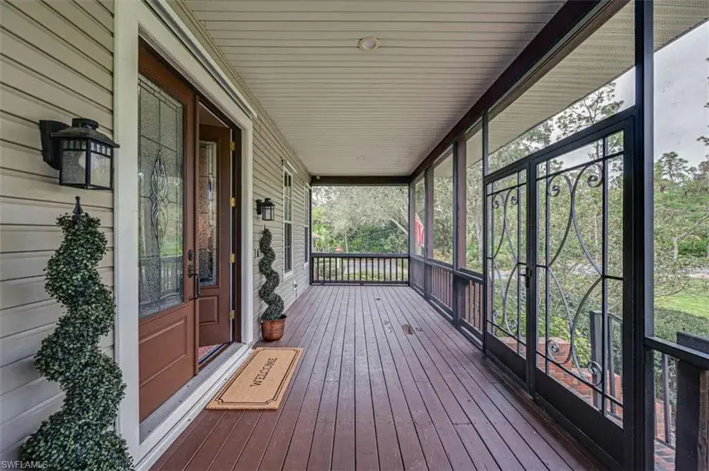 Tucked away in the sought-after Oakes Estates neighborhood, this sprawling country estate sits on nearly 3 acres of beautifully landscaped land in North Naples. As you arrive, a large paved driveway leads you to a detached garage for three cars and a sprawling screened porch at the front – the perfect spot to enjoy the peaceful surroundings. Inside, a grand two-story foyer welcomes you, setting the tone for the rest of the home. On the main floor, you’ll find a formal dining area and a cozy study, along with a handy half-bathroom nearby. Moving further in, the heart of the home unfolds – an open-plan living area that’s both comfortable and great for entertaining. The kitchen is a chef’s dream with plenty of storage, a big island, and a built-in desk. There’s also a casual dining area that flows seamlessly into the living room, where you can relax and hang out with family and friends. The master suite on the main floor offers a peaceful retreat, complete with all the luxuries you could want. French doors open out onto the porch, blurring the lines between indoor and outdoor living. A separate seating area adorned with an electric wall, fireplace for added ambiance, while the master bath offers a clawfoot tub for those much needed relaxing soaks. Upstairs, you’ll find three more bedrooms, including one with its own bathroom. The unique dormer shower adds a fun touch, and there’s also a big bonus room that you can use however you like. Outside, there’s a resort-style pool surrounded by a brick deck, perfect for soaking up the Florida sun. And there’s even a fenced area where your pets and kids can play safely. Enjoy the already started garden, or evenings around the fire pit. Located close to Interstate 75, top-notch schools, and plenty of shopping and dining options, this country estate offers the best of luxurious living in Naples. Plus, with full hurricane protection in place, you can rest easy knowing your home is safe and secure. Come experience the laid-back luxury of country living in this remarkable home – where every detail is designed for comfort and enjoyment.