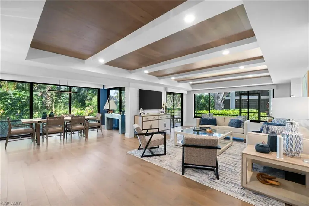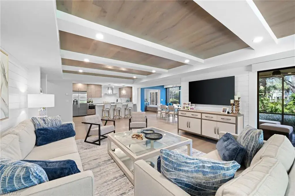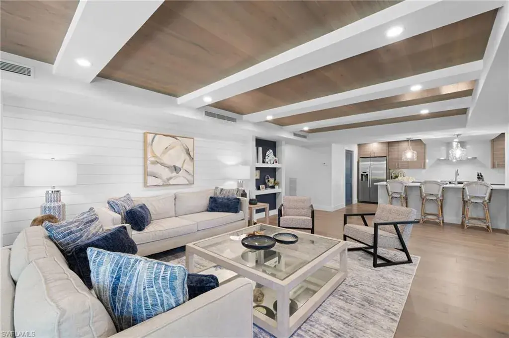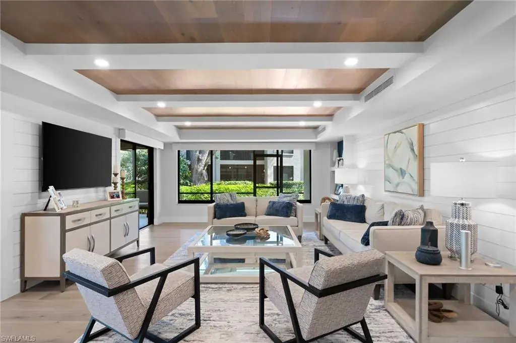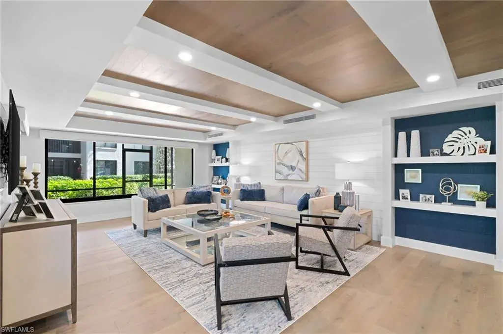 Completely and Totally RENOVATED and FURNISHED 3 bedroom condo in a chic style by Ashmore Designs awaits the descriminating buyer. Do nothing but move right in. This home was stripped down and new plumbing, new electrical, new dry wall and new new everything came to life. Open concept floor plan is anchored by neutral French Oak wood floors and capped by wood designed ceilings punctuated by crisp white beams! Walls of glass sliders make a sunlit garden home while remote shades give night privacy. The transitional kitchen is a combination of wood cabinetry and white Quartz counters matching the backsplash wall. You will thrill to welcome out of town guests in comfortably furnished bedrooms, a large gathering dining table, and outdoor space. The screened Lanai is glorious and beckons for morning coffee or a late night glass of wine listening to the trickle of the water feature and the crickets. Plan your day around walking to the Waterside Shops and Restaurants or taking the Tram to the incredible Beach Clubs which is reason enough to live and belong to Pelican Bay. Dont miss this one as you have nothing to do but move in and enjoy!!!