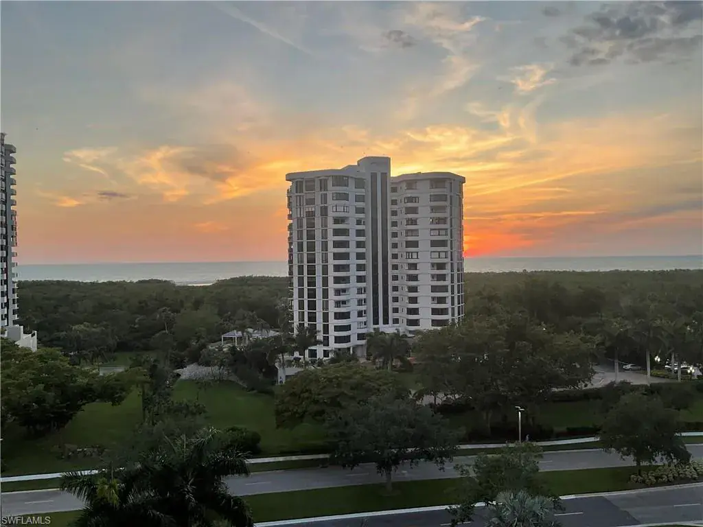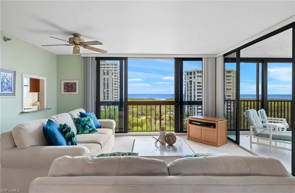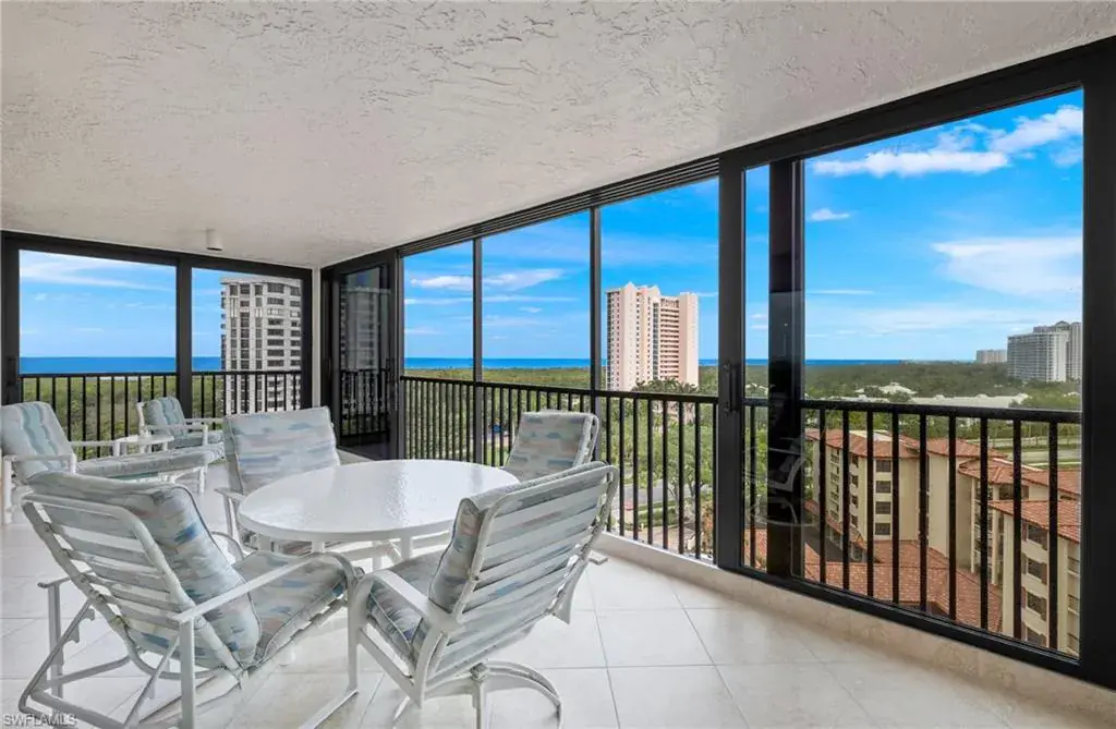Welcome to this highly coveted corner end unit on the 8th floor, offering breathtaking 270-degree wrap-around views of Clam Pass, the beach, the gulf, stunning sunsets, as well as a lake and golf course. Nestled within the prestigious Chateaumere community in Pelican Bay, this exquisitely furnished condo embodies paradise in the sky. With two bedrooms and two bathrooms, the open-concept layout invites a seamless flow from one room to the next, enhancing comfort and ease. The living area is bathed in natural light thanks to large impact-resistant windows and sliding glass doors, showcasing extraordinary panoramic vistas. The eat-in kitchen offers full views of the gulf and beach, perfect for dining with a view.