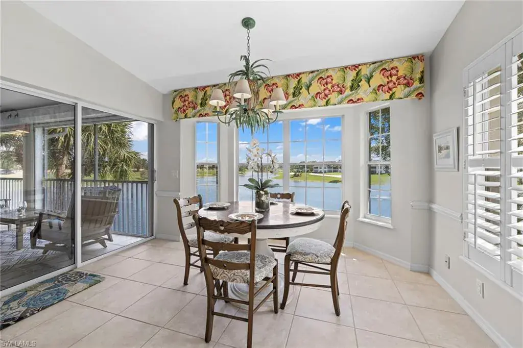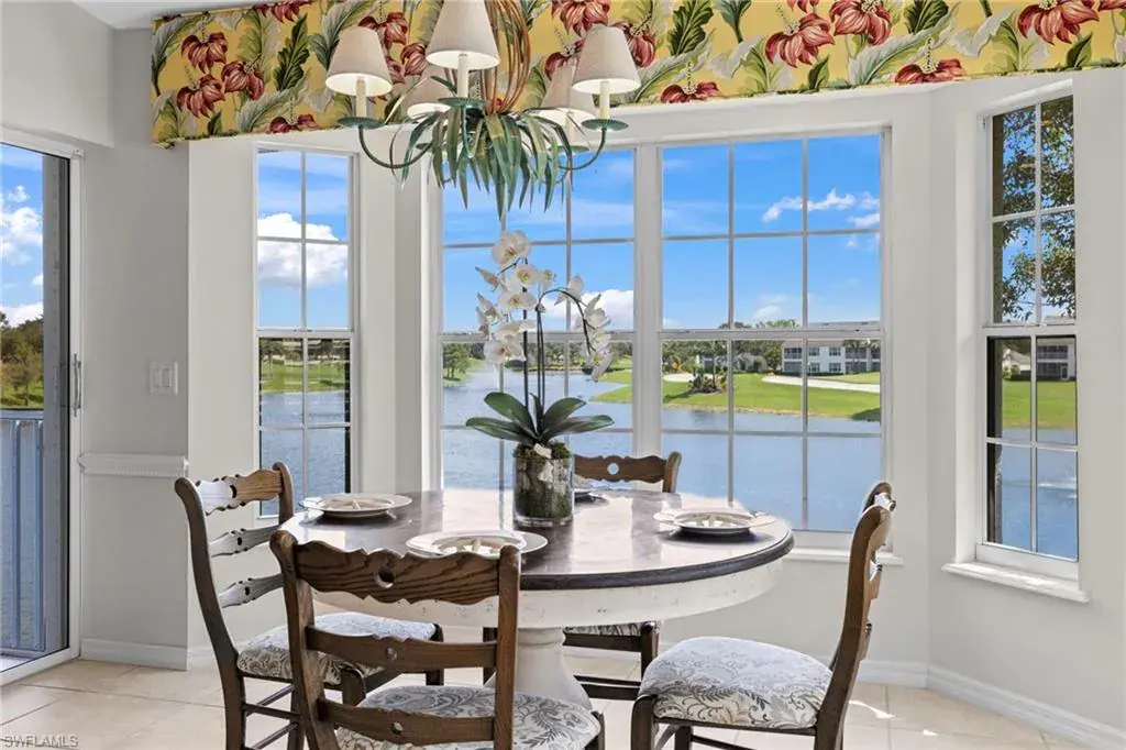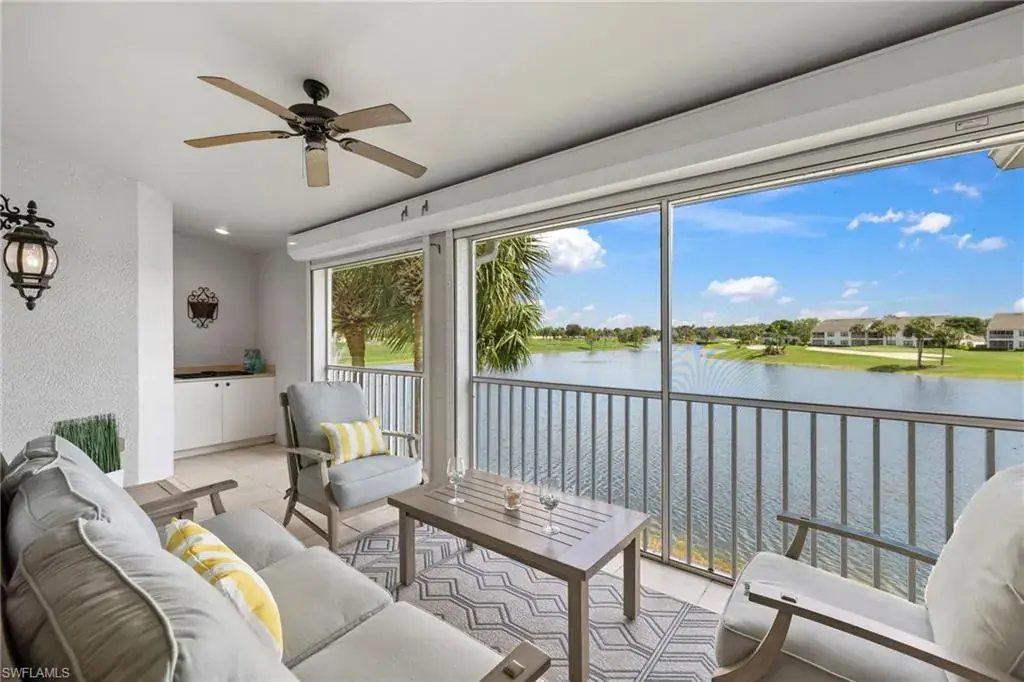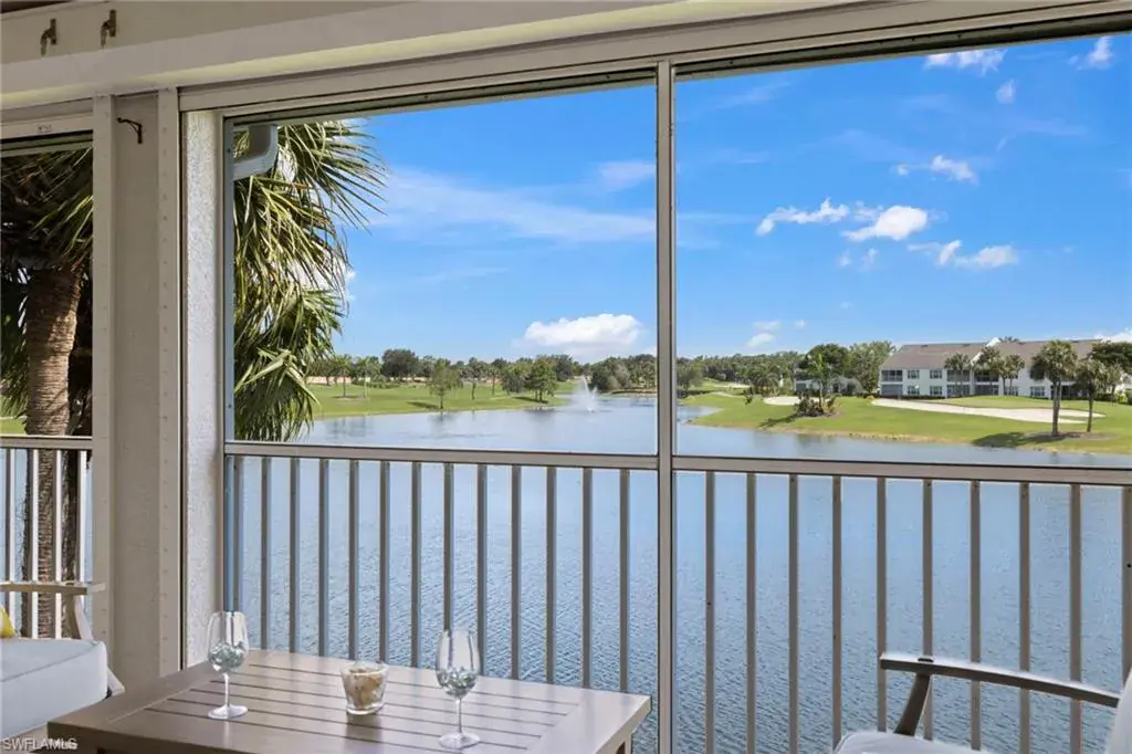 Enjoy afternoon cocktails or morning coffee on the spacious screened balcony while overlooking the sparkling lake and golf course. This spacious upper level coach home w/vaulted ceilings is being offered Turnkey (w/exclusions), & equipped with your own private glass elevator in the highly desirable, amenity rich, gated community of The Strand. This light & bright 3 bedroom +Den w. lots of windows,offers spectacular, expansive & serene lake, fountain & golf course views from not only the balcony but also the Kitchen, and Primary Suite. features an Eat in Kitchen & Breakfast Bar, separate Dining area with built-in Bar that enjoys views of the sparking lake & golf course along with the living room. Addtl features: spacious 2 Car garage w/ tub, plantation shutters thru out, electric storm shutters. The Strand is a active community with social, sport, and golf memberships available. Junior Olympic Lap Pool, Pickleball & Har-Tru Tennis Courts, stunning Fitness complex & Spa, Bocce Ball, Croquet, multiple restaurants.  The Pinnacle features it’s own community Pool & Clubhouse located mins from I-75, easy access to Downtown Naples upscale Shopping & Dining, and SWFL International Airport.