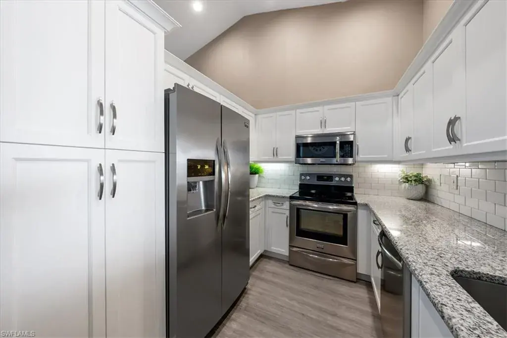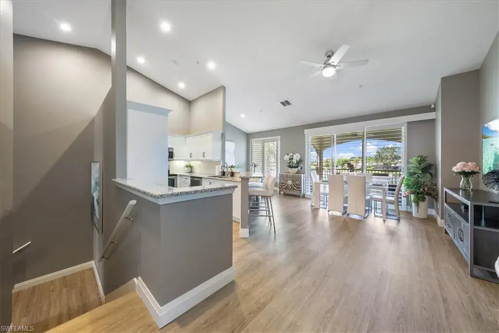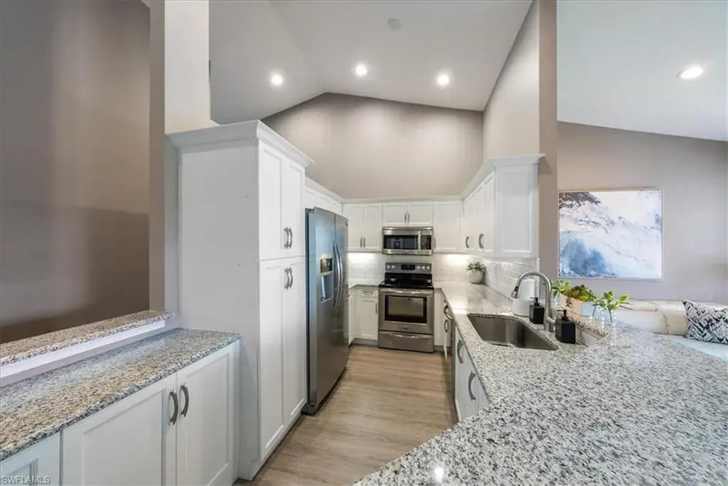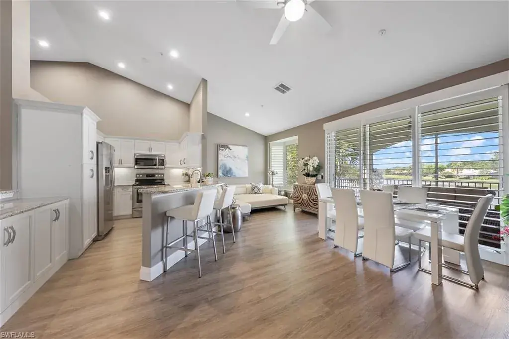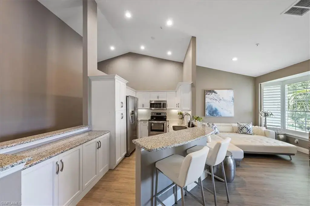 Welcome to tranquil lakeside living in the heart of Naples! This 3 bed, 2 bath, 1 car attached garage second floor unit is perfectly located to enjoy beautiful lake views and has been remodeled and designed with a classic touch. Brand new cabinets, Luxury vinyl flooring, window treatments, and turnkey furnished so you can move right in! This open-concept home has beautiful high ceilings, 3 king sized bedrooms, and a sunroom/screened lanai to truly enjoy Naples outdoor living. Enjoy lake views along with beautiful gardens, golf courses, and nature preserves in the idyllic community of Silver Oaks. Vineyards Country Club has golf and social memberships available to join, offering resort-style amenities with two award-winning, 36 hole championship golf courses, 12 Har-Tru Tennis Courts with 6 Lit for Night Play, 6 Pickleball courts, dining, a wellness center, full service spa, and more. Or just walk right across the street to your own community resort style pool just steps away!