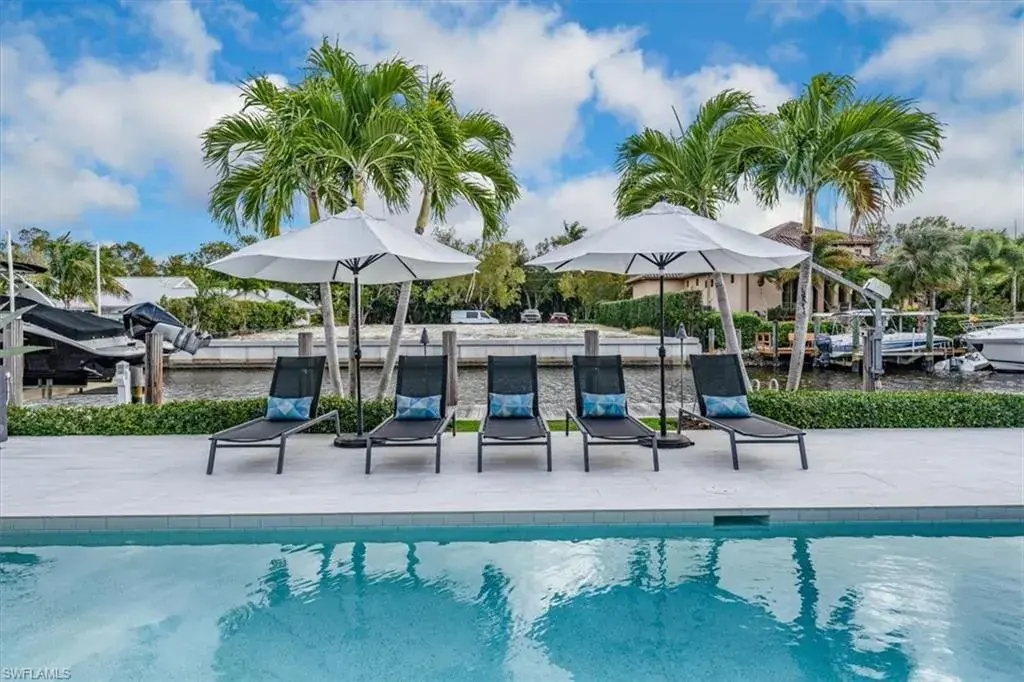 MOVE-IN READY, ENTIRELY REMODELED, WATERFRONT BEAUTY IN AQUALANE SHORES! This elevated coastal chic boaters’ paradise exudes casual elegance and benefits from a 10′ Elevation and no interior flooding from recent storms! Every detail was considered in the complete ‘back-to-the studs’ stylish, high-quality redesign and update of the interior and exterior features of this outstanding waterfront property which has been entirely reimagined from its original style and ‘lives like new construction’. Coveted Southern exposure and 100’ of waterfront, complete with boat dock, 16,000 lb boat lift and direct gulf access, plus an expansive remodeled pool and deck, outdoor bar, new circular driveway, new roof, new hurricane impact windows, and a new, never-used whole-home generator using natural gas. The home offers spacious covered lanais, perfect for relaxing, outdoor dining and entertaining. The interior upgrade list is extensive, featuring wide-plank European Oak hardwood floors, two kitchen islands, gleaming quartz countertops, a Wolf gas range, Miele appliances plus additional refrigerated drawers, and a 240 bottle temperature controlled wine wall in the elegant living room. The first-floor primary suite enjoys an attached sitting room with water views. Also on the first floor is a tranquil guest suite plus the optional 5th bedroom which can be used as an office or ‘flex’ room. The second level offers two more peaceful guest suites. The spacious air-conditioned 2-car garage provides additional storage for a 3rd car, jet-skis, paddle boards and bikes. Located in walking or biking distance to white sand beaches, sophisticated shopping and dining on 3rd St S and 5th Ave S.