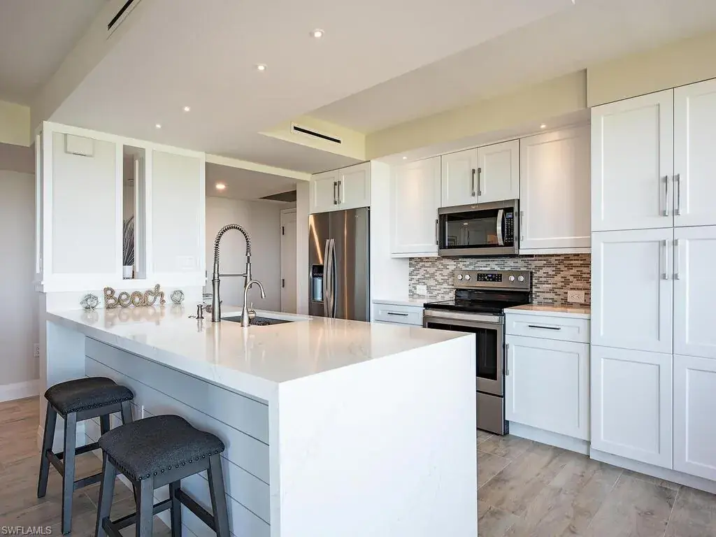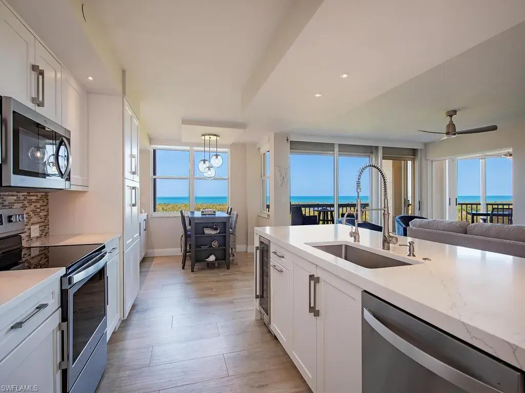Experience the pinnacle of coastal living at the esteemed St. Kitts at Pelican Bay. This completely remodeled residence presents a unique opportunity to enjoy the epitome of waterfront living, boasting breathtaking panoramic views of the Gulf of Mexico and the beautiful preserve from the 8th floor. As you enter, you’re welcomed by an ambiance of refinement and grace, with a generously proportioned open floor plan seamlessly connecting each room. This home features 2 bedrooms, 2 bathrooms and den, and underwent a comprehensive remodel in 2023 including the installation an enclosed sitting area off the master suite, waterfall quartz countertops, all porcelain tile flooring, re-engineering of living space, built-ins, in-unit washer and dryer, and a luxurious master suite complete with dual sinks, a walk-in closet, and a walk-in shower. Delight in nightly sunsets from your expansive western-facing terrace. Additionally, one covered carport space is included. St. Kitts resides in the heart of Pelican Bay, with easy access to both the Marker 36 and Commons tram stations. Residents enjoy privileges such as access to two beach clubs along 3 miles of pristine white sand beach with chair and umbrella service, restaurants, 18 tennis courts, a community center, tram service through the preserve and a world class pickleball center coming soon. St. Kitts amenities include multiple social areas, fitness center, Olympic sized pool and jacuzzi and BBQ area. The building is currently being refreshed with exterior paint and all tiled hallways.