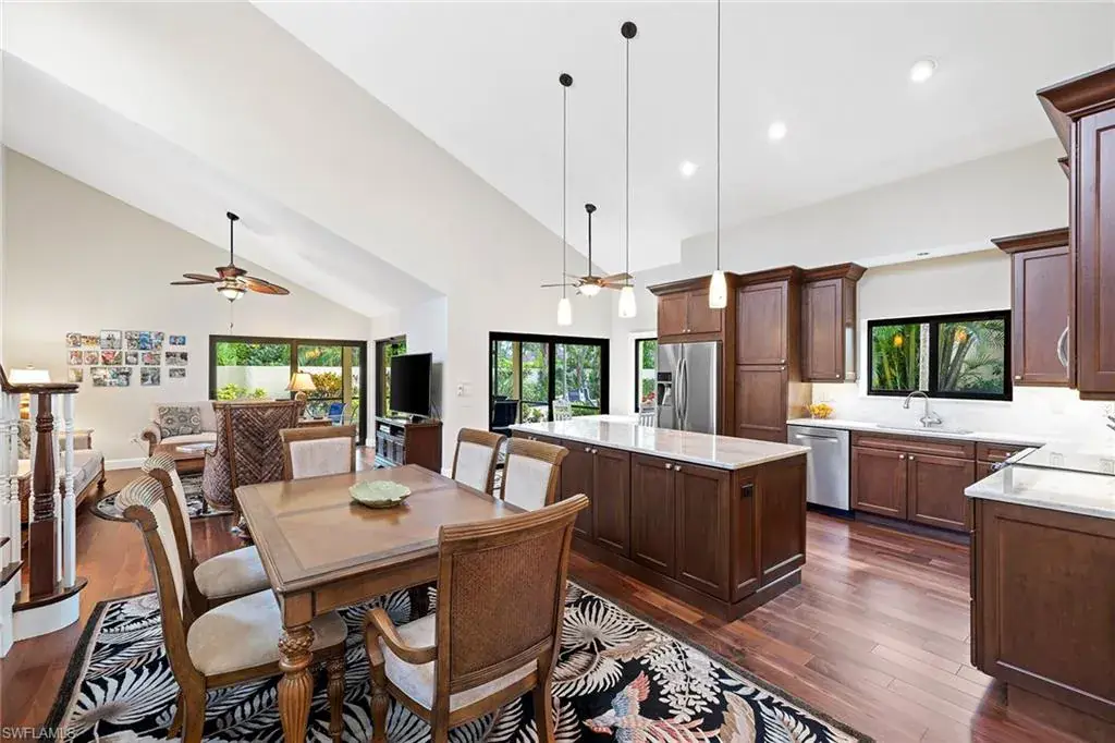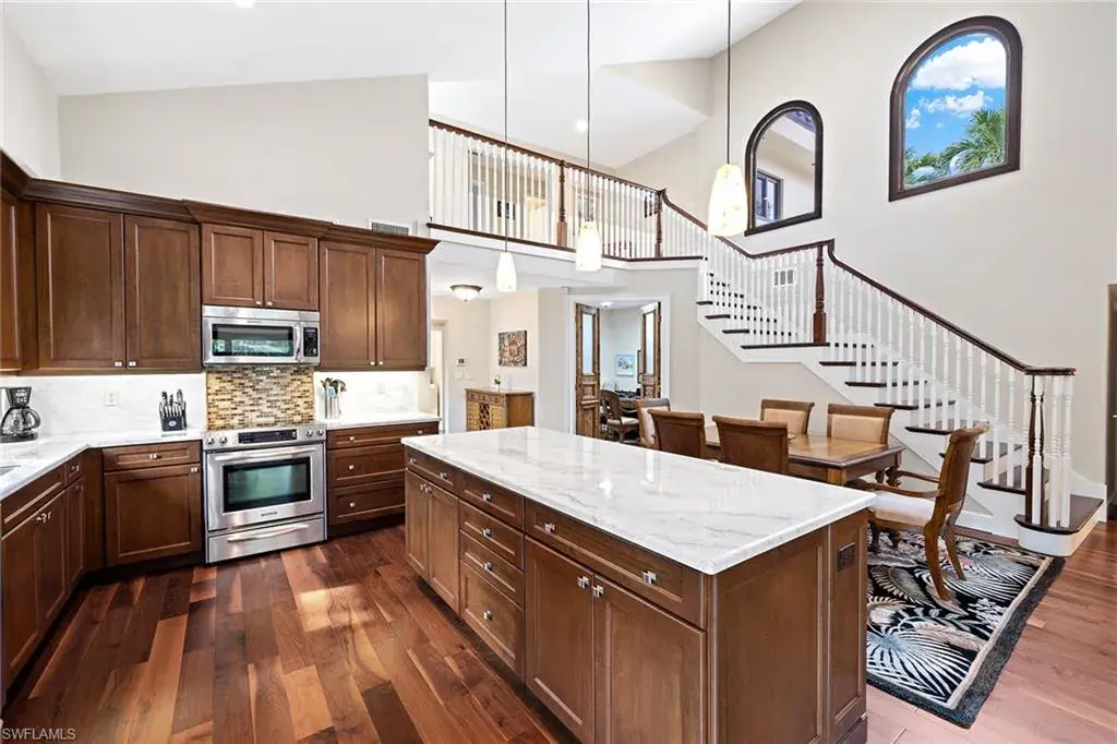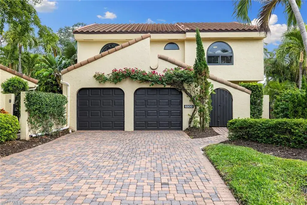 A soaring ceiling and multitude of windows illuminate this spacious tropical villa in the Sand Pointe neighborhood of Pelican Bay. This former model sits on one of the largest sites on the cul-de-sac. Beautiful interior features include hardwood flooring in the main living areas, stainless steel appliances, custom wood cabinetry and quartzite countertops. The main floor primary suite is completely private from the second-floor guest suites, each with their own bath. This peaceful setting not only offers a very large tropical garden and pool, it also has a large screened lanai for a seamless indoor-outdoor Florida lifestyle. Newer roof (2018), hurricane-impact sliding doors and windows and landscape lighting are just a few of the special features. Pelican Bay property owners enjoy exclusive amenities such as two private beach pavilions (only the South beach is currently open), full-service fitness center, professionally staffed tennis facilities and more. Excellent schools and location close to Waterside Shops and Mercato. This property sits in an X-flood zone and had no flooding or known damage from Hurricane Ian.