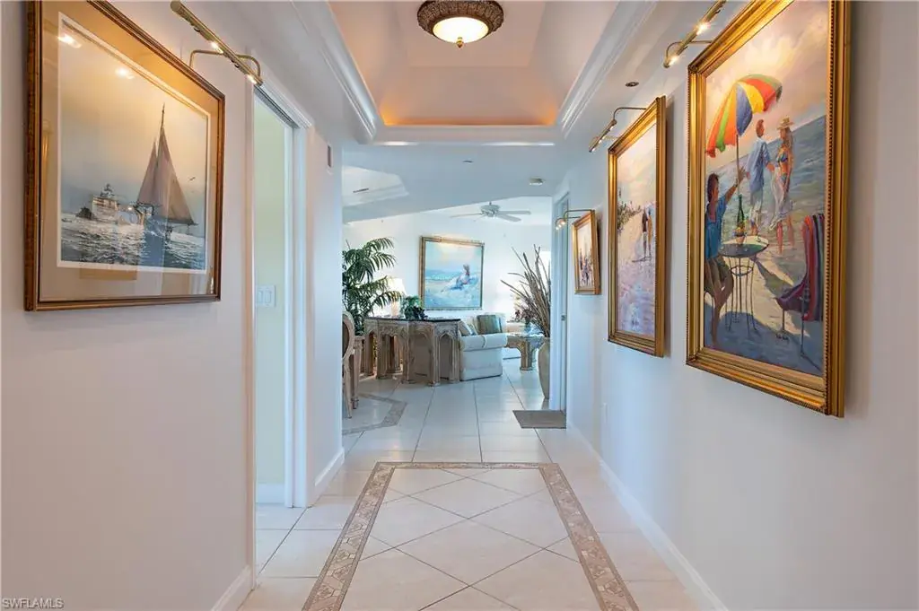 This 3-bedroom, 3-bath 10th floor luxury tower residence with 9′ ceilings has fabulous views of the Gulf of Mexico to the west and Club Pelican Bay golf course to the east. It has 2,000 sq.ft. under air (total of 2,256). The floor plan has been modified to take advantage of the views and natural light throughout the day, dawn to dusk. In addition to the impact resistant glass on all windows and sliders, electric hurricane shutters were installed on lanai for additional security and convenience. Outdoor furniture can remain on the lanai throughout the year. The amenities of St Raphael are extraordinary: An incredible 40′ X 80′ salt water pool, two Har-Tru tennis courts, state-of-the art fitness/health club on lobby level, grand areas for entertaining, and four guest suites for overflow guests. Tram station # 6 and the intersection of the berm and the boardwalk to the north beach club are just steps from St Raphael. The boardwalk to Marker 36 restaurant on the beach is just 1/3 of a mile. (Walk to the beach in 6 to 8 minutes or take a 2-minute tram ride.) Pelican Bay homeowners enjoy the incomparable lifestyle of Pelican Bay with unrivaled access to a wide range of amenities.