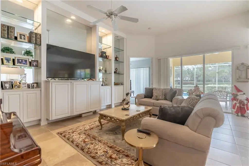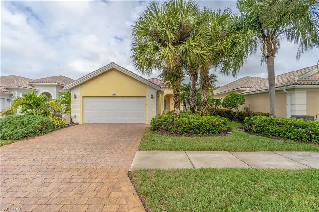 Just listed is this three bedrooms/two bath with den, original DiVosta built, poured concrete, Oakmont single family home located in the gated community of VeronaWalk. A covered, tiled entry leads to the glass front door. The split bedroom, open concept floorplan is perfect for entertaining guests. This home is a neutral canvas with carpet/tile floors and volume ceilings. A central kitchen adjoins the dining area and lounging space. The carpeted primary bedroom has a hall of closets leading to the ensuite bath with dual entry shower, jetted, soaking tub, two vanities each with their own sink and a make-up counter. A full laundry with storage and sink is located off the spacious two car garage. The back bank of sliding doors leads to a covered lanai opening into your screen enclosed cage with inviting pool. This is a one-of-a-kind lot with a quiet waterway, but no houses behind you. At its center the community has a cafe, ice cream parlor, hair salon, gas station and post office. A resort pool, pickleball, a fitness center, miles of walking trails and much more are available for your enjoyment. Verona Walk is SW Florida living at its best.