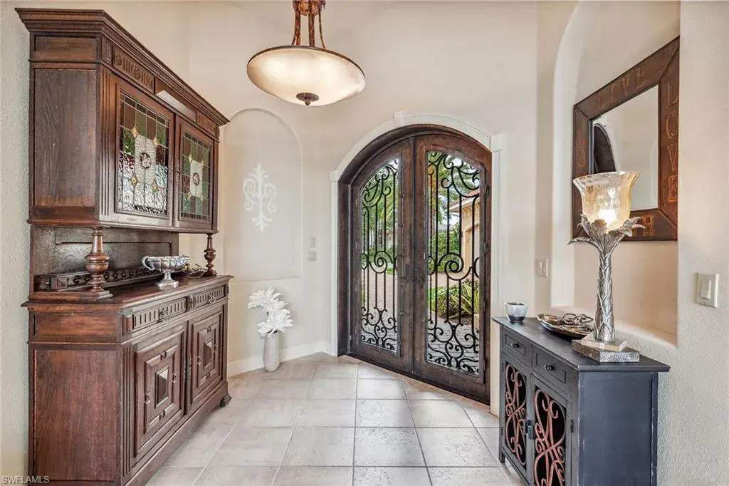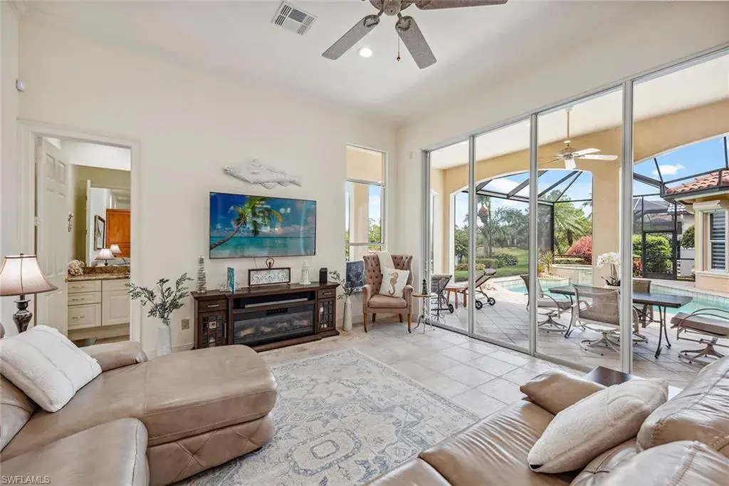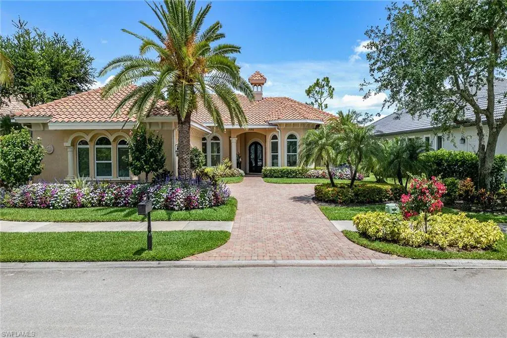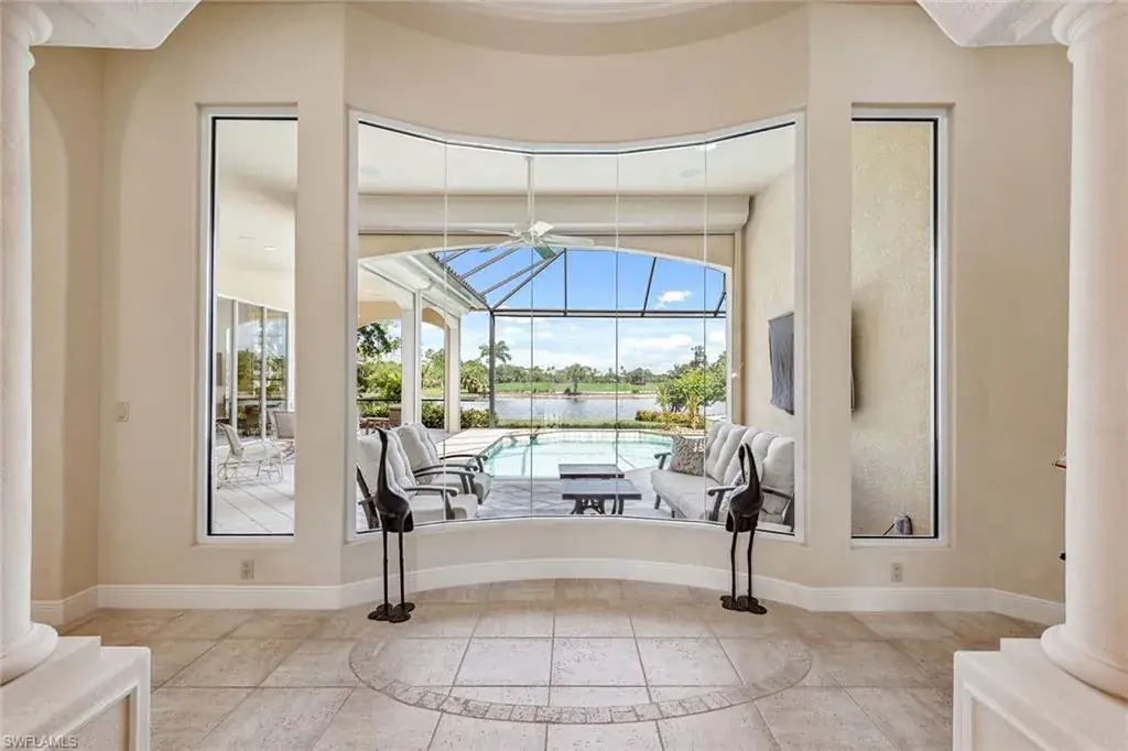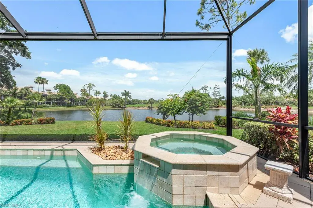 Discover breathtaking expansive golf course and lake views from this meticulously designed high-quality custom home, boasting a prime position overlooking both the 13th and the 14th hole of the pristine Rookery golf course, showcasing sunrise views. This elegant residence, located in highly sought-after Mulberry Row in Fiddler’s Creek, features three spacious bedrooms, a study, three and a half baths, and an open floor plan. The dramatic foyer greets you with a wow view from the moment you enter the home. The home impresses with recessed lighting, crown molding, plantation shutters, tray and volume ceilings, tile floors, mitered glass windows, tile roof (new in 2018), wide paver driveway, two-car garage with a smart garage door opener allowing remote opening and delivery access, lush landscaping, custom mirrors, tankless hot water heater (new in 2021), glass sliders and French doors, electric hurricane shutters and impact glass. The expansive lanai with picture screen enclosure creates a blend of indoor and outdoor living, enhanced by a large covered outdoor space, a gas-heated pool with a waterfall spa and pool bath, all set against the serene lake and golf vistas. The open kitchen is equipped with quality cabinetry, under-cabinet lighting, granite counters, stone backsplash, a breakfast bar, a pantry, high-end stainless appliances, a six-burner gas cooktop, wall oven, wine and beverage refrigerator, and an eat-in area with beautiful views of the pool and beyond. The study is a standout feature with its large bay windows and French doors, beautiful ceilings, and wood flooring, creating a bright and inviting space ideal for a home office or study. The owner’s suite is a private haven with a view of the pool and water, featuring a tray ceiling, French doors to the lanai, two walk-in closets, and an en-suite bath with granite countertops, dual vanities with makeup counter, a walk-in shower, a separate soaker tub, and a linen closet. Guest bedrooms are thoughtfully designed for privacy and comfort, each with natural light, en-suite baths with granite vanities, and ample closet space. The laundry room enhances functionality with white cabinets, granite countertops, a utility sink, a drying rack, and high-quality LG appliances. Fiddler’s Creek residents have exclusive access to award-winning luxurious amenities that include a resort-style pool, spa services, casual and fine dining, a fitness center with trainers and classes, and tennis, pickleball, bocce, and an extensive activity and event calendar with something for everyone. Optional golf, beach, and marina memberships are available. Immediate golf membership opportunities with a brand-new golf clubhouse and newly renovated golf course (2024). Conveniently located between downtown Naples and the pristine beaches of Marco Island close to everything to enjoy in Southwest Florida, including shopping, dining, executive airport, museums, parks, kayaking, paddleboarding and more.