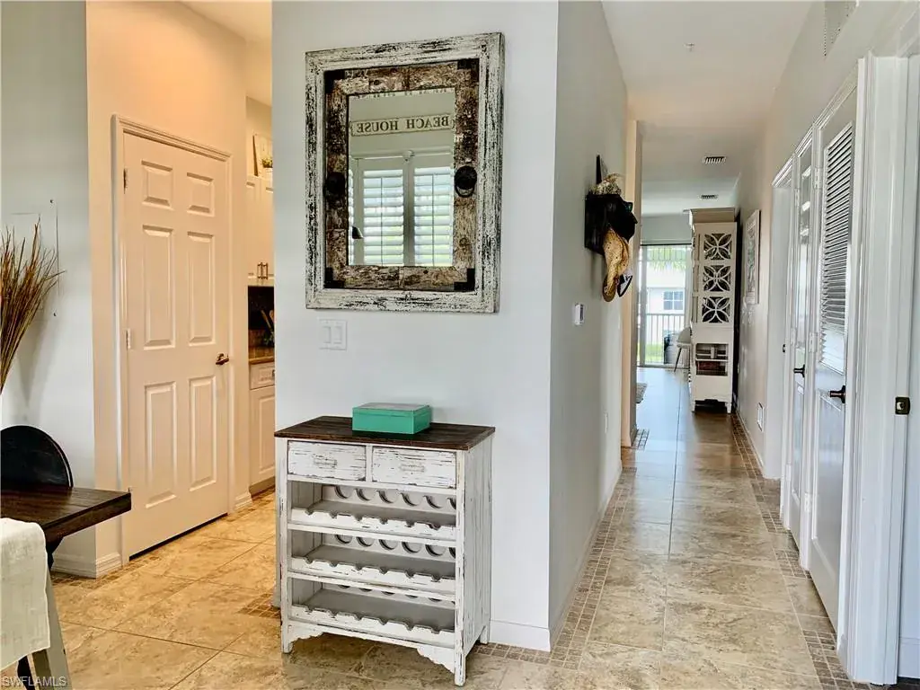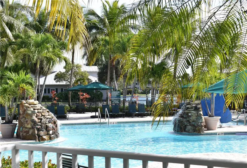 Rare 3 bedroom end unit with immediate golf membership!! Enjoy 42 rounds of golf, unlimited practice facilities and difficult to get preferred tee times on the championship designed Flamingo Golf Course and the resort style Mustang Golf Course. Greenlinks offers unique rental opportunity to rent nightly, weekly, monthly or seasonally. The ability to transfer your golf rounds to guests off season, offers investors the opportunity to put together enticing golf packages for renters from May 15-October 15. This turnkey villa is in a prime location next to the pool, clubhouse and amenities with a beautiful view of the lake and fountains. Having no building next to the property offers sunny views from every room. This villa has been owner occupied and meticulously maintained. Updates include tile floors throughout, SS appliances, custom plantation shutters on all windows, updated baths with frameless shower doors, shiplap and built in bench seating in dining area, built-in cabinetry in middle bedroom currently used as den/office with sleeper sofa, shiplap wall in living room and under bar and upgraded fans & lighting throughout. Both primary and front guest bedrooms have king size beds with pullout storage and ensuite baths. Recent maintenance within the Greenlinks community includes new roofs, fresh paint on buildings, lanais, walkways and railings. Landscaping has been refreshed and irrigation system upgraded throughout the community. ASSESSMENT HAS BEEN PAID IN FULL!! Come enjoy the resort style amenities including tennis, pickleball, shuffleboard, bocce, exercise room, clubhouse, pool and spa. Greenlinks is centrally located in Lely Resort next to Sam Sneads restaurant in the Flamingo/Mustang clubhouse and around the corner from The Players Club and Spa & The Classics Golf Club both of which offer optional membership.