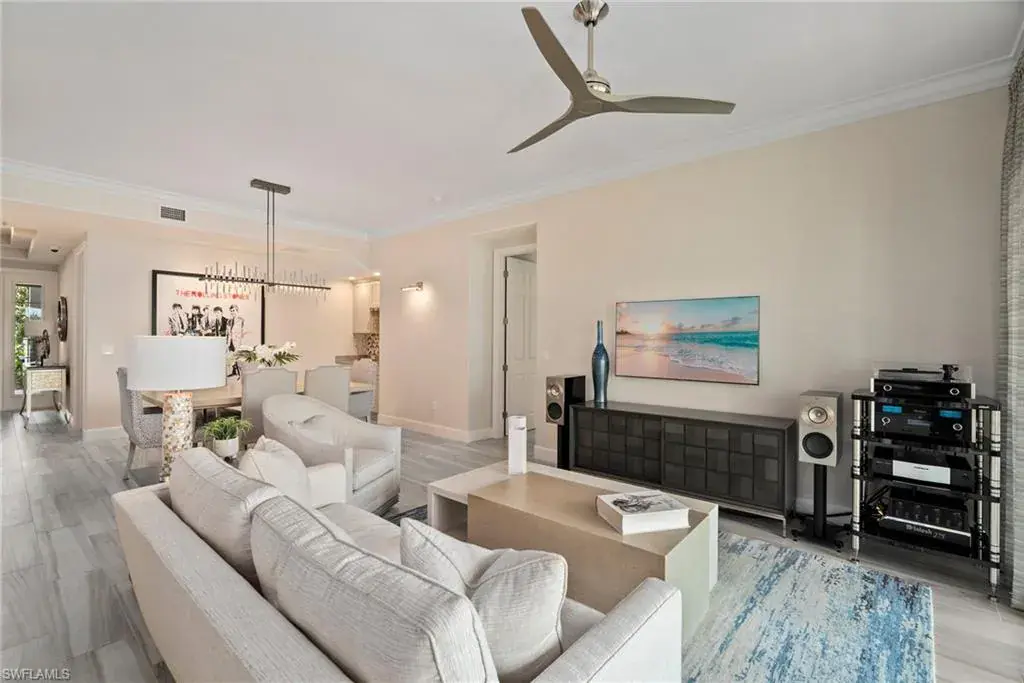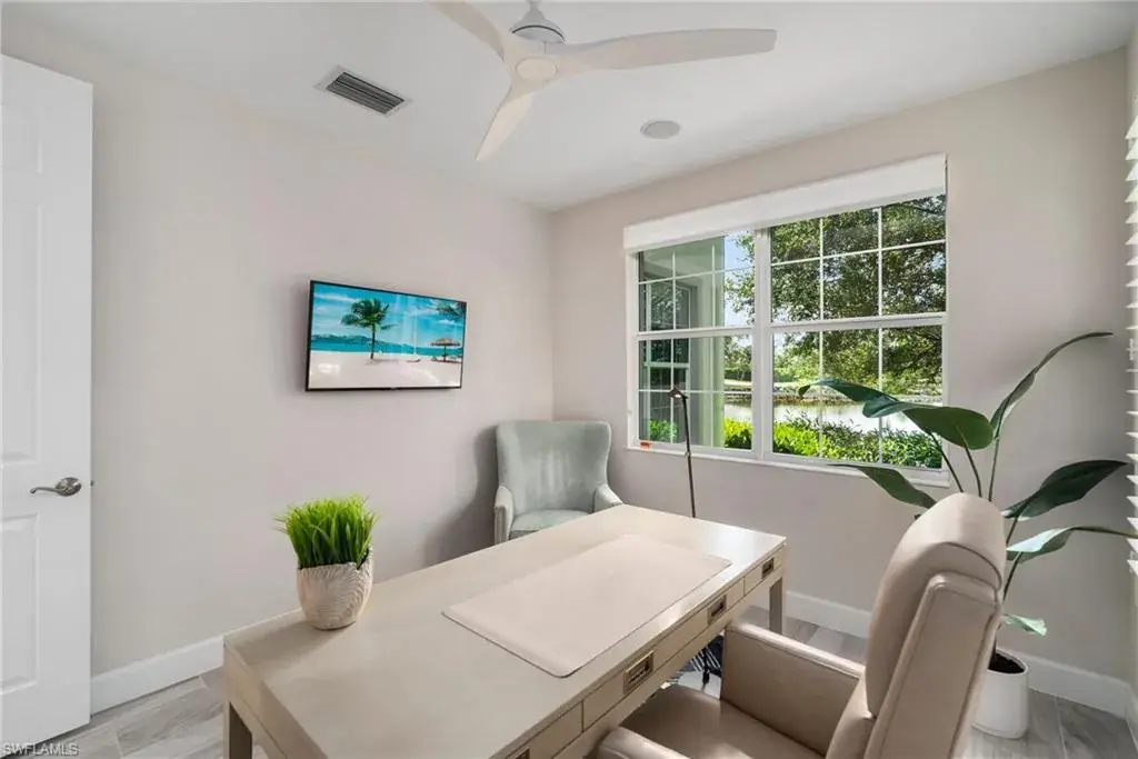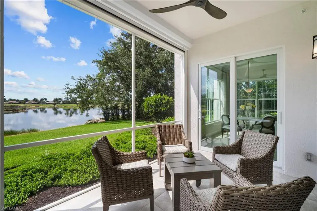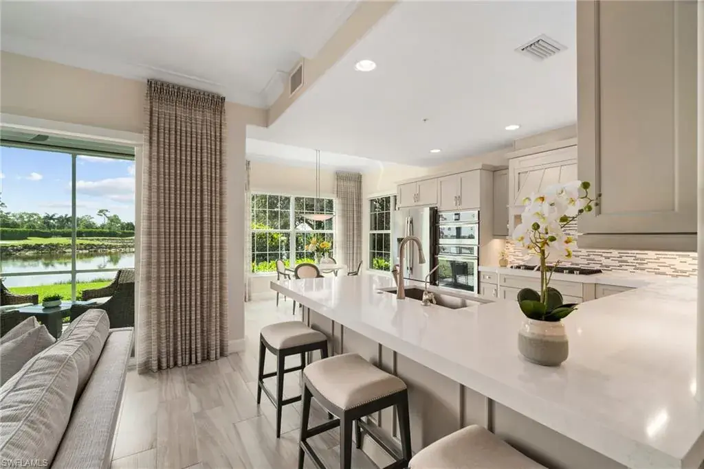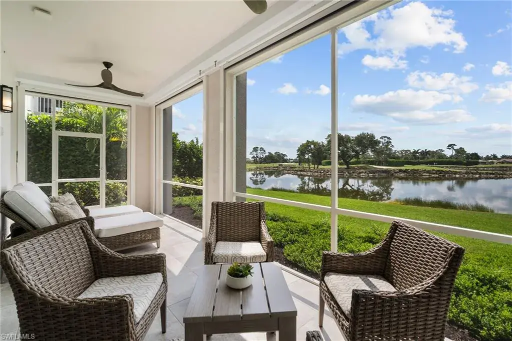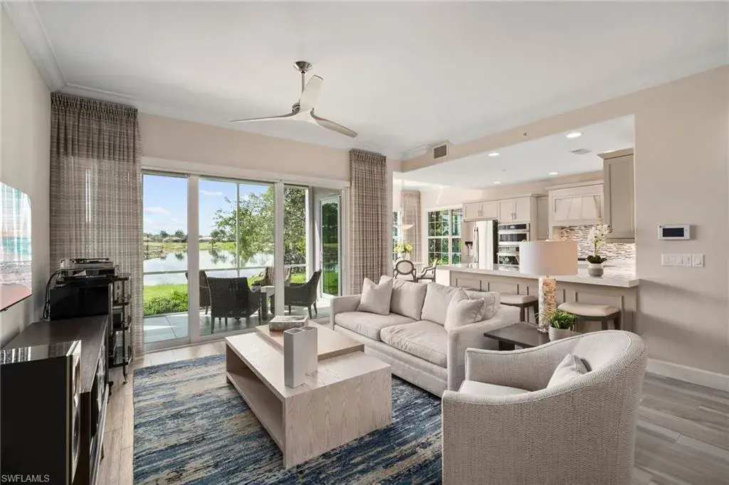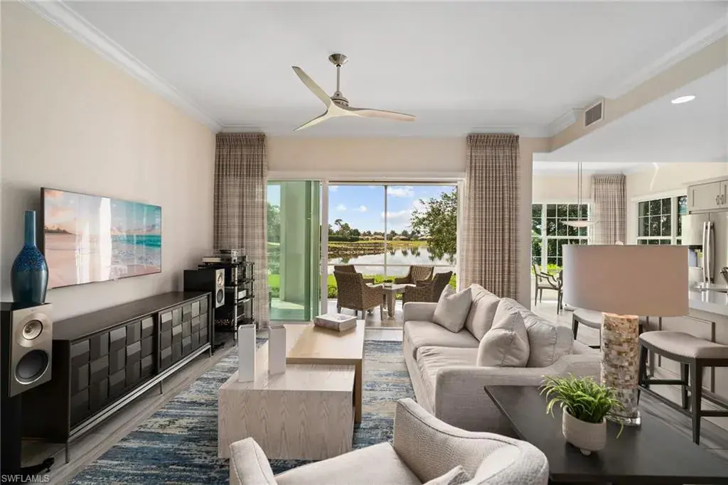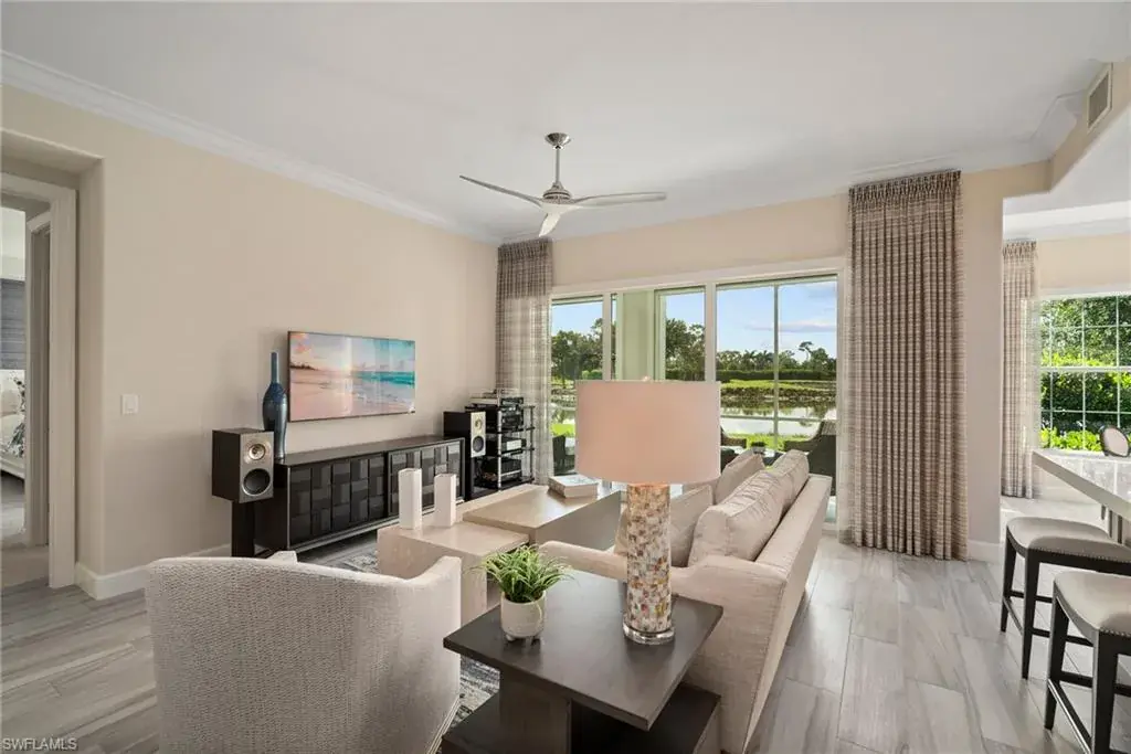 COVETED AND FIRST TIME AVAILABLE, LONG LAKE AND GOLF COURSE SIGNATURE CLUB LOCATION!! Stunning Norris high end FURNISHED first floor coach home with panoramic views! Meticulously maintained and move in ready! Beautiful light grey kitchen cabinets with upgraded SS Jenn Air natural gas appliances to include a warming drawer, gorgeous tile backsplash, one level 2″ thick quartz countertops, Under Cabinet Kitchen Electric Outlets, custom power blinds as window treatments, custom closets, upgraded grey plank tile floors throughout living area including den with carpet in primary and guest bedroom, Smart Home control of HVAC, Garage & Front Door Lock, Lighting, Shades, Advanced 10-camera Security System with central station monitoring, Sonos Ceiling Speaker Systems, In-duct UV air purifier, Extensive Garage Cabinets, Finished Garage Attic with lighting, flooring and pulldown stair entry, Culligan Water Filter – Kitchen/Icemaker & Whole Home Water Softener, convenient bar in dining room with glass front cabinets and a long open entry foyer! Enjoy the luxury of STORM SMART electric hurricane screens on lanai to enjoy all year long! The Signature club offers a private entrance into The Players Club! Enjoy all the amenities with immediate membership to The Players Club and Spa, 2 resort pools, lap pool, tiki bar, fitness facility, full service spa, fine dining, movie theatre, billiards room, pickle ball, tennis and bocce! The Classics private golf is optional at Lely Resort but there are 2 public golf courses to enjoy! This IS where you want to live!!